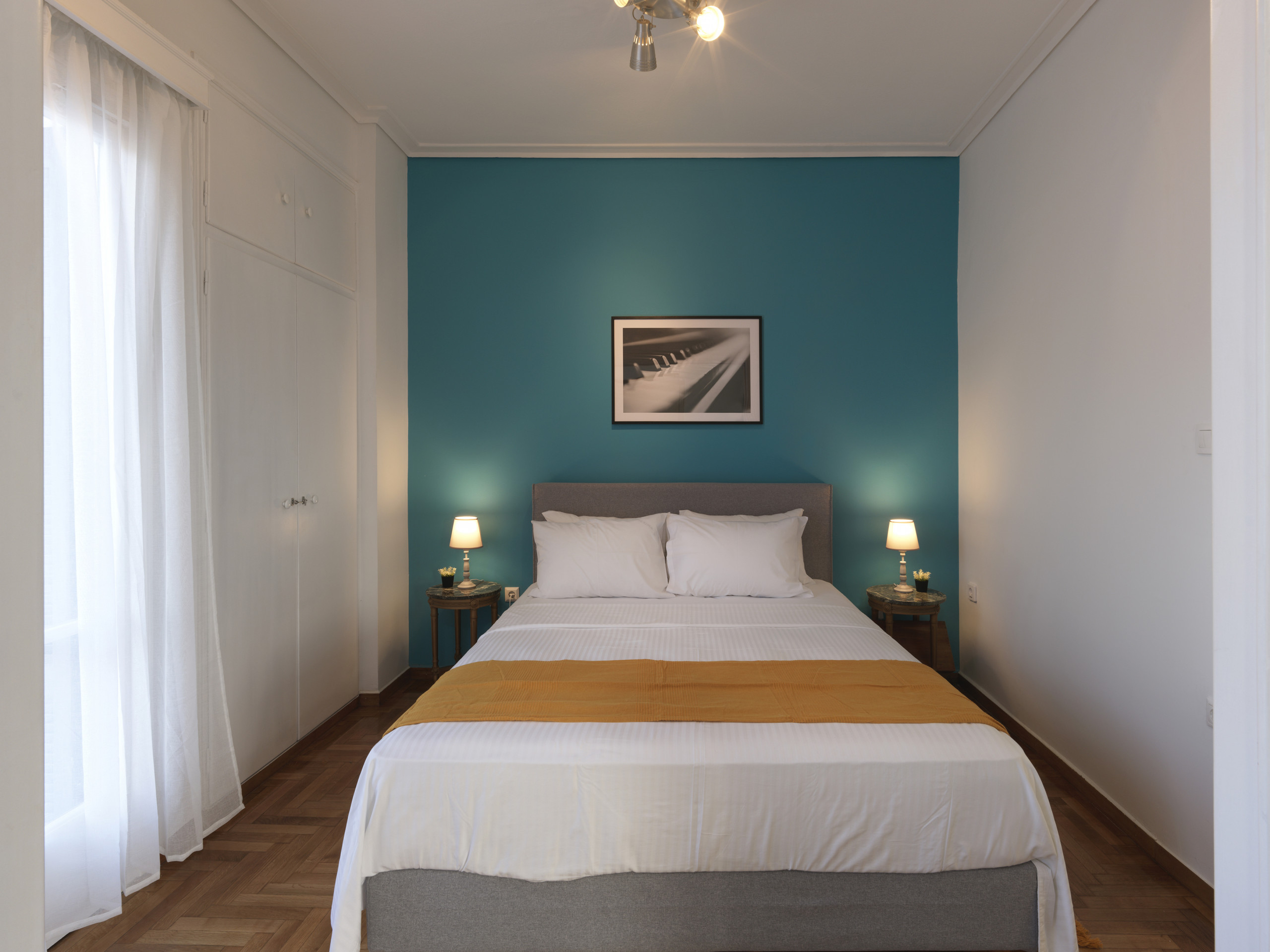 Experience comfort and style in our one-bedroom apartment. Step into a serene oasis where turquoise-painted walls evoke visions of exotic shores and tranquil seas. The bedroom is your personal escape, a symphony of relaxation inspired by distant places.