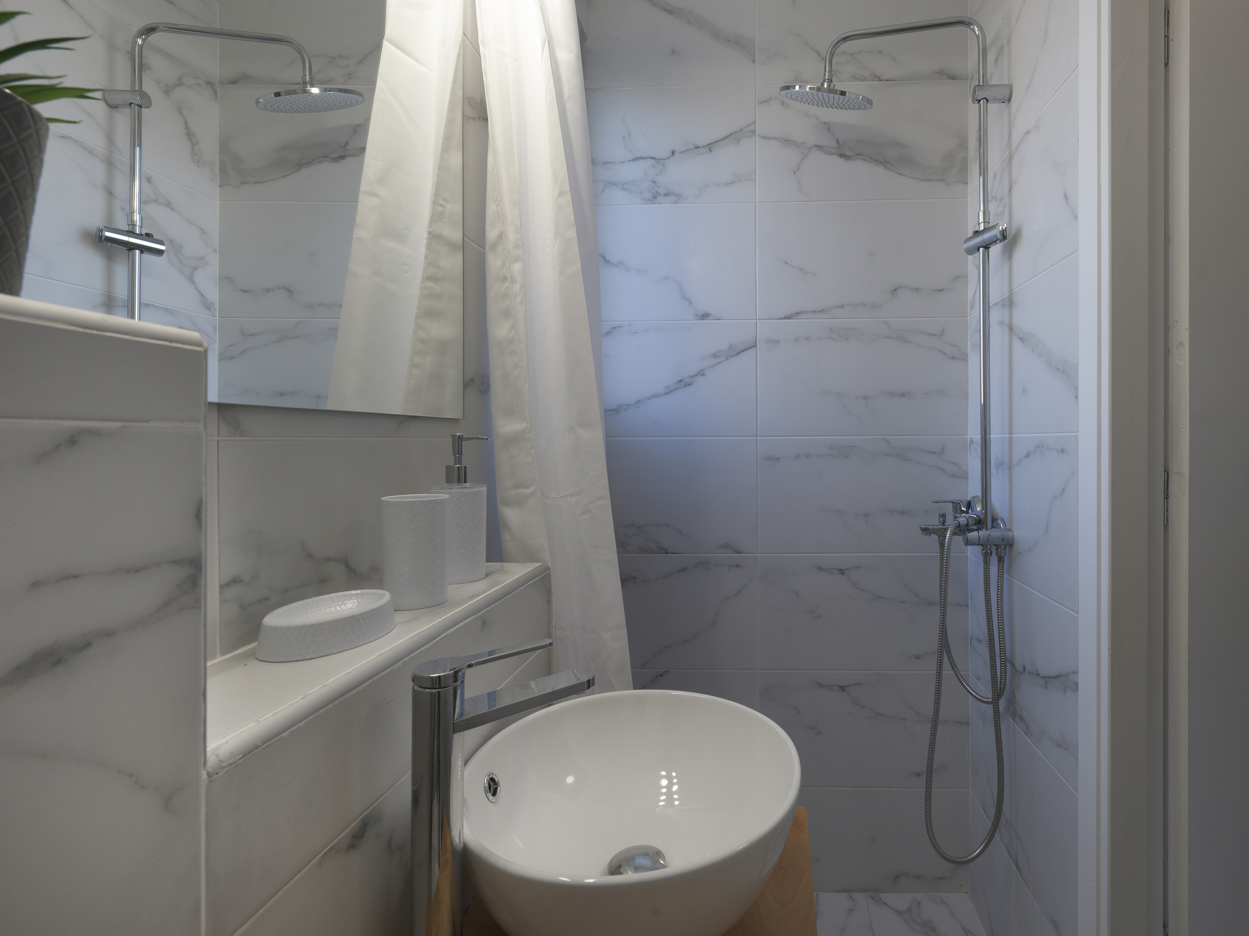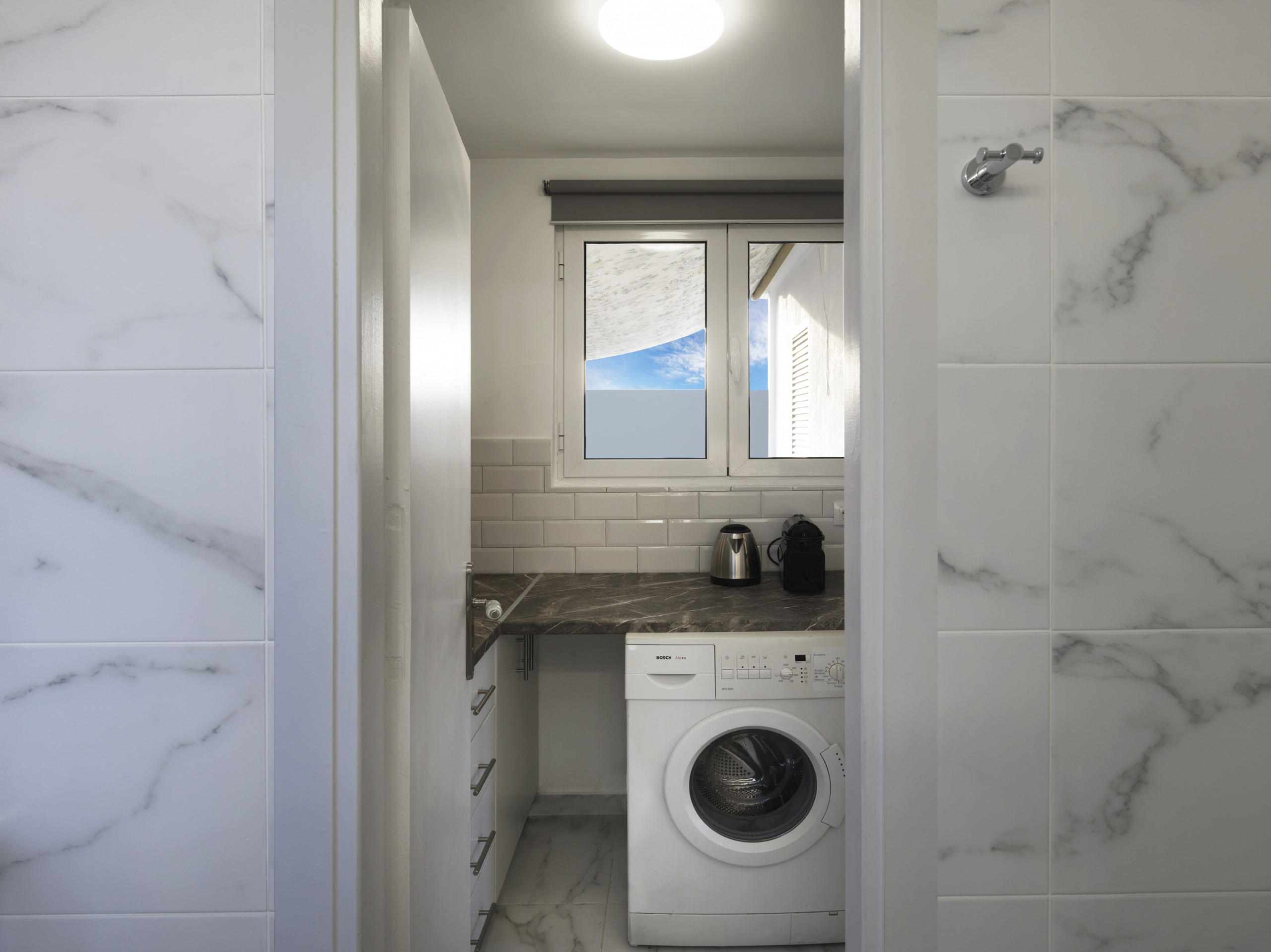 Our fully equipped kitchen awaits your culinary creativity, offering all the essentials for your gourmet endeavors. Immerse yourself in the sleek elegance of the shiny marble white bathroom, a sanctuary for rejuvenation and pampering.