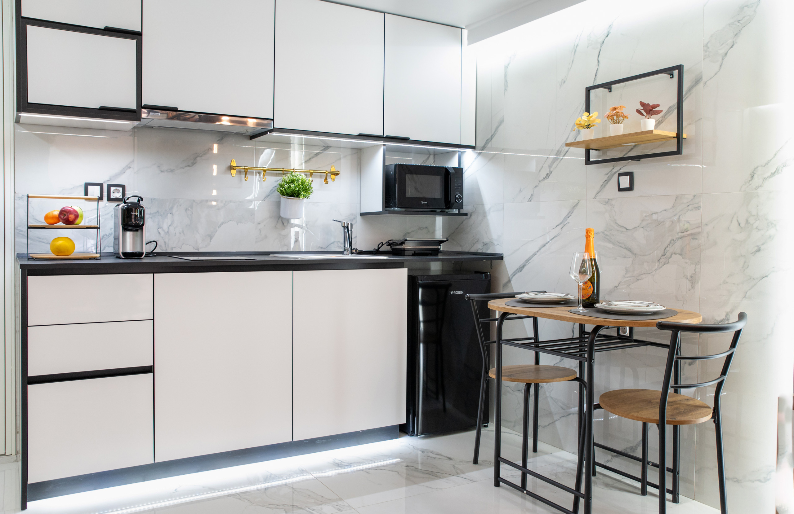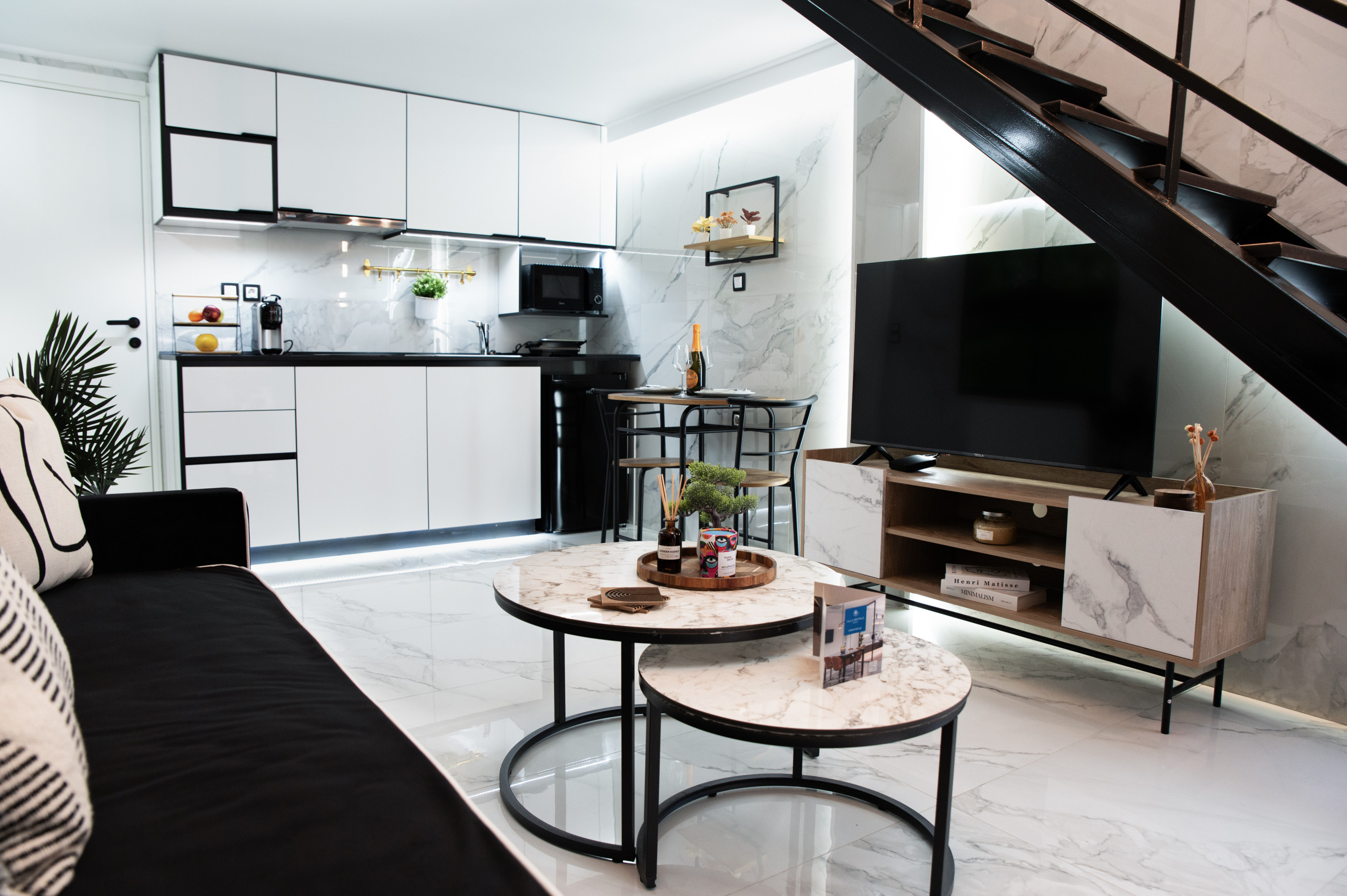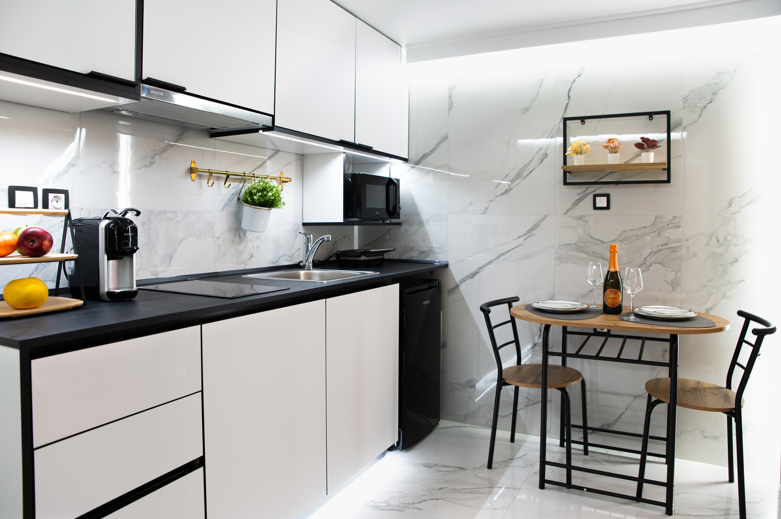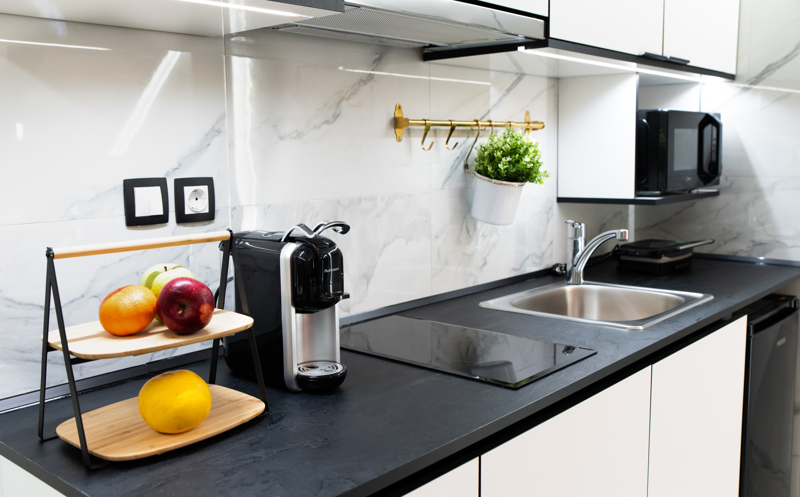 Our apartment can sleep up to four people. There is a chic double bedroom, a comfortable-sized living room with a dining table and a sofa bed, a kitchenette, and a bathroom.