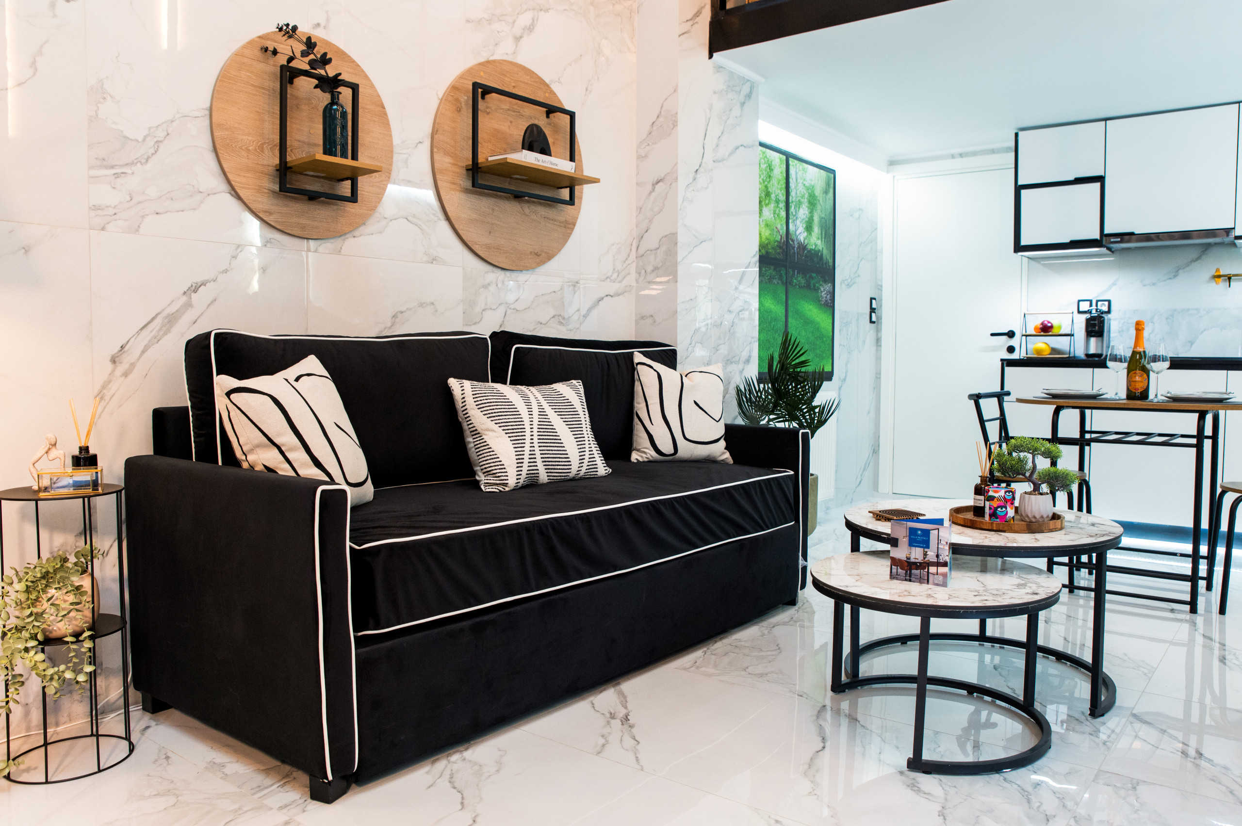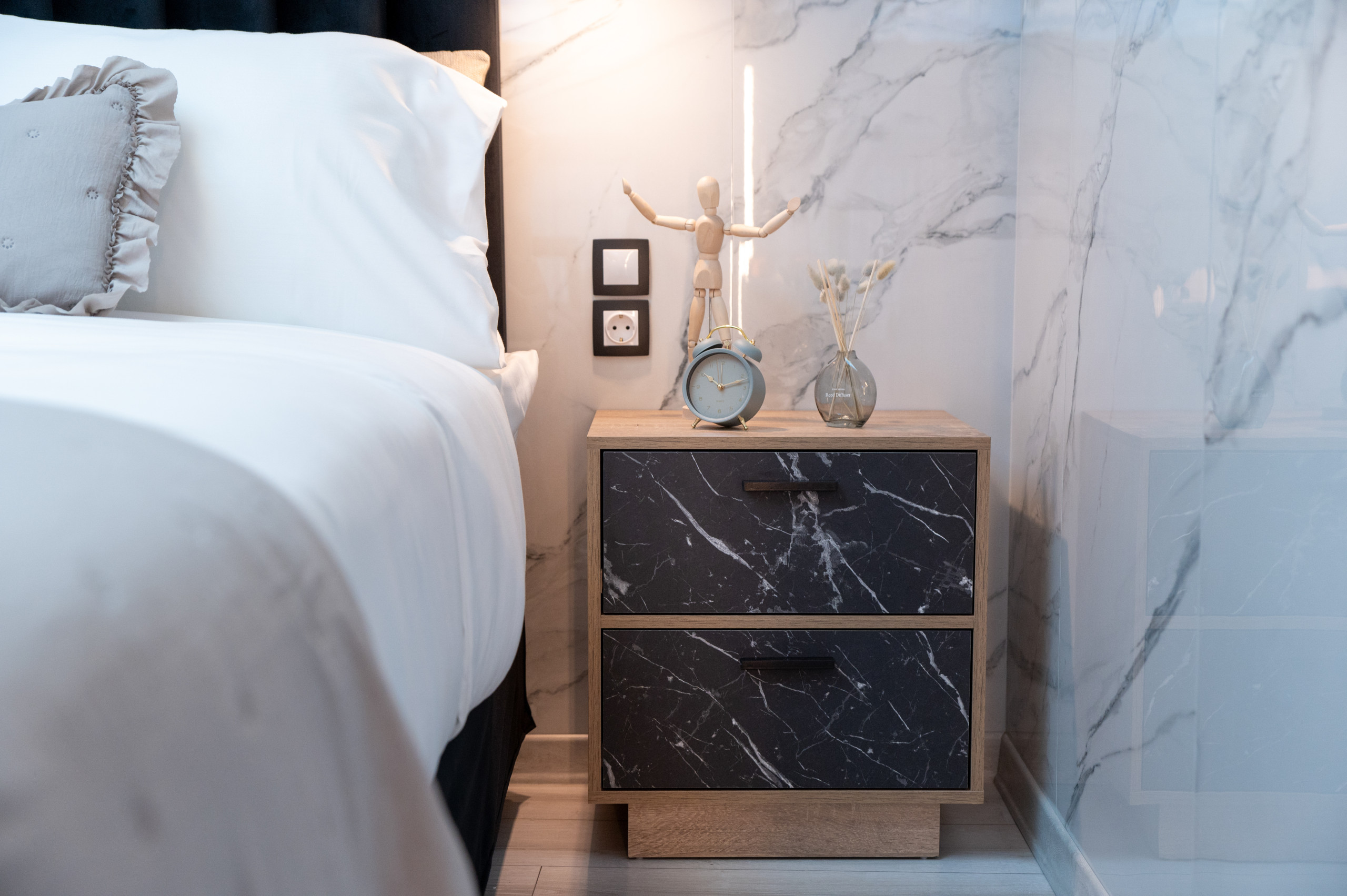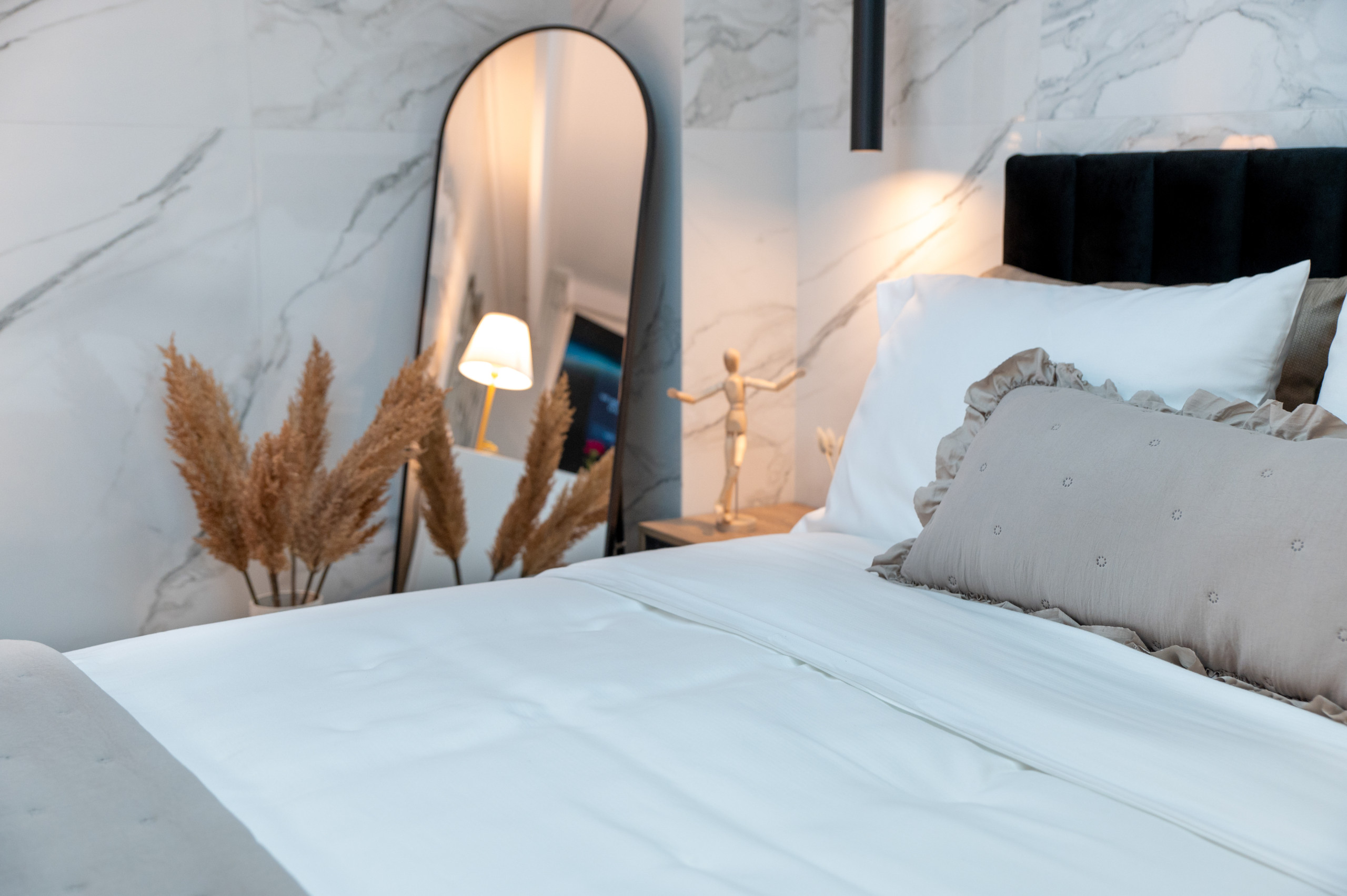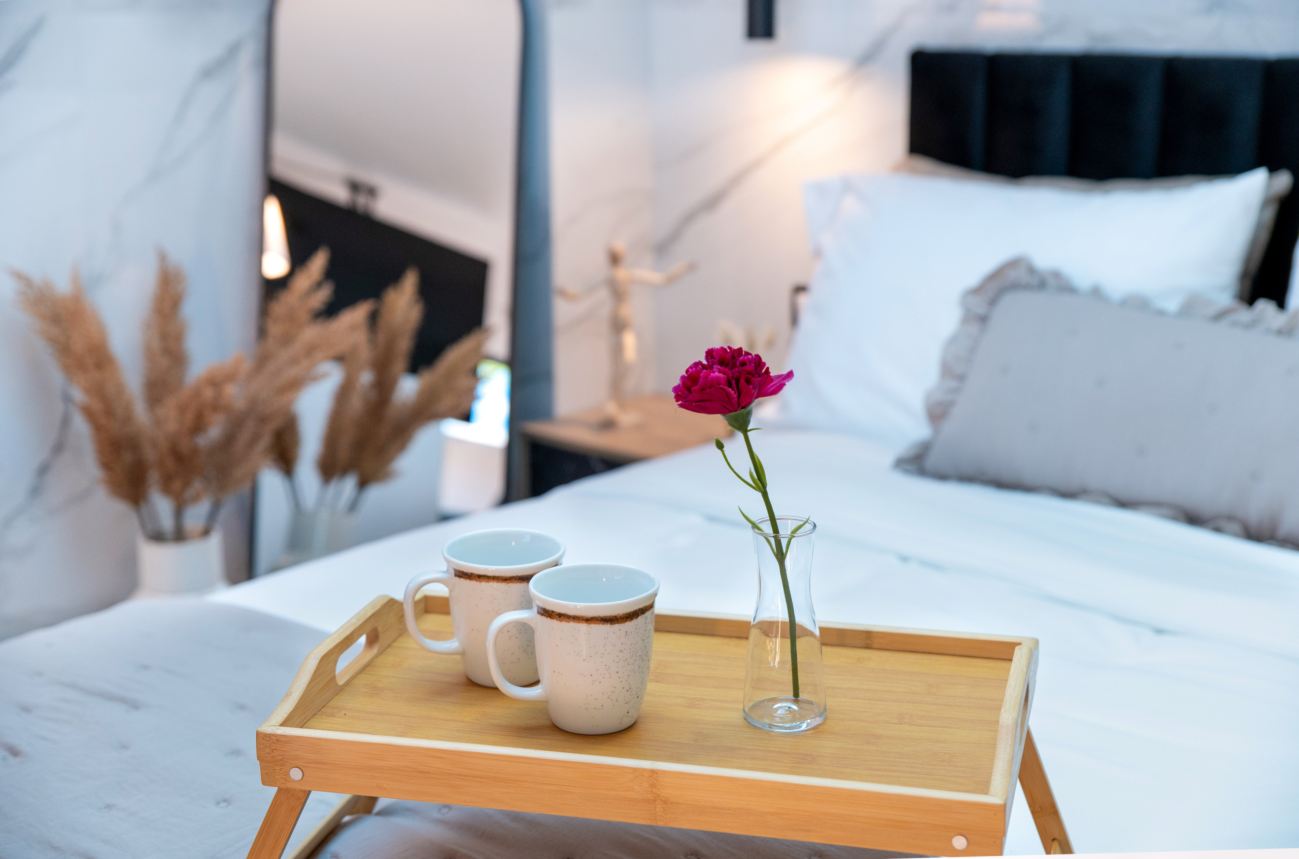 Our apartment can sleep up to four people. There is a chic double bedroom, a comfortable-sized living room with a dining table and a sofa bed, a kitchenette, and a bathroom.
