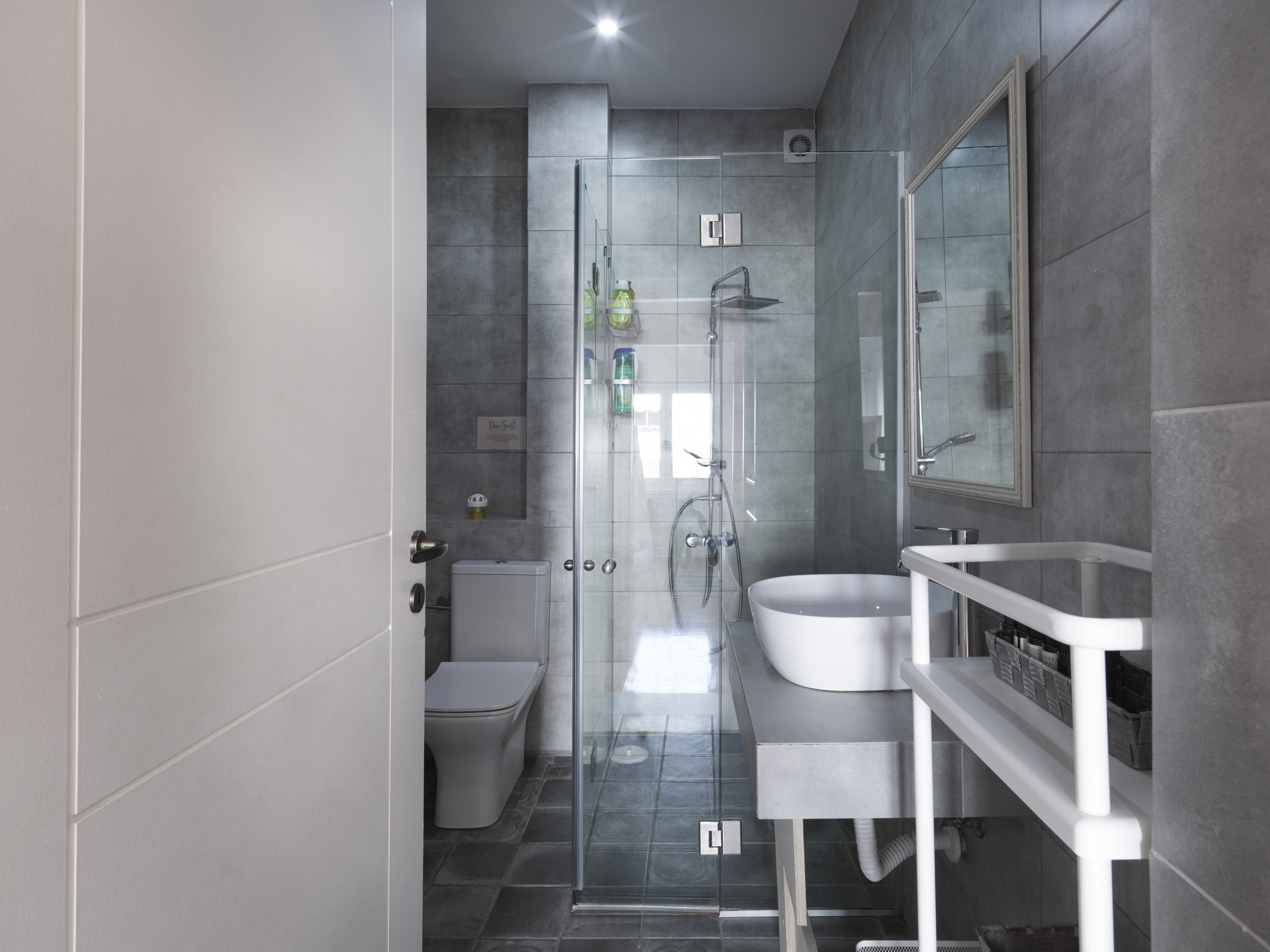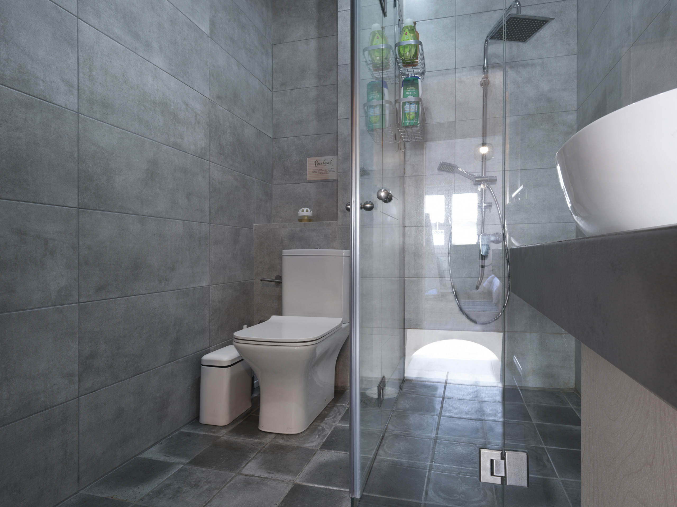 The bathroom is a modern space featuring high-quality fixtures, a walk-in shower, and elegant tiling. Despite its size, it offers all the necessities for daily living, ensuring convenience and comfort.