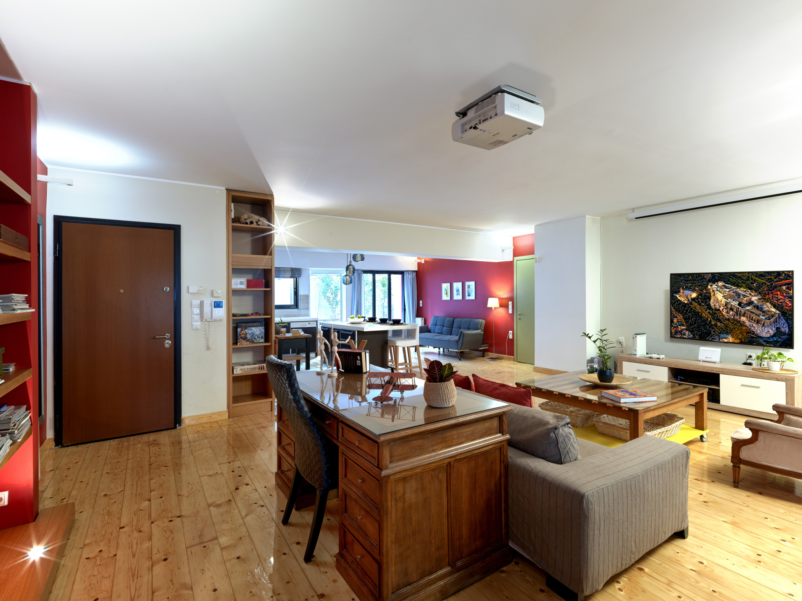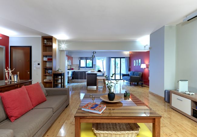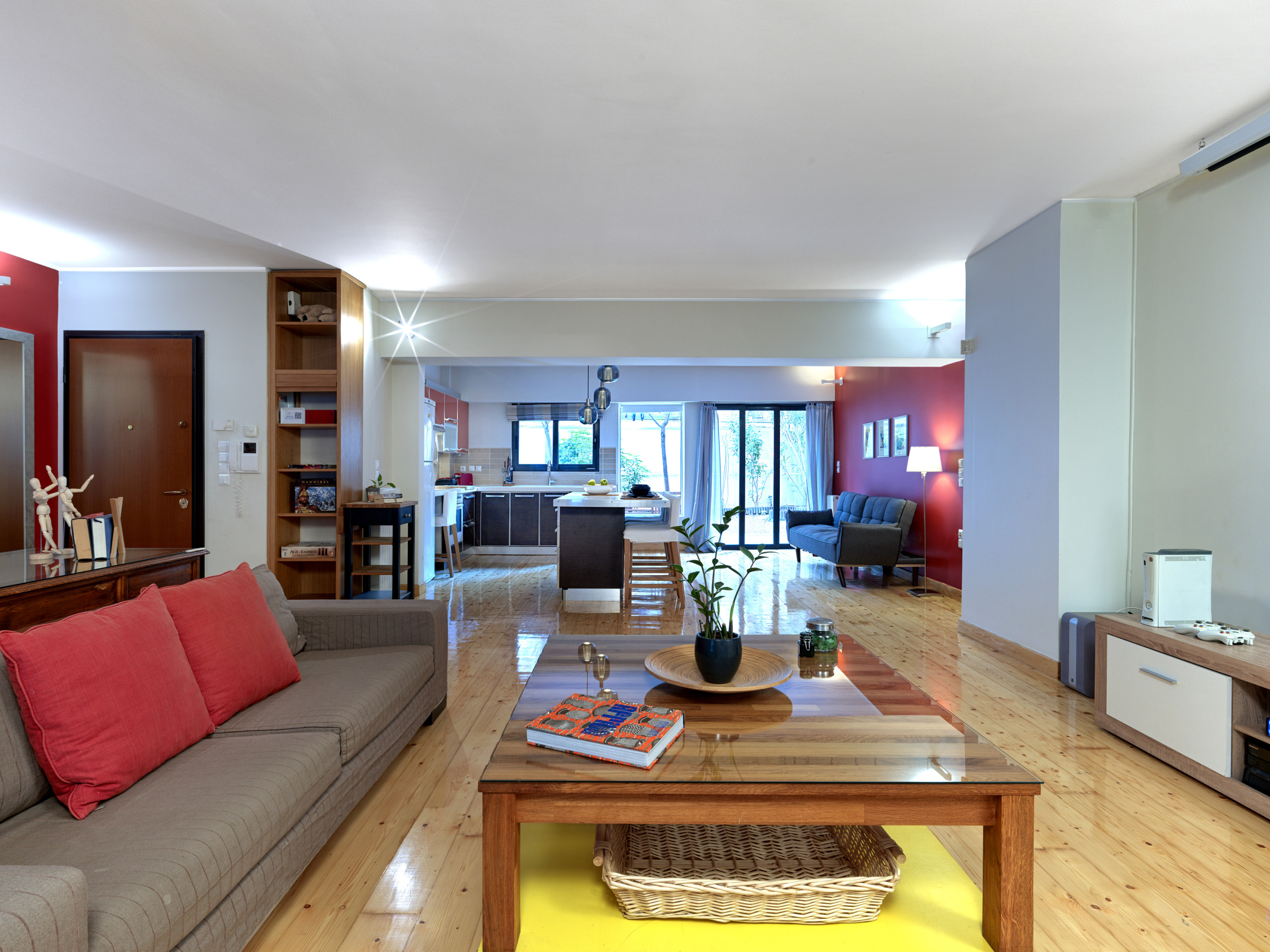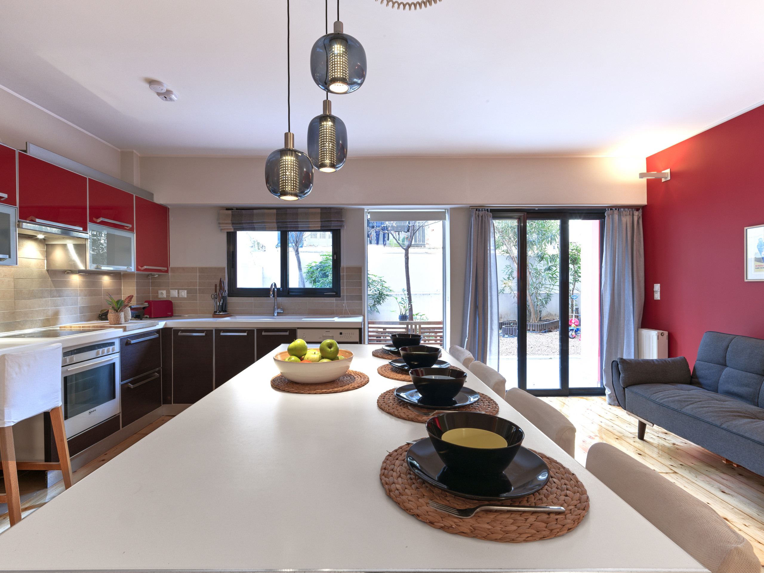 A beautiful modern apartment in Koukaki, just around the corner from Acropolis. It has two bedrooms, the one with an en suite shower, a large living room, a lovely kitchen, a bath, a back garden and a front yard and can sleep up to 5 people, preferably 4 adults and 1 child. We can also accommodate a baby in a baby coat.Baby equipment can also be provided to our guests.