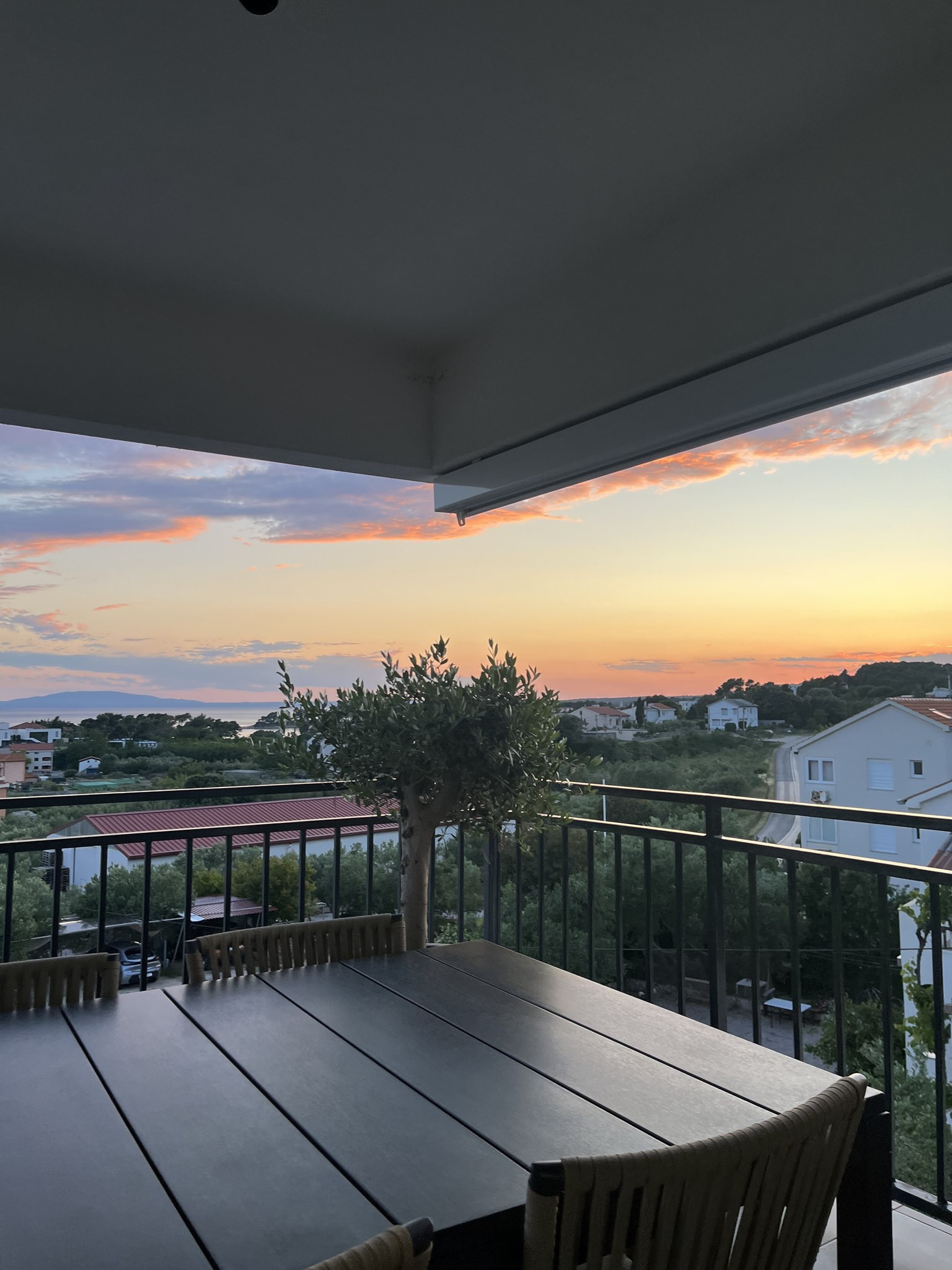 A spacious balcony with a wonderful sea view is perfect for enjoying your morning coffe in shade, or simply resting and reading a book while enjoying the refreshing summer breeze.