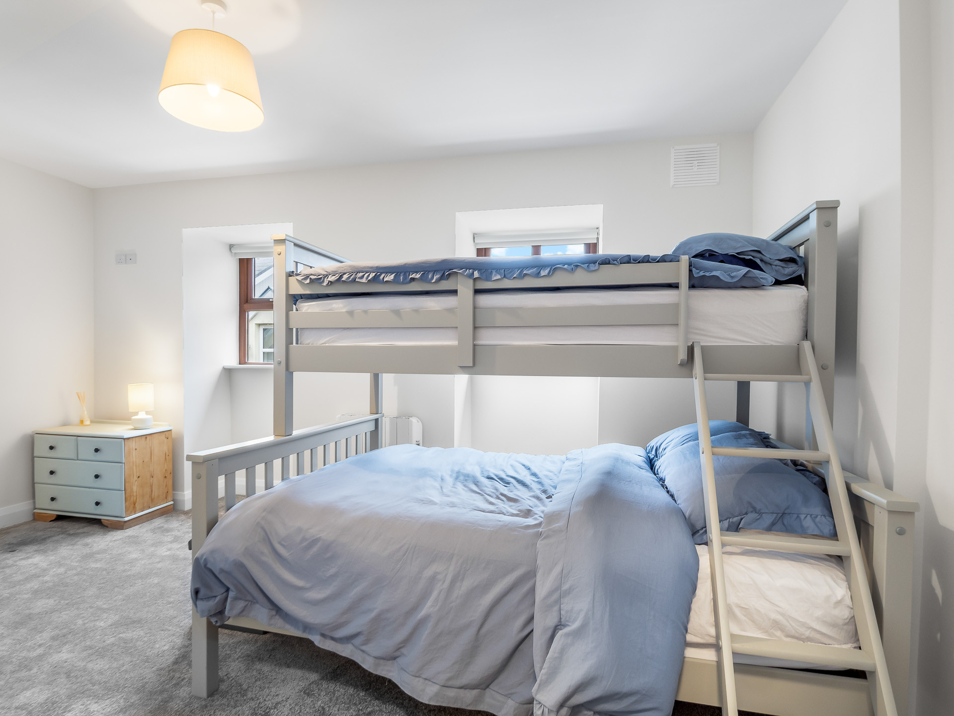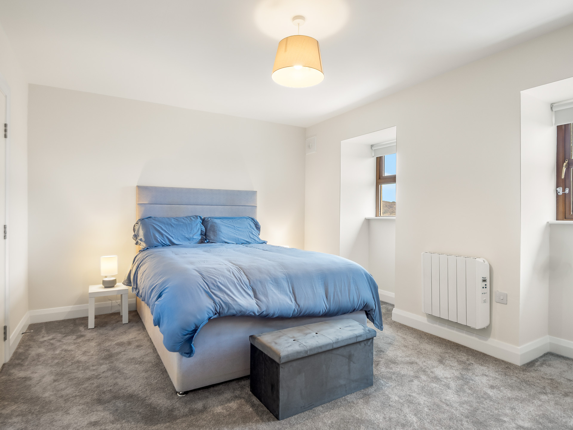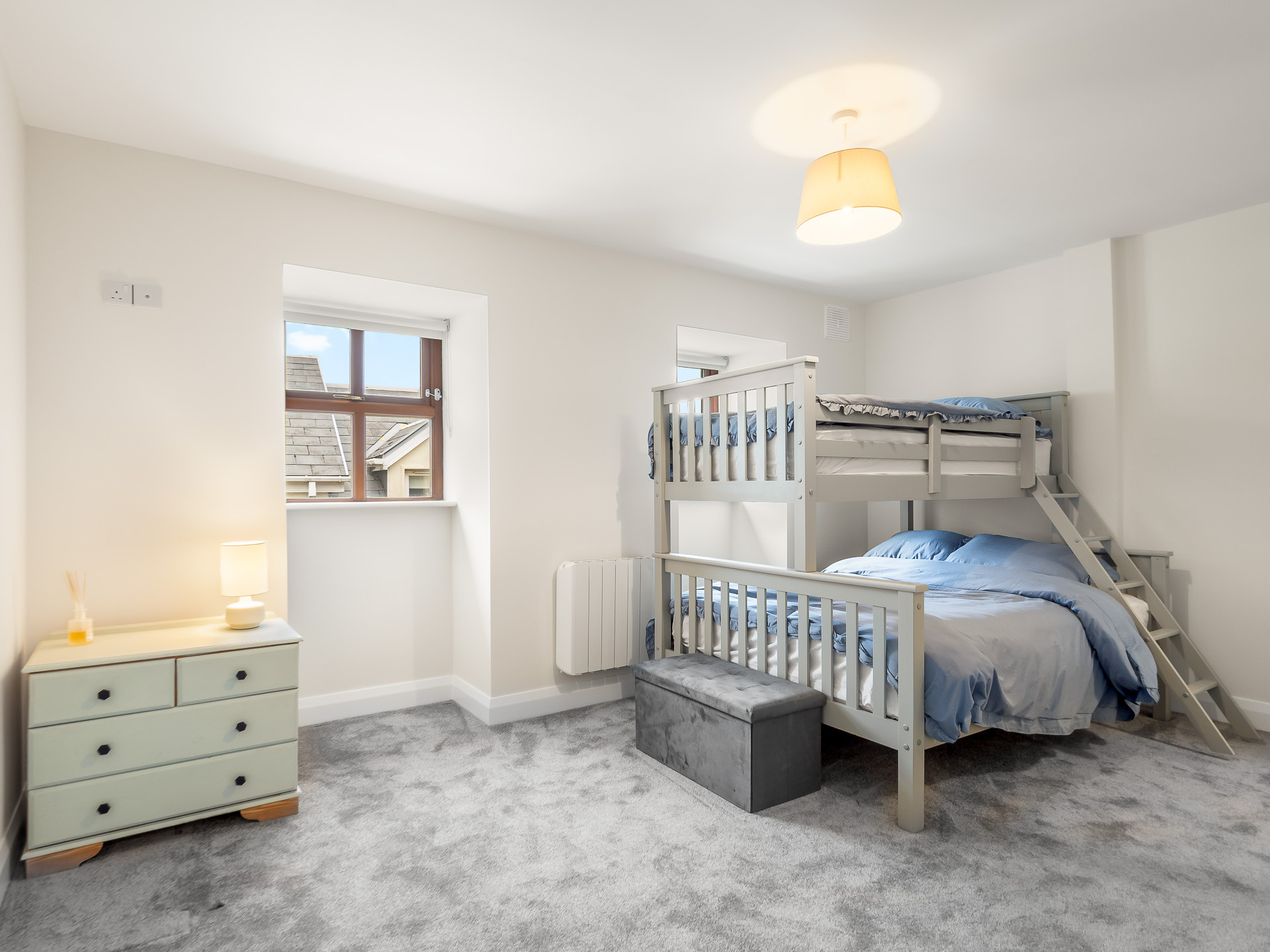 The 2nd bedroom is a bright, vibrant, relaxing space with a large king-size bed ample storage and a full-length mirror and there is also a desk and office chair for your laptop overlooking the town!