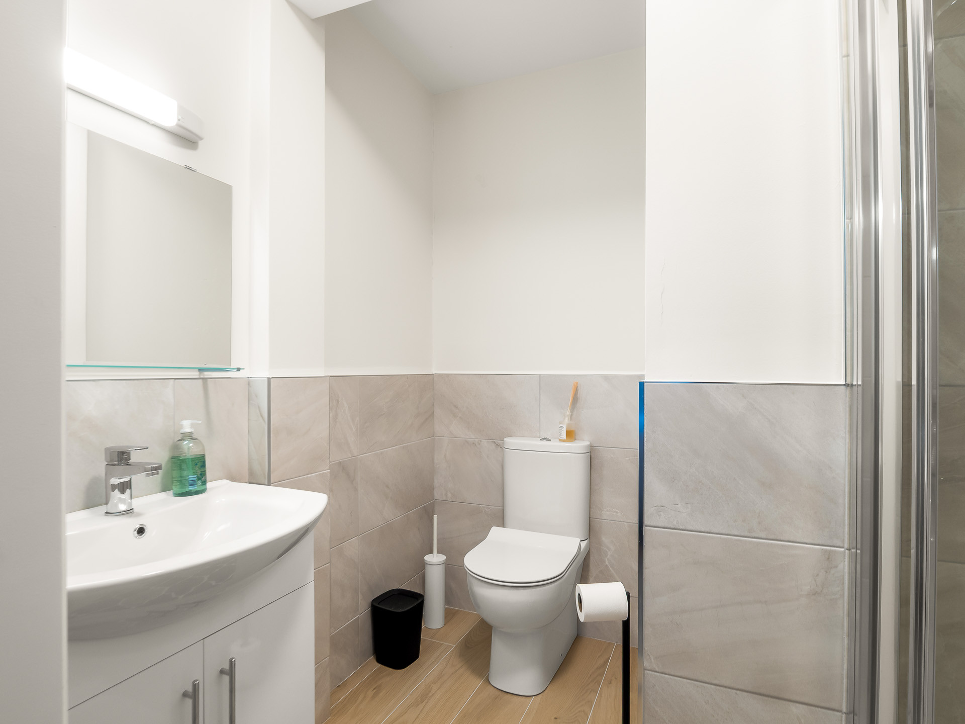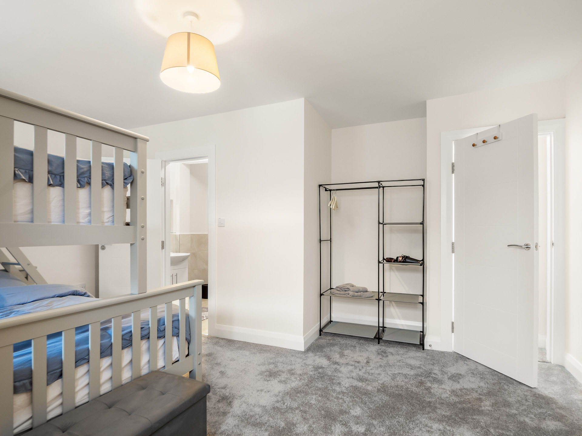 The main bedroom has a king-size bed with a cool colour scheme as well as an additional single bed. The open wardrobe will hold all your clothing and the full length mirror and vanity unit let you get ready before your big night out. Bedside tables, lamps cosy cushions and throws combine to make things a little more homely. A slick ensuite toilet and shower room provide privacy for the occupants of the main bedroom.