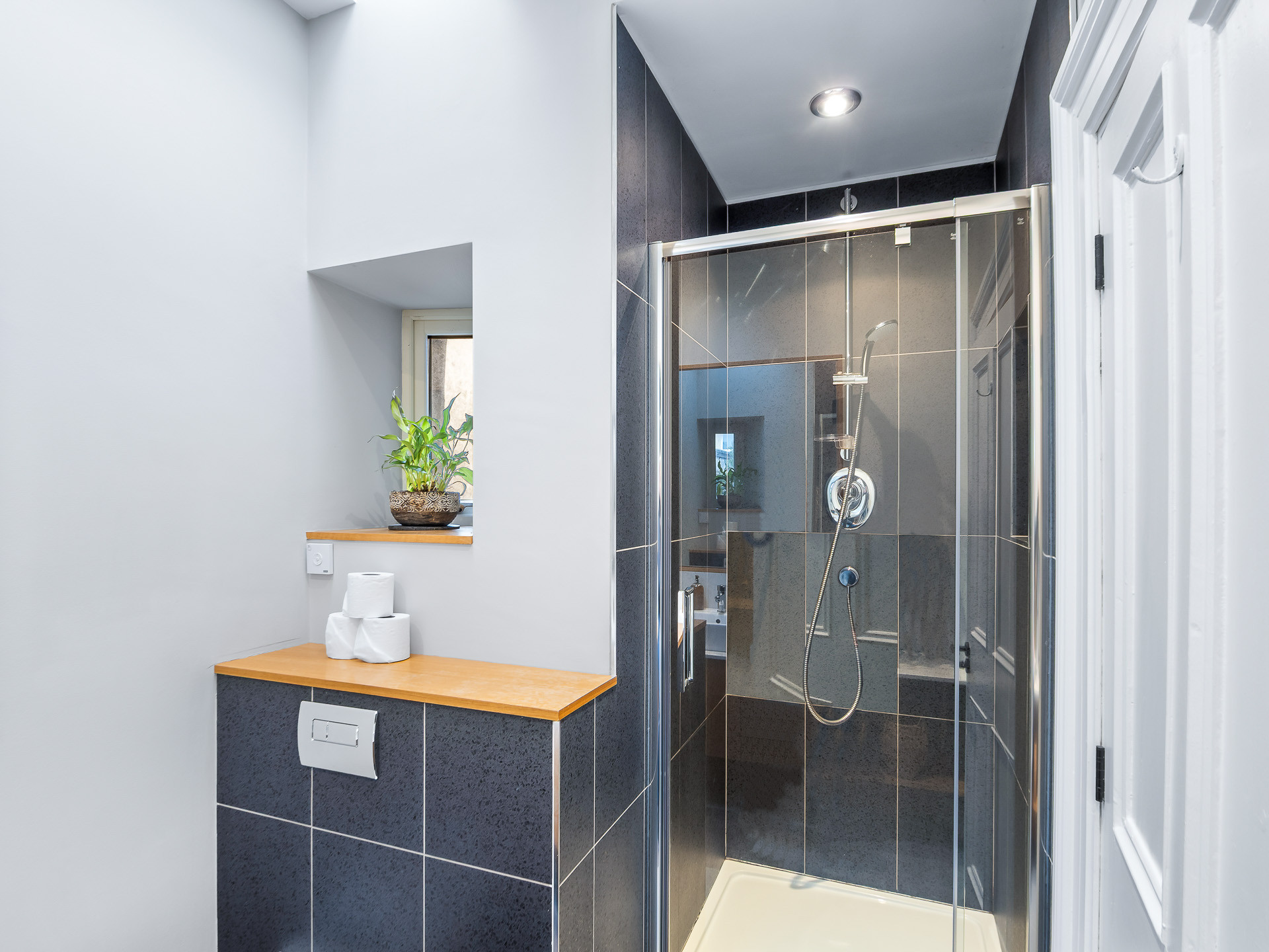 The bathroom is thoughtfully designed with comfort in mind, featuring heated floors and non-steam heated mirrors, adding a touch of everyday luxury, particularly welcome after coastal walks or hill hikes.