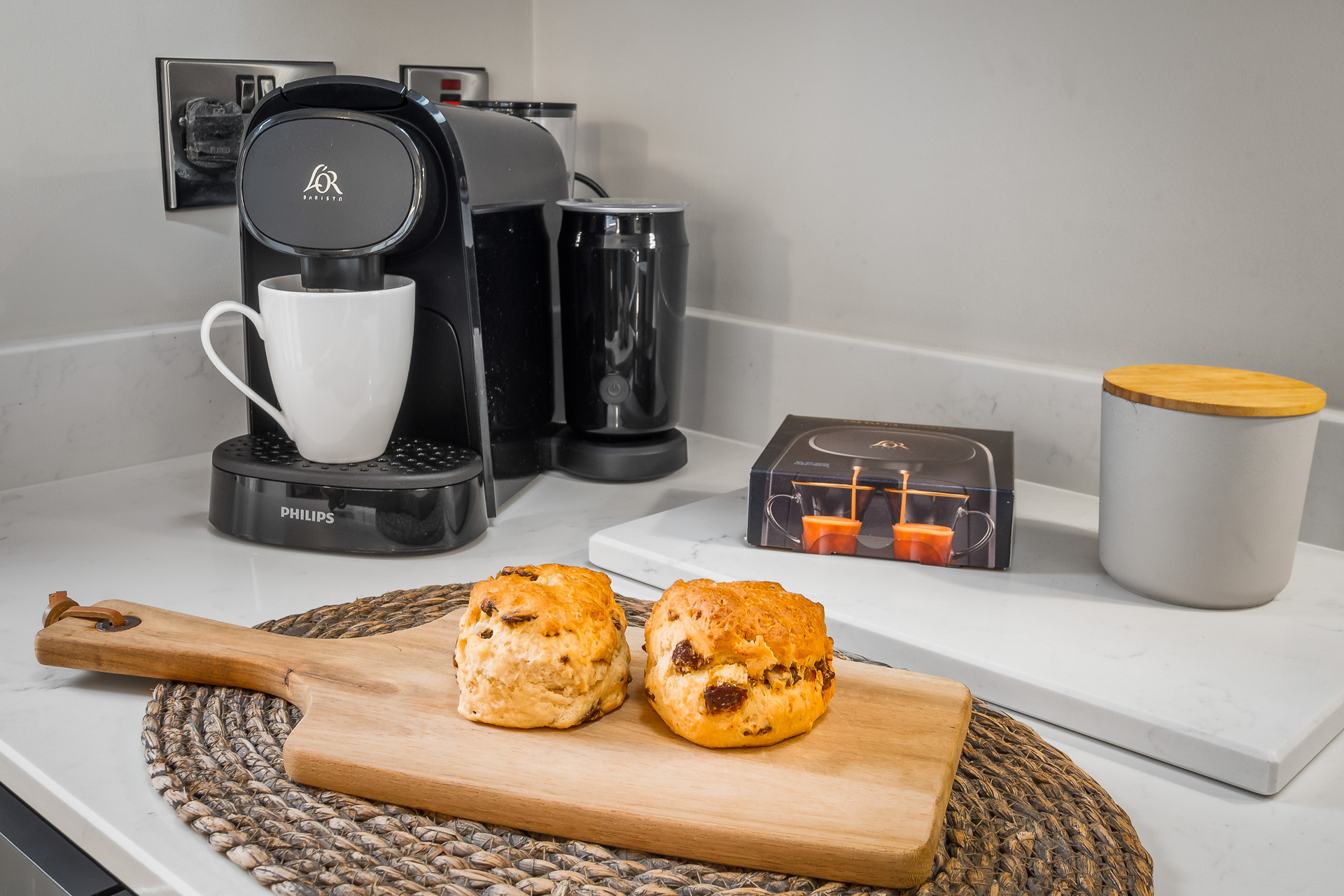 A modern, open-plan kitchen and dining area, fully equipped for your stay. Includes a coffee machine for your morning brew.