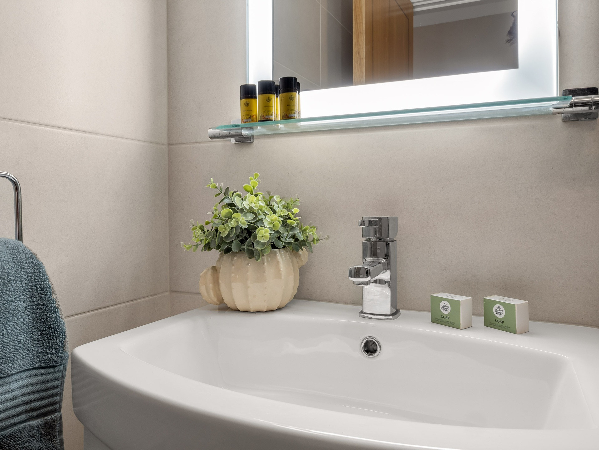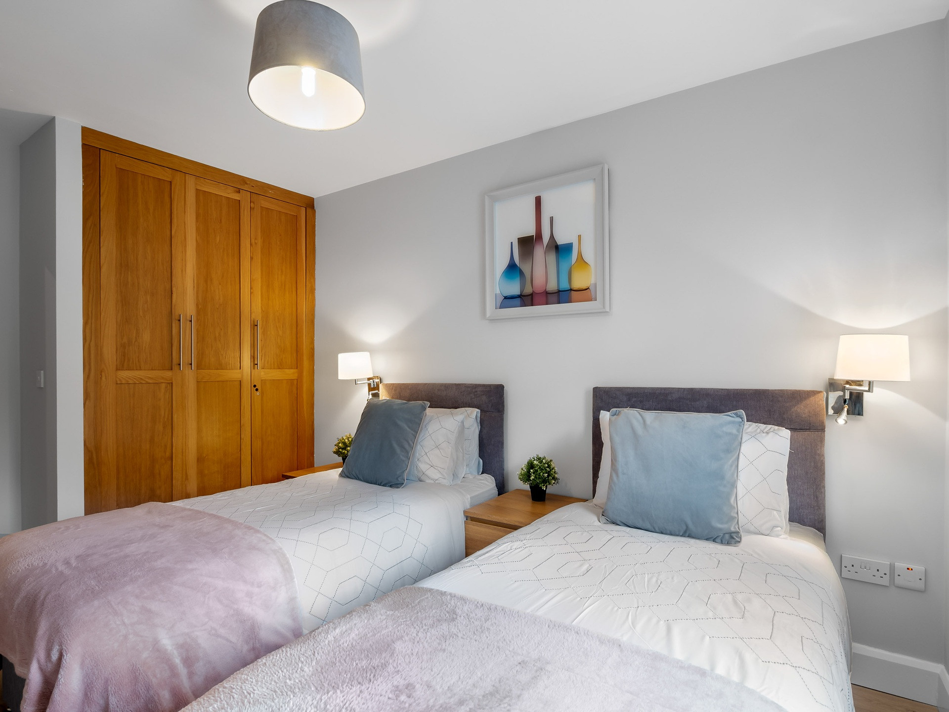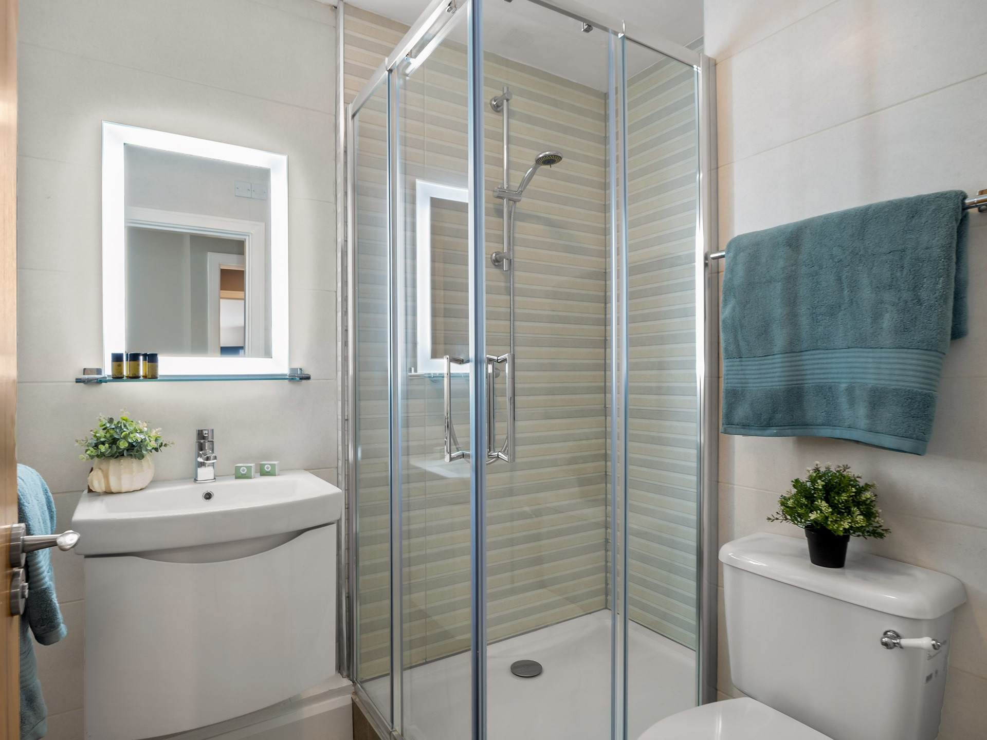 The main bedroom has a king-size bed with a cool colour scheme as well as an additional single bed. The open wardrobe will hold all your clothing and the full length mirror and vanity unit let you get ready before your big night out. Bedside tables, lamps cosy cushions and throws combine to make things a little more homely. A slick ensuite toilet and shower room provide privacy for the occupants of the main bedroom.