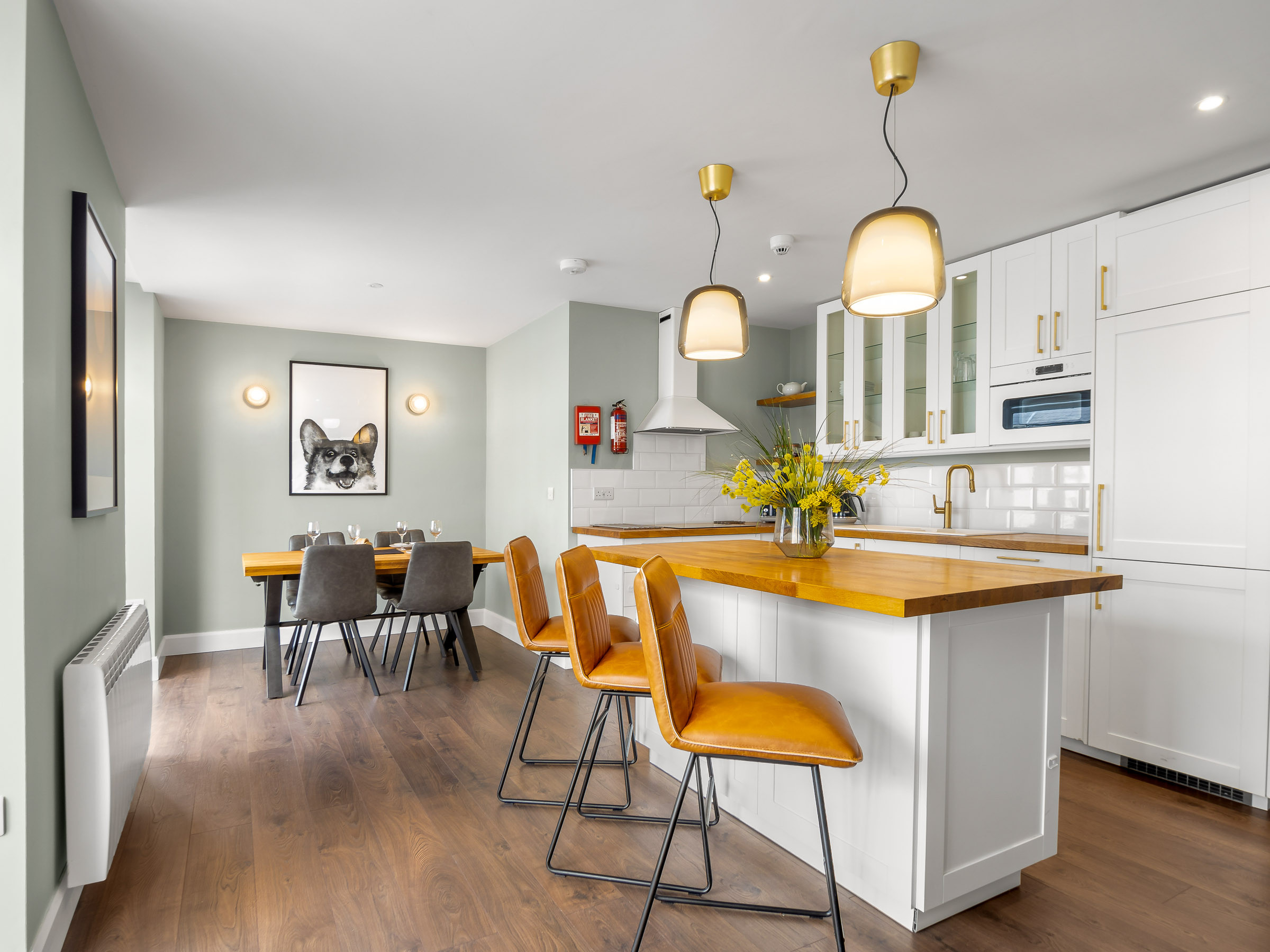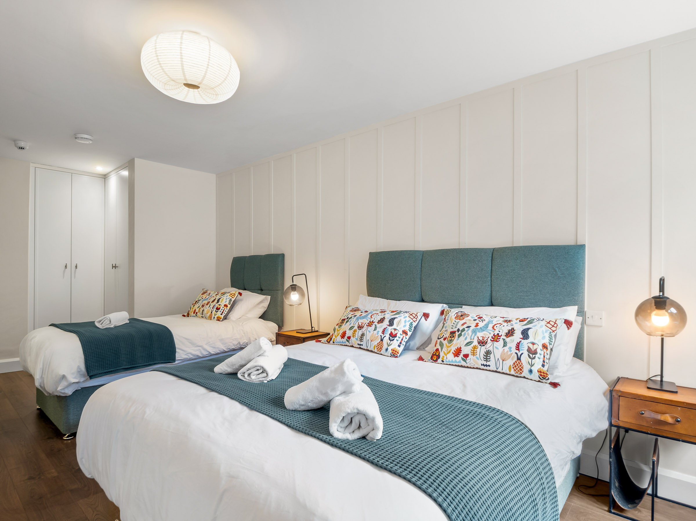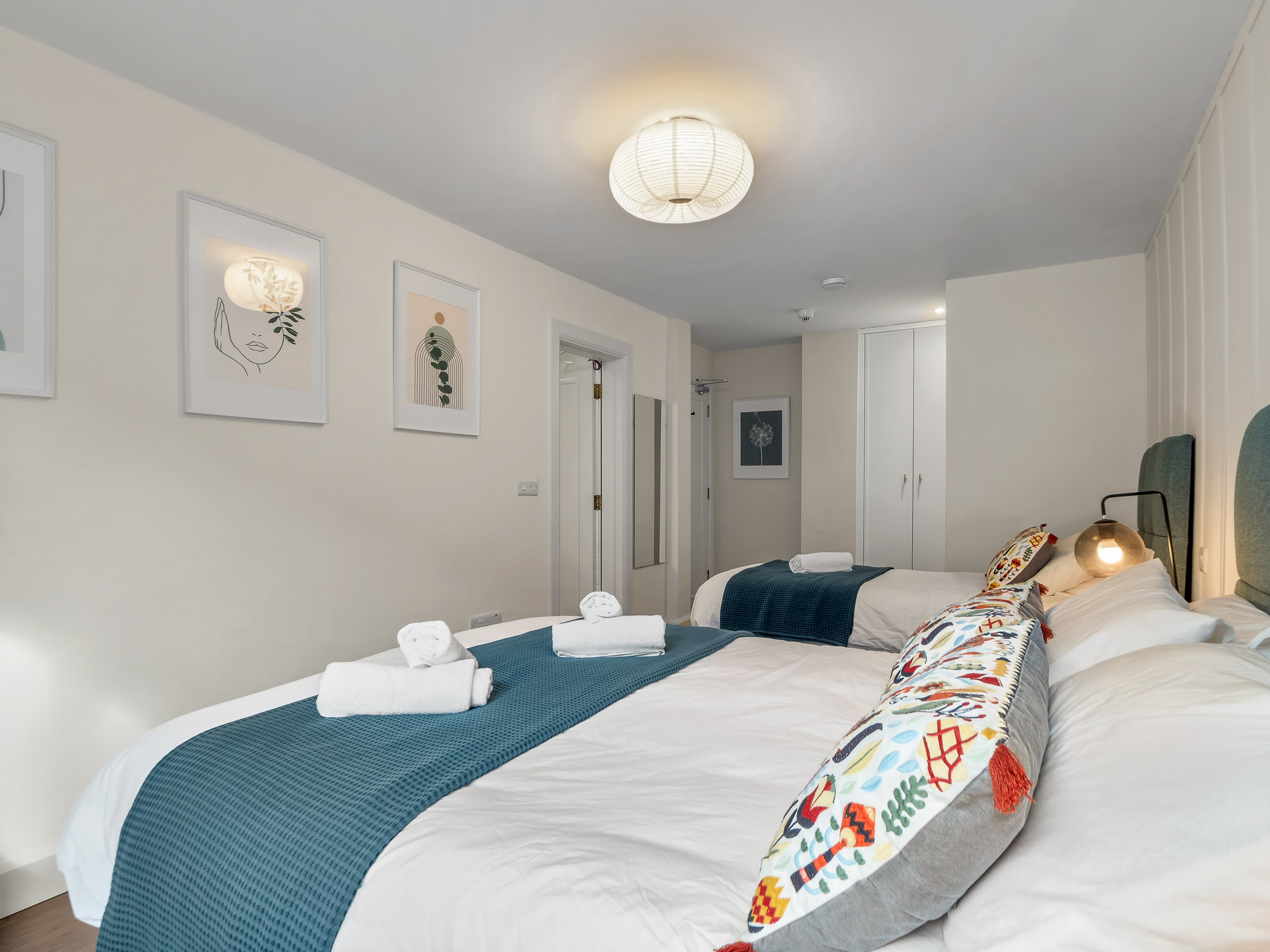 Lit by huge floor-to-ceiling windows, this natural light-filled property has an incredibly spacious living/dining/kitchen with 2 bedrooms (1 ensuite) and a main bathroom. It can sleep up to 6 guests in total. (1 x Super King Size Bed and 1 x King size bed and 1 x Single Bed as well as a living room sofa bed option) It is meticulously decorated, specifically for holiday accommodation, providing you all the amenities you'll need.