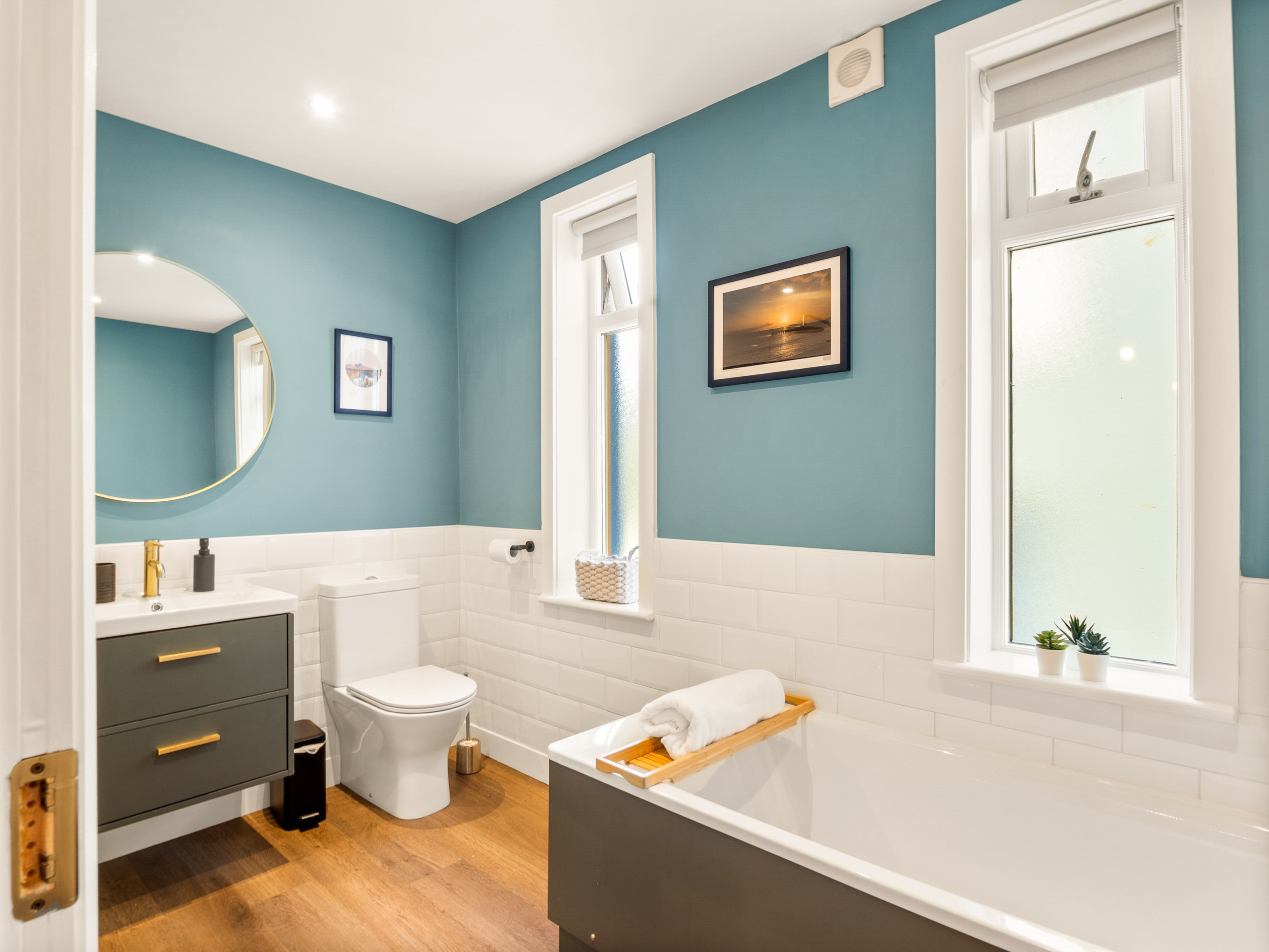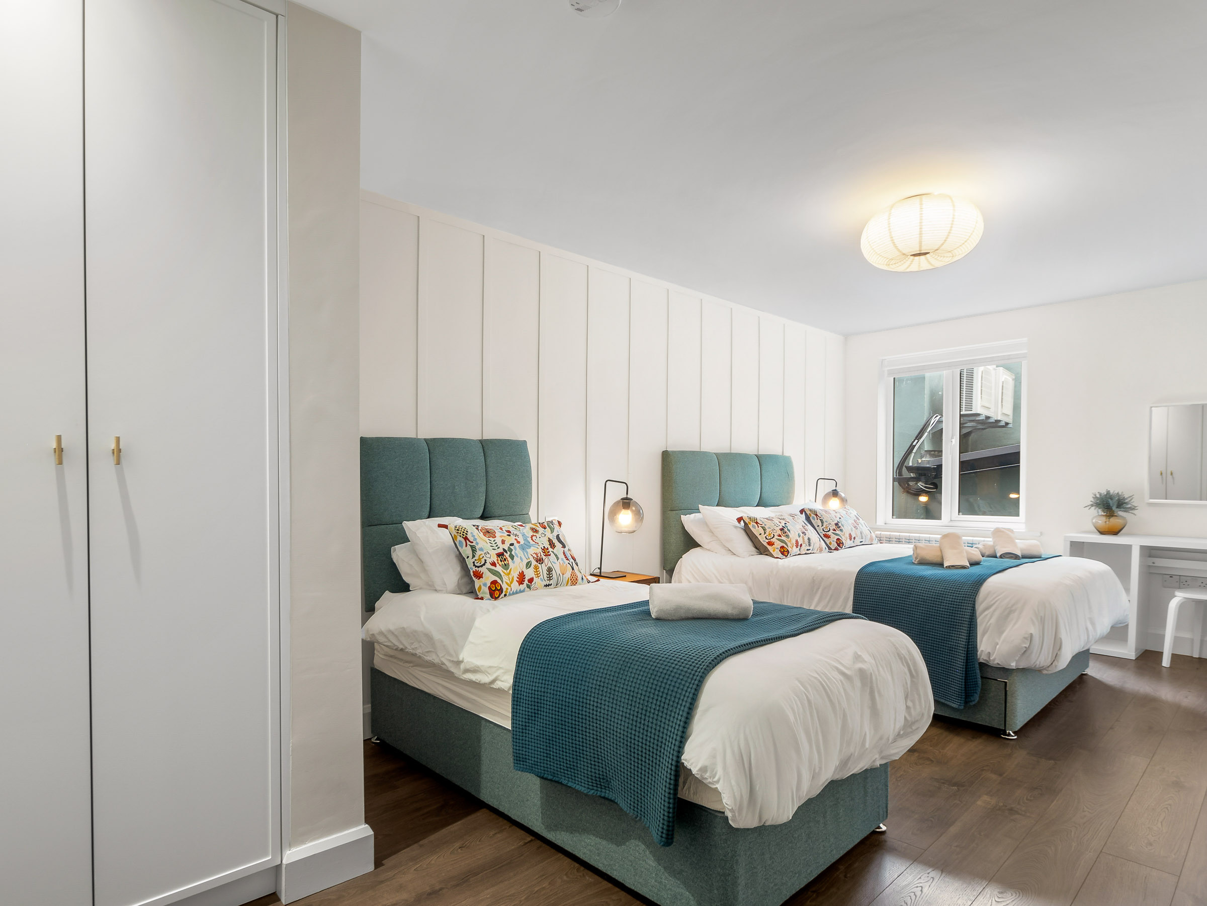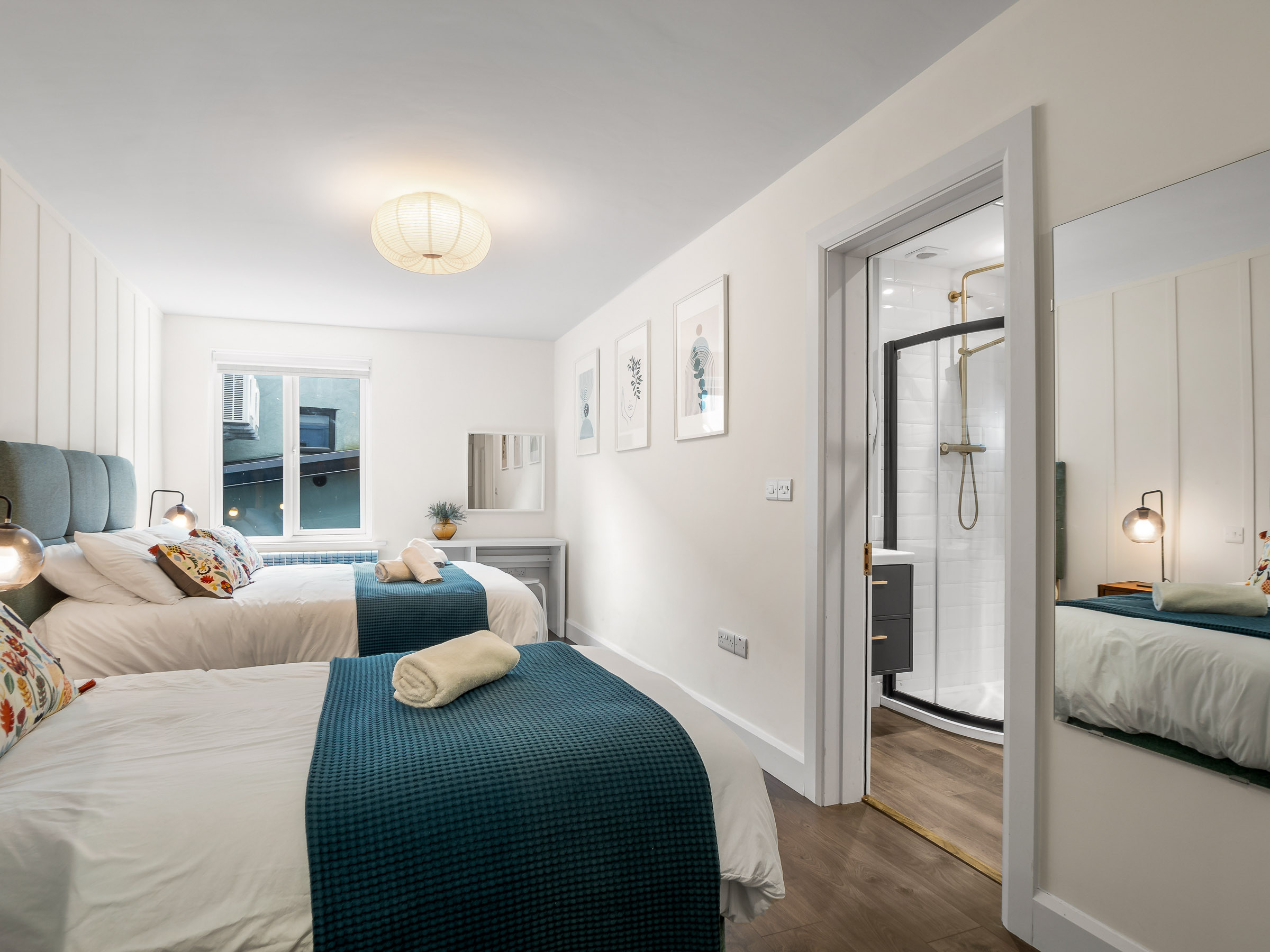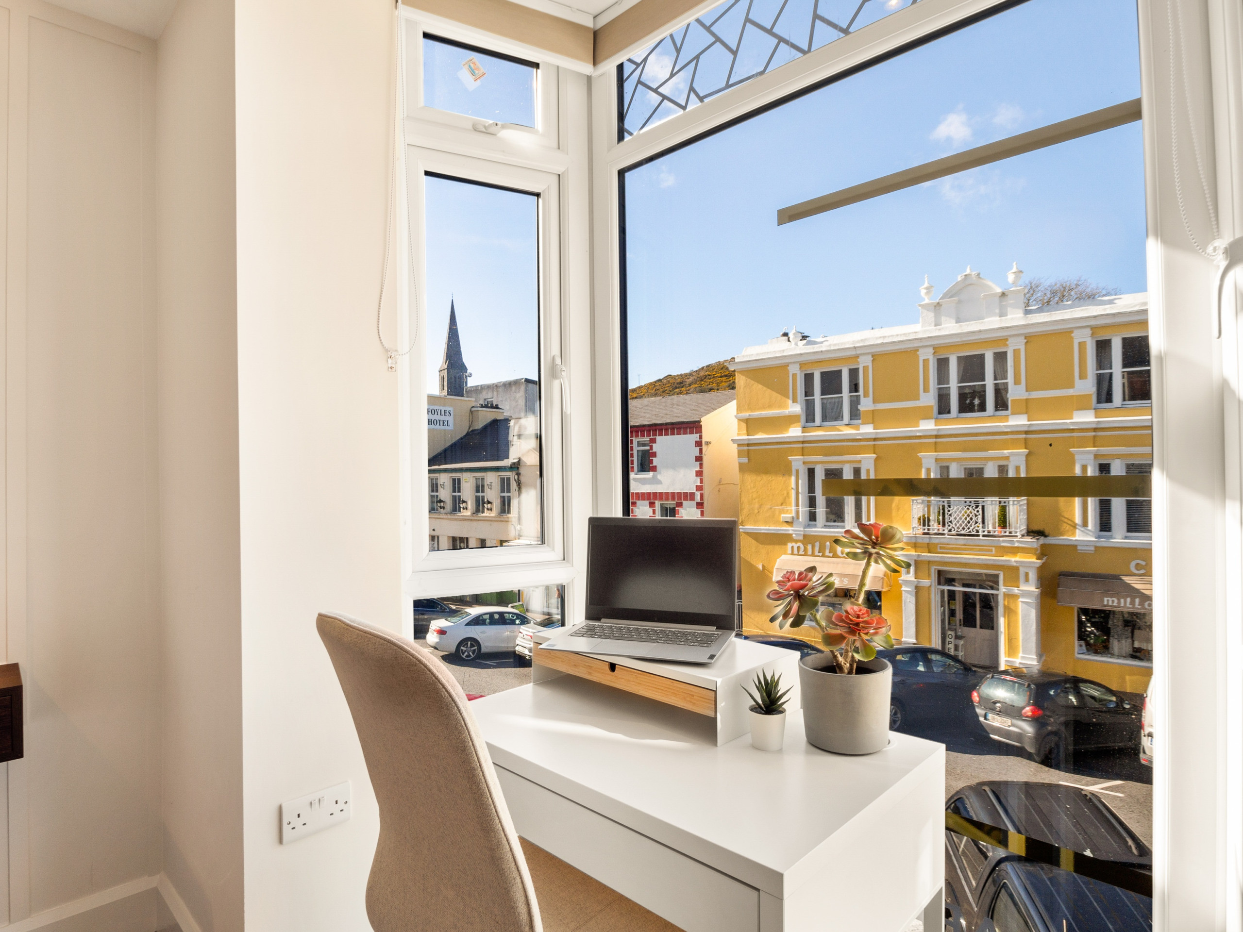 The 2nd bedroom is a bright, vibrant, relaxing space with a large king-size bed ample storage and a full-length mirror and there is also a desk and office chair for your laptop overlooking the town!