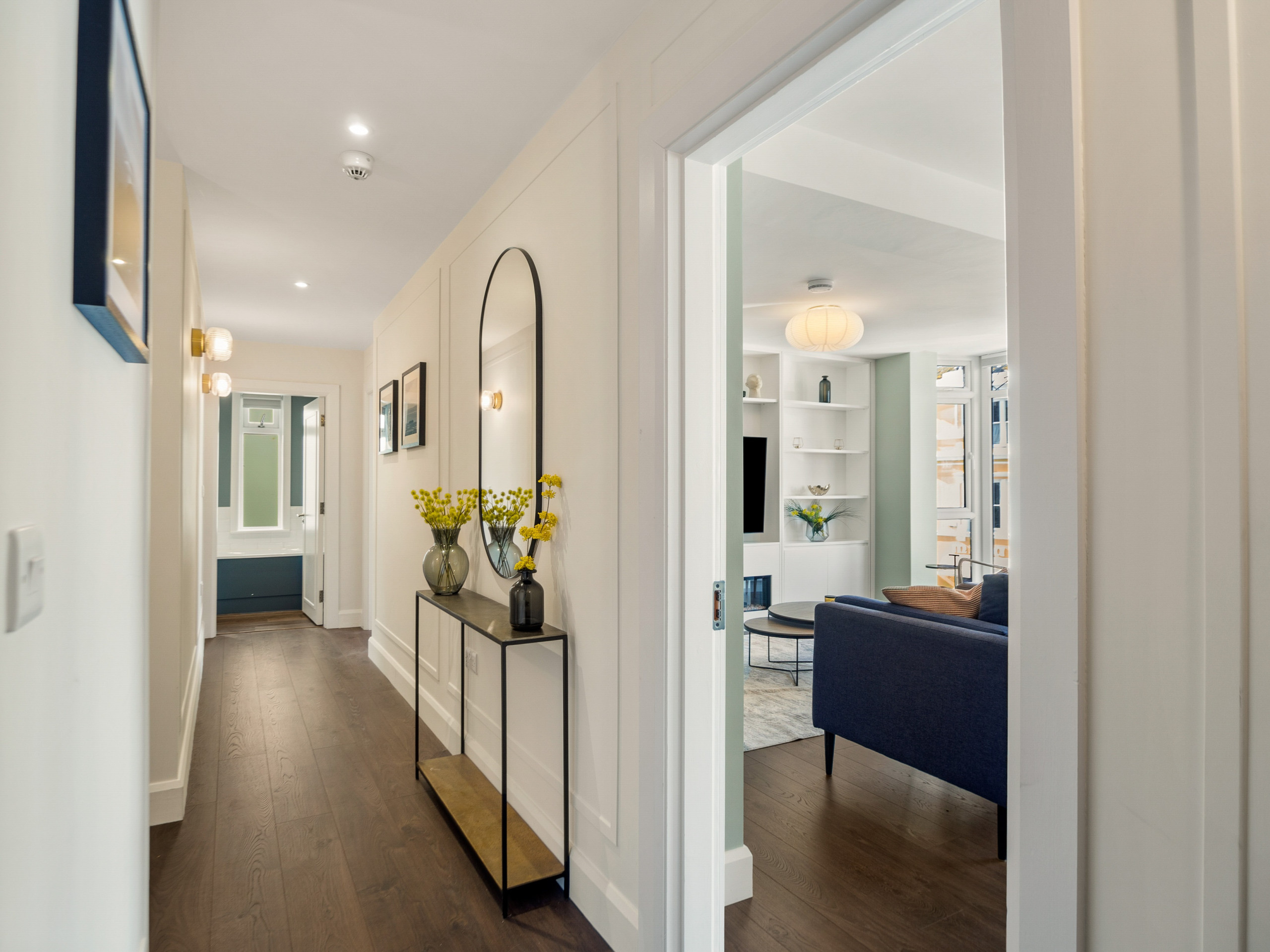 Entrance hallway with understairs storage area housing a washing machine (no dryer however we provide a clothes horse). Large floor-to-ceiling mirror. Tiled flooring, carpeted stairs leading to bedroom & shower rooms.