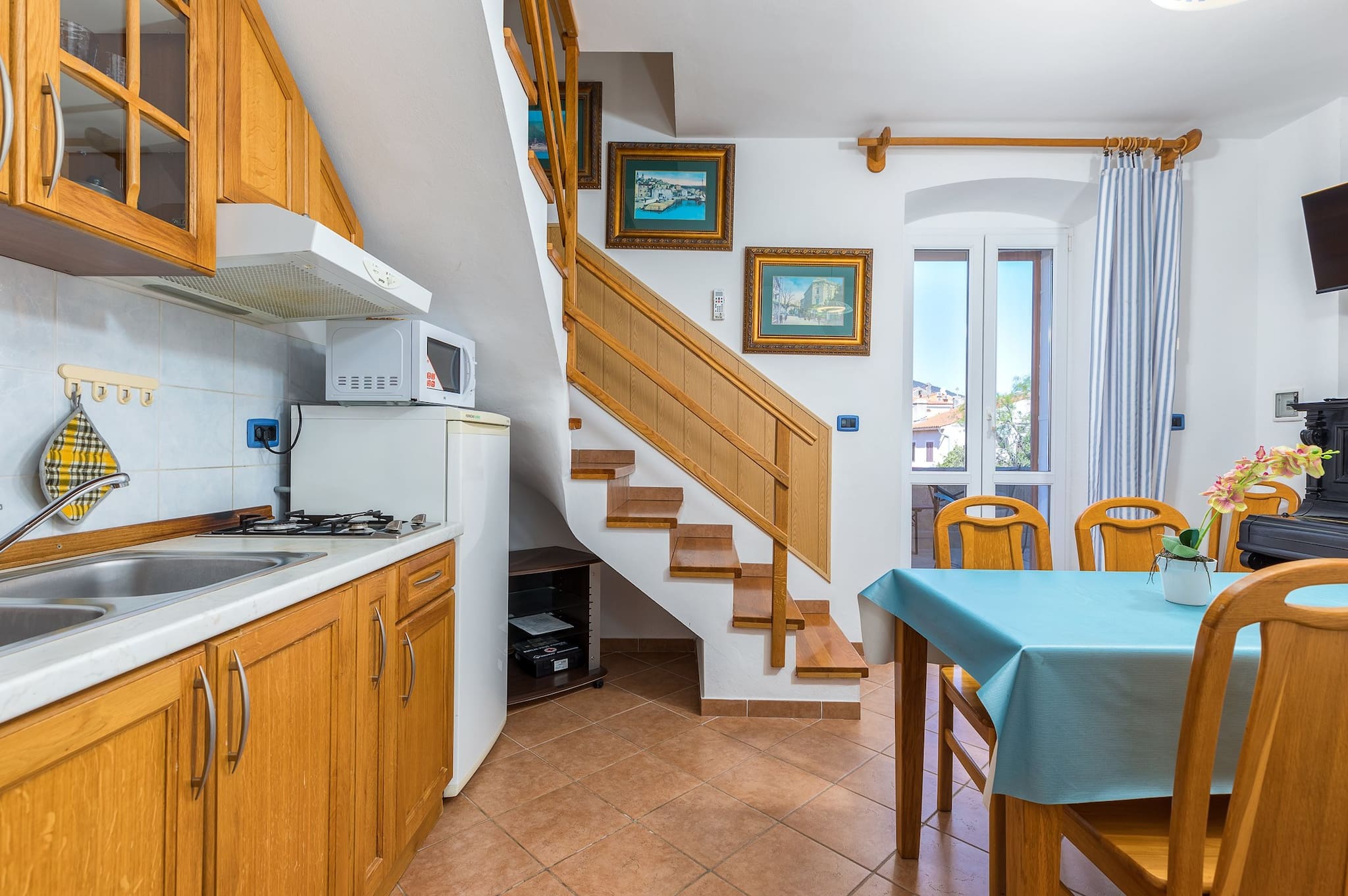 A bed that can be extended for two people is located next to the dining table. Guests have an entrance to a big terrace with sea view, barbecue and dining area. The terrace is shared with one apartment.