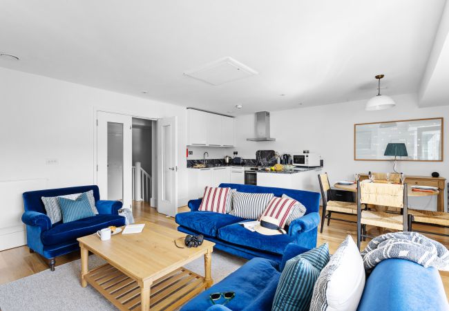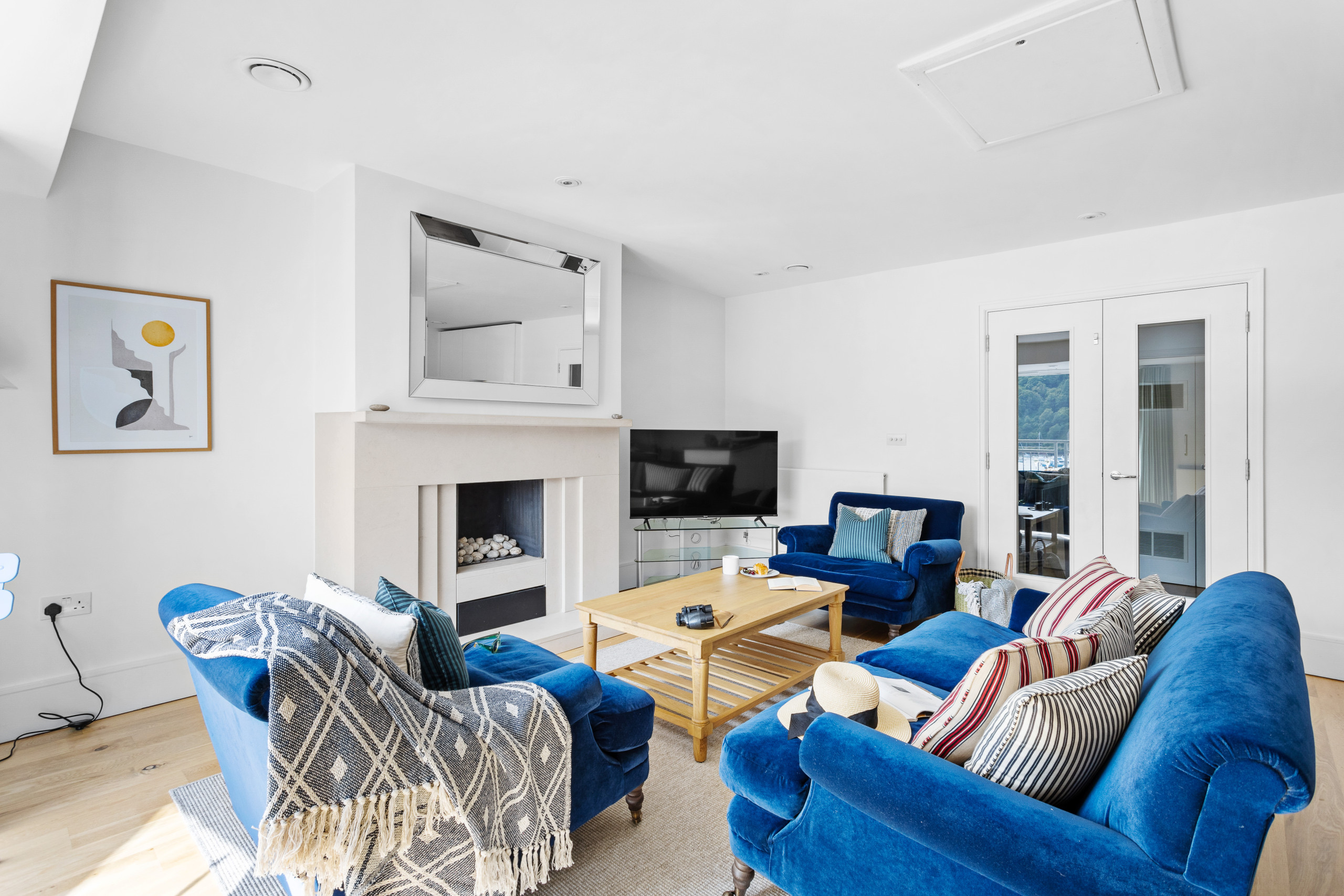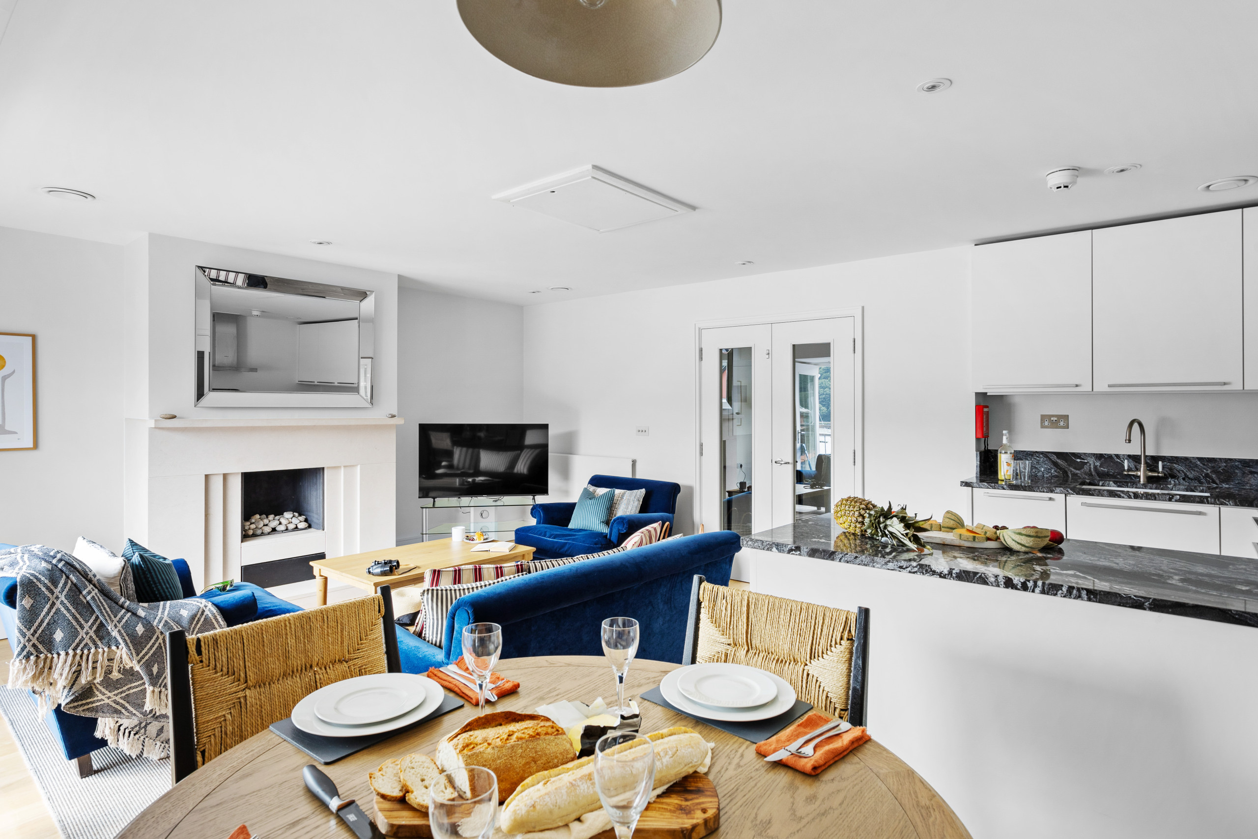As you enter the apartment you are greeted by a spacious hallway, where doors lead into the two bedrooms whilst a staircase takes you up to the open plan living area. Open the French doors and be greeted by a contemporary and stylish décor with a neutral colour palette, complemented by sumptuous sofas providing a perfect space to relax and unwind.