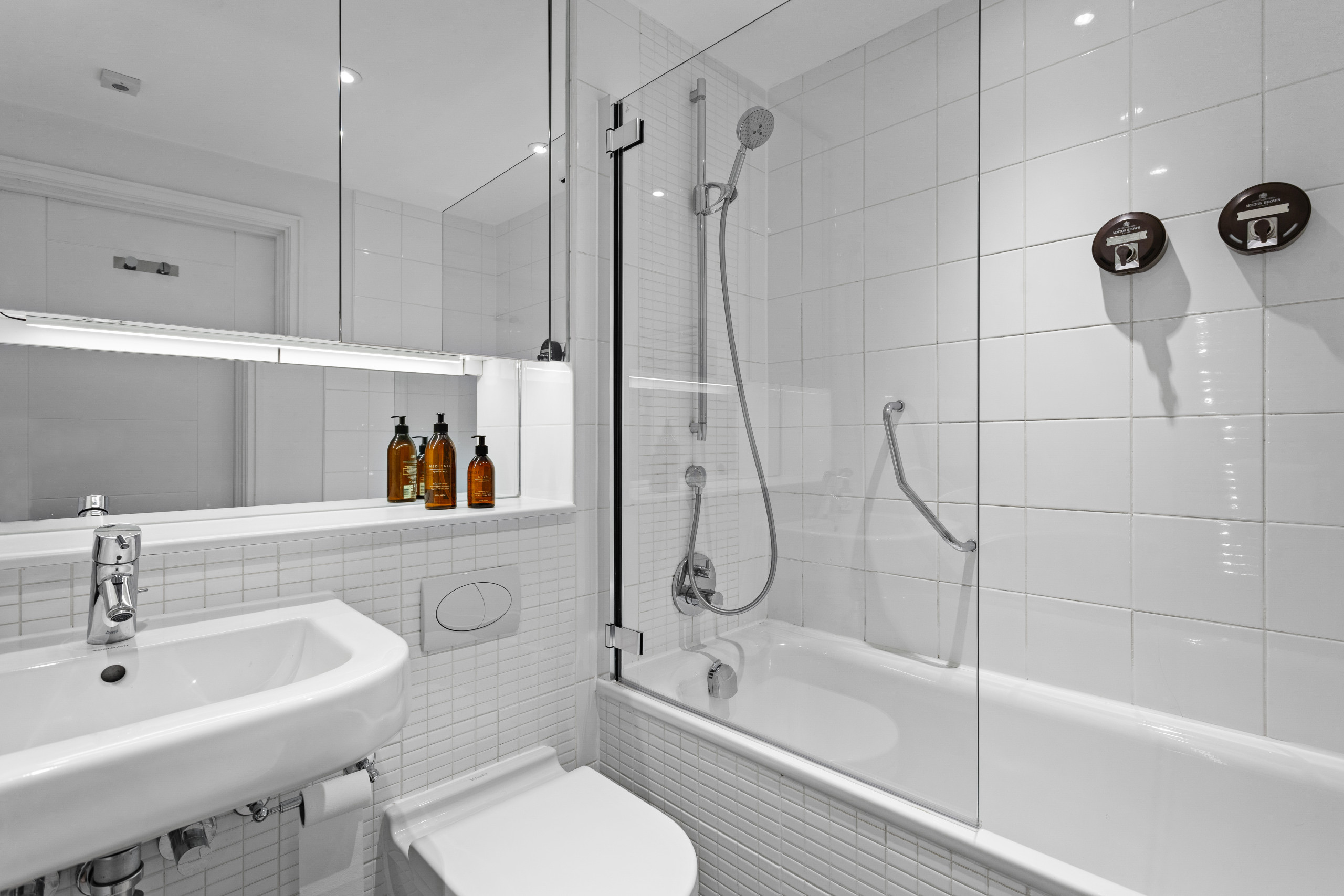 The family bathroom serves both bedrooms and includes a bath, overhead shower, heated towel rails, and underfloor heating.