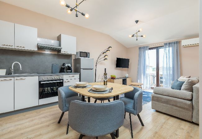 The apartment consists of two bedrooms with large double beds, living room connected with the kitchen and a bathoom. A private balcony is perfect for enjoying the summer breeze with a partial sea view.