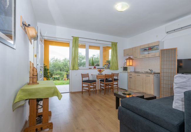 The apartment boasts a comfortable king-size bed and a private living room, creating a cosy sanctuary for couples seeking a peaceful holiday. With air conditioning to keep you cool during warm summer days, you'll find the indoor space wonderfully comfortable and inviting. The American-style kitchen is fully equipped with modern amenities, including a coffee machine, microwave, and all necessary kitchenware, allowing you to prepare delightful meals together.