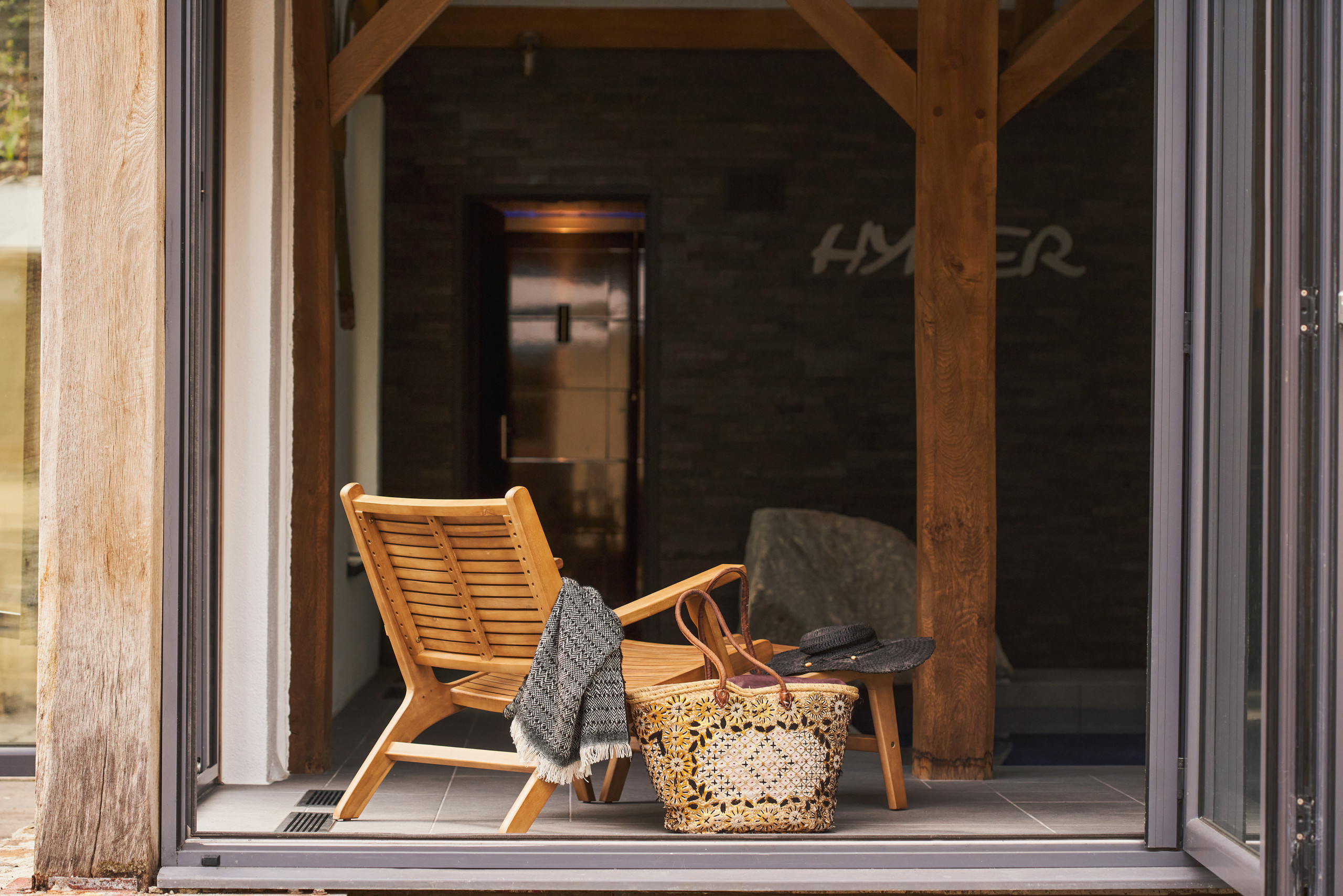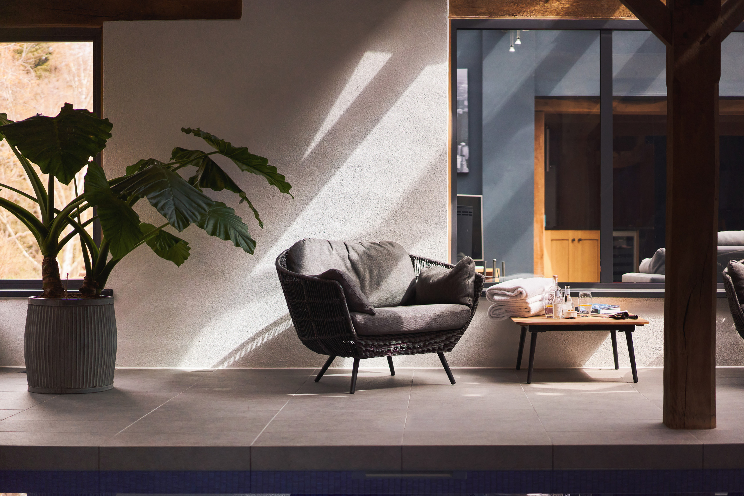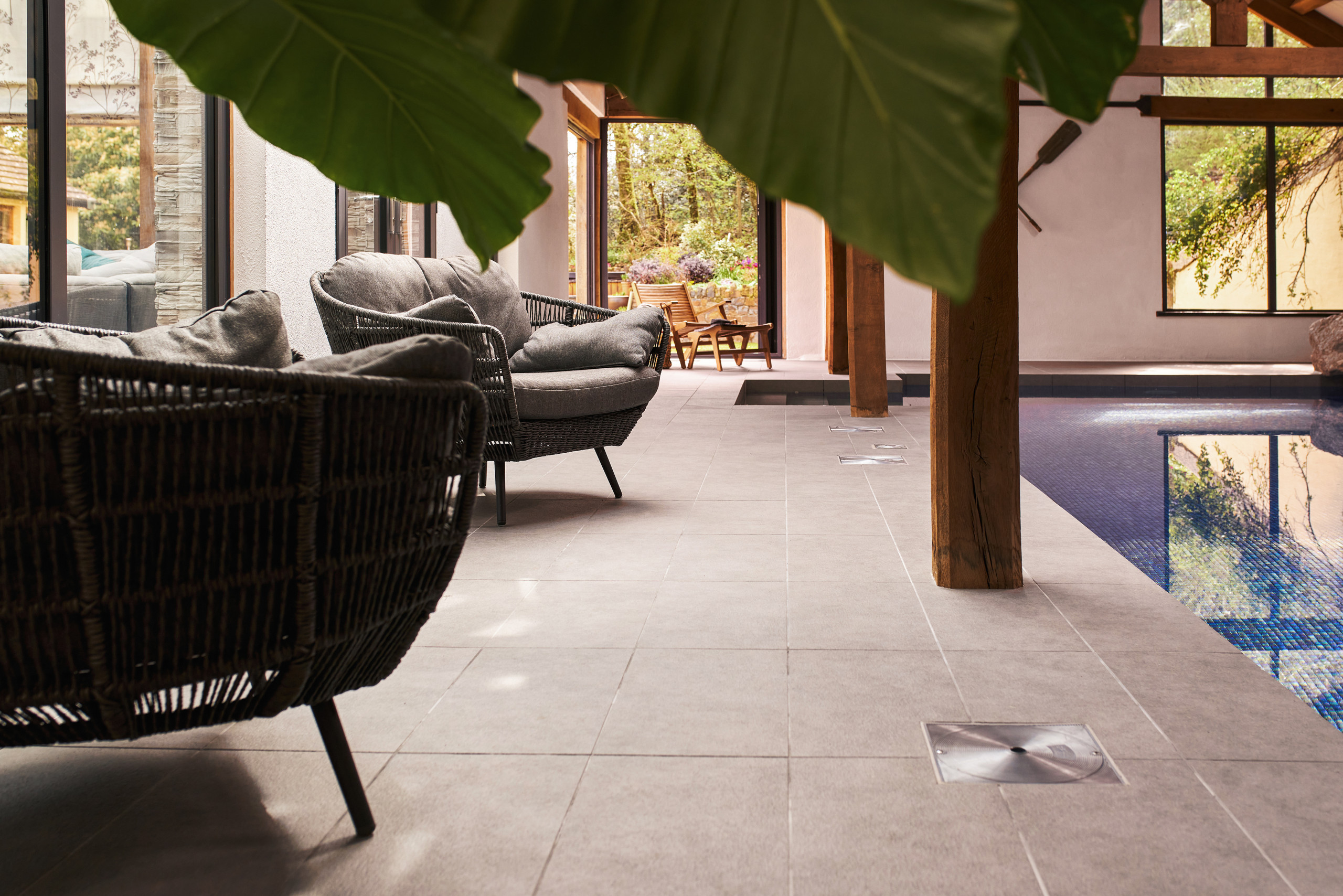 Outside, enjoy the fresh air and peaceful surroundings on your private patio. This is the perfect suntrap for a barbecue or even one of Devon’s famous cream teas. After your meal, wander the shared expansive lawns and woods – there’s even a babbling brook running past. You don’t have to go far for adventure – head to the gorgeous vaulted pool for a energising swim and relax afterwards in the traditional wooden sauna. Comfy chairs and huge doors that open out into the fresh air make the pool a great place to enjoy a book and even an aperitif – try the local gin – before drifting back to Swifts Return for dinner.