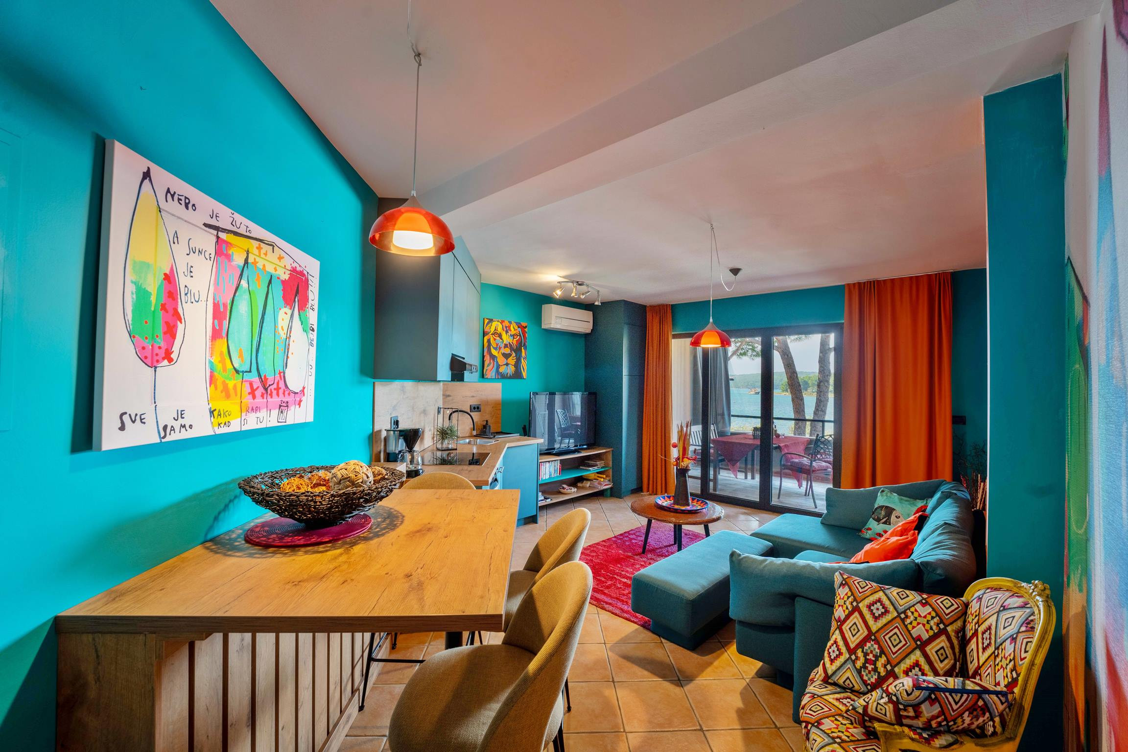 Apartment Sole is decorated in colors of the sun. It can accommodate up to 4 people, which can sleep in 2 bedrooms (one with double bed, and one with 2 single beds). It has a private balcony, bathroom and living room with a kitchen.