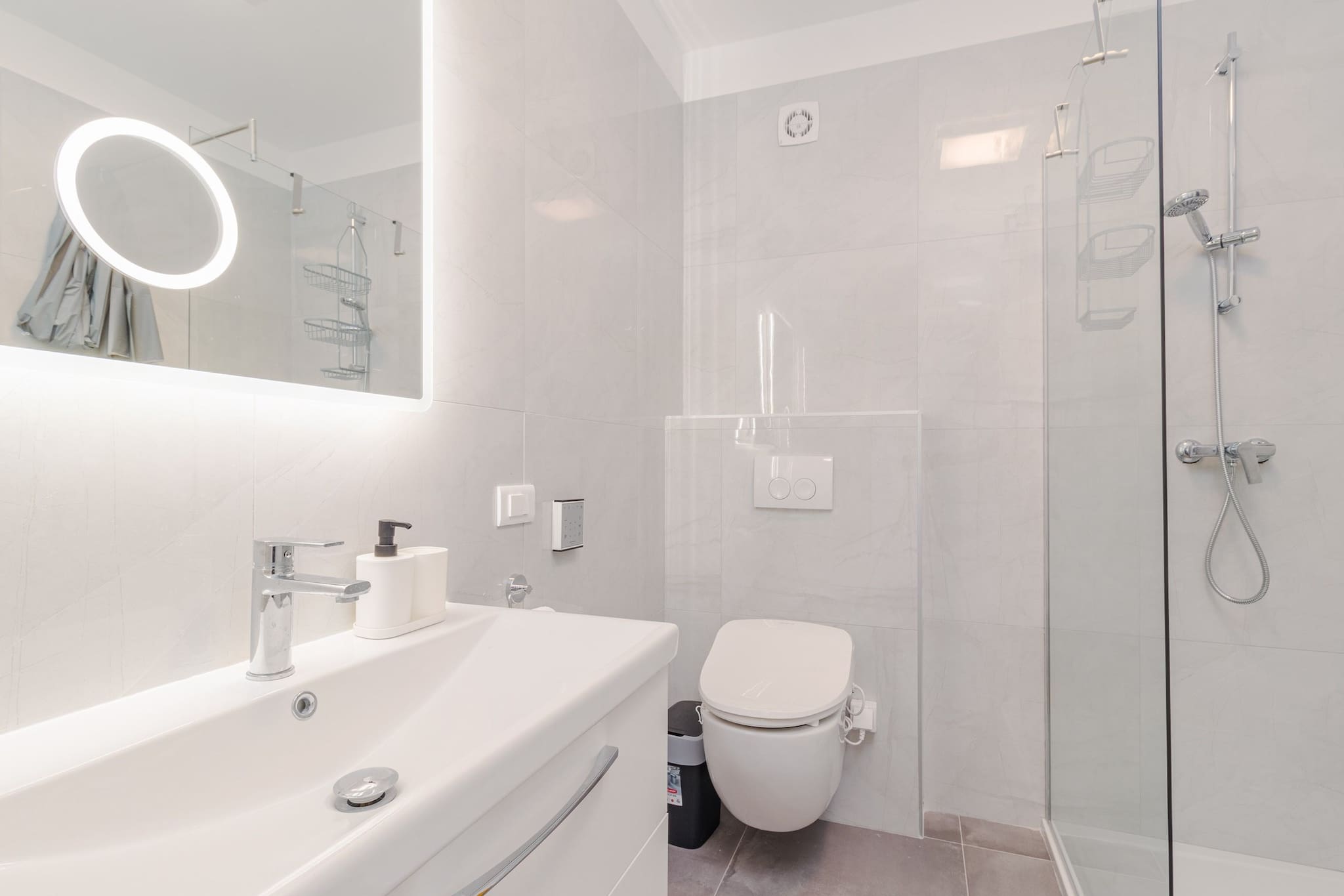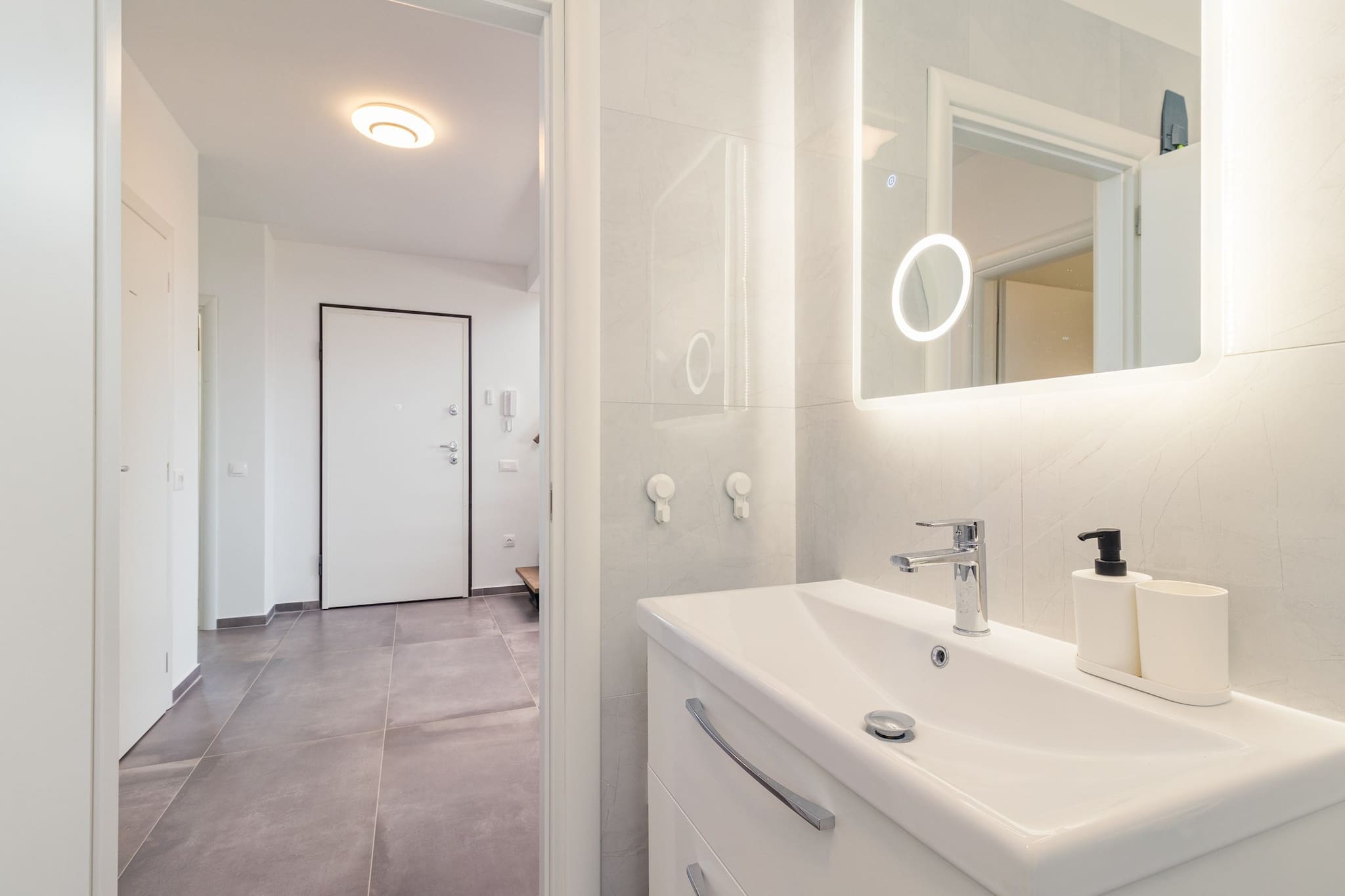 Apartment has two bedrooms with double beds, and also a convertible sofa for 2 people. 2 bathrooms are available, and one of them is en suite.