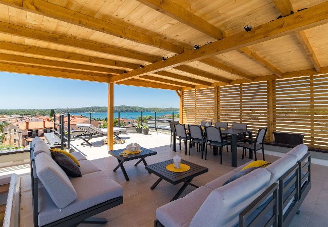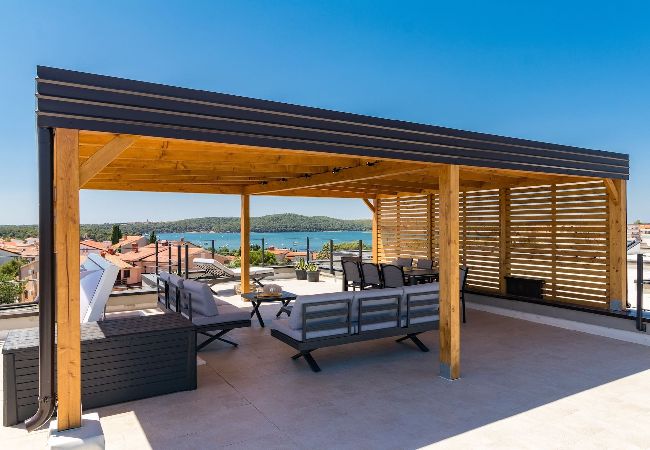 It offers a private roof terrace with panoramic sea view and garden furniture.