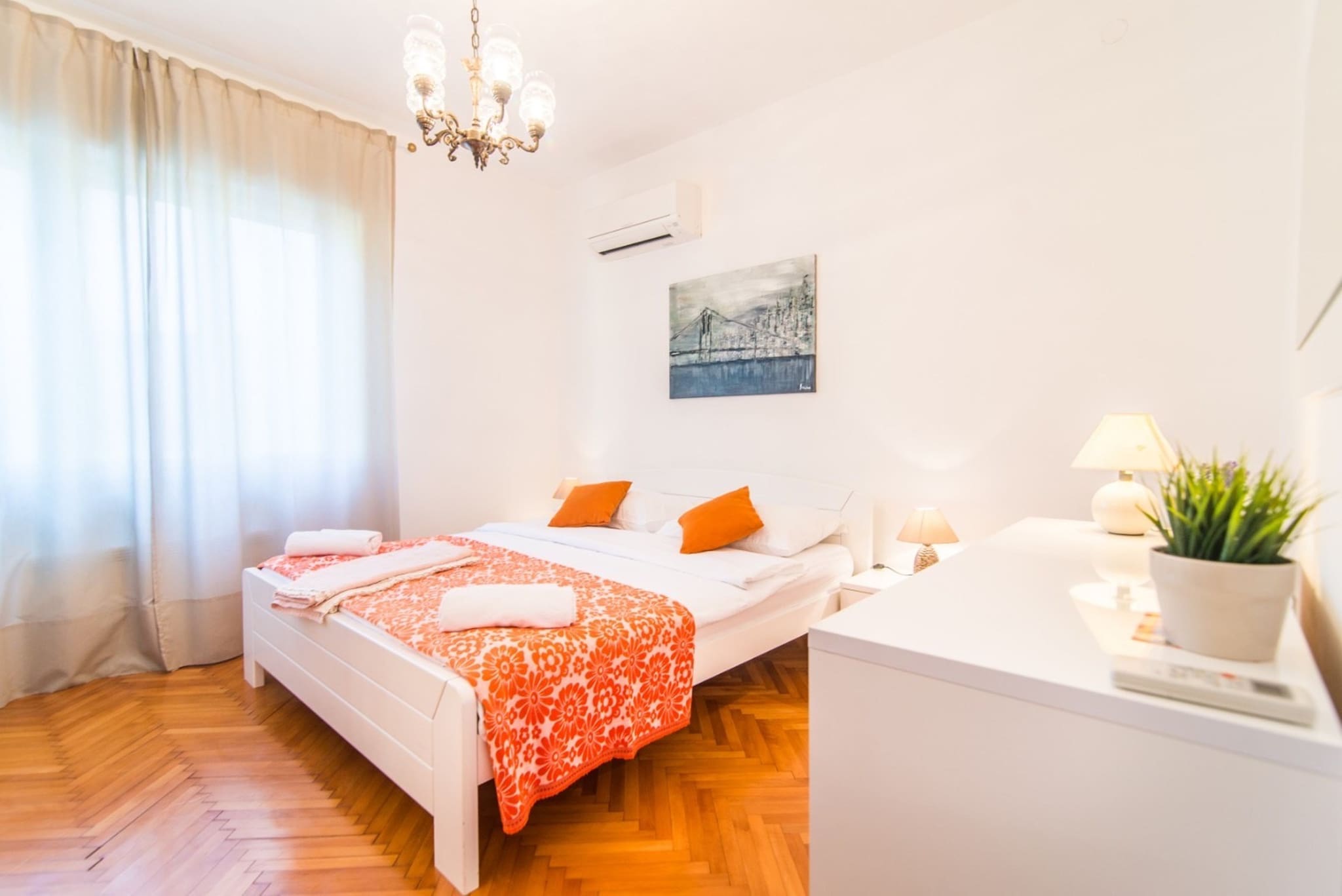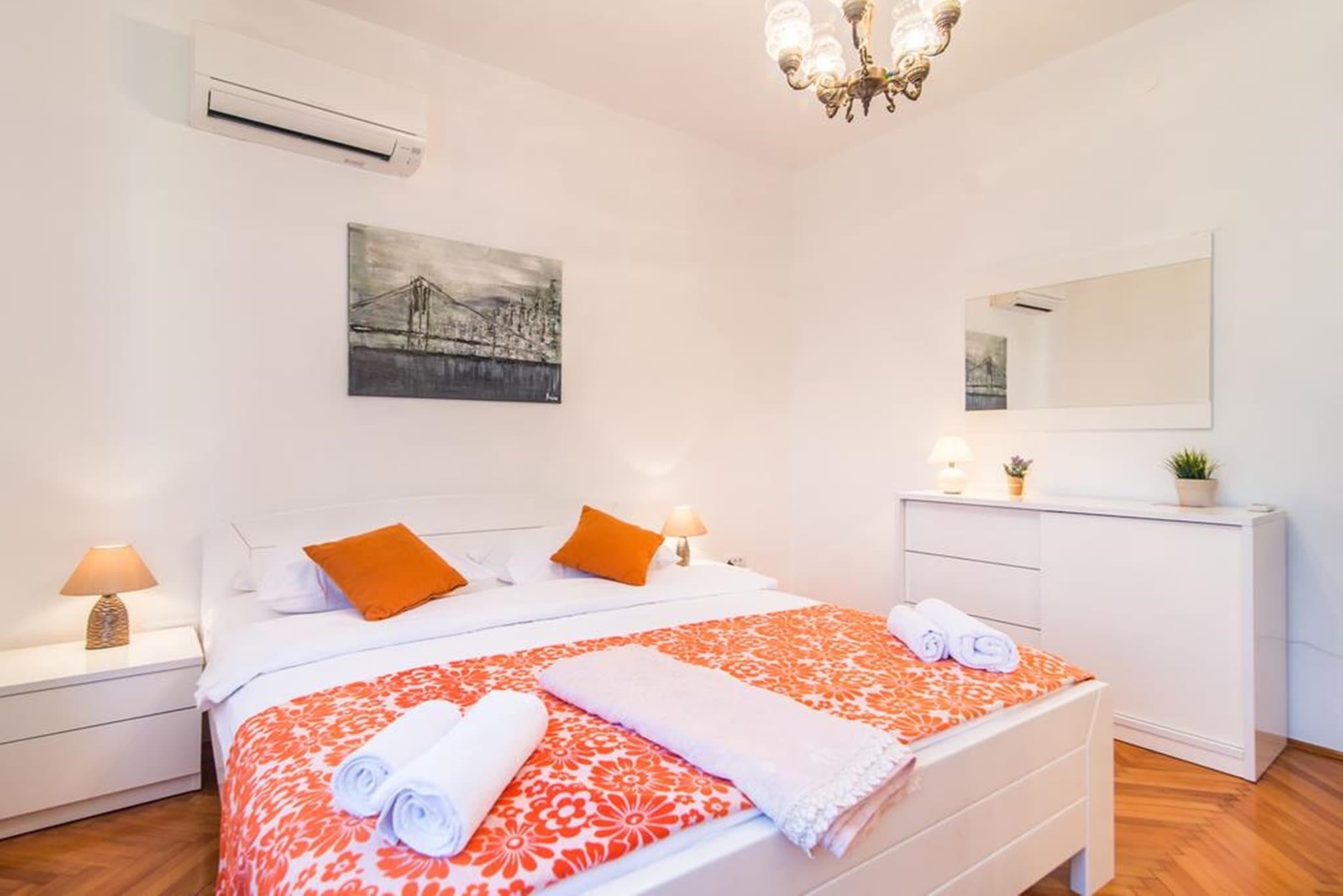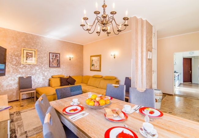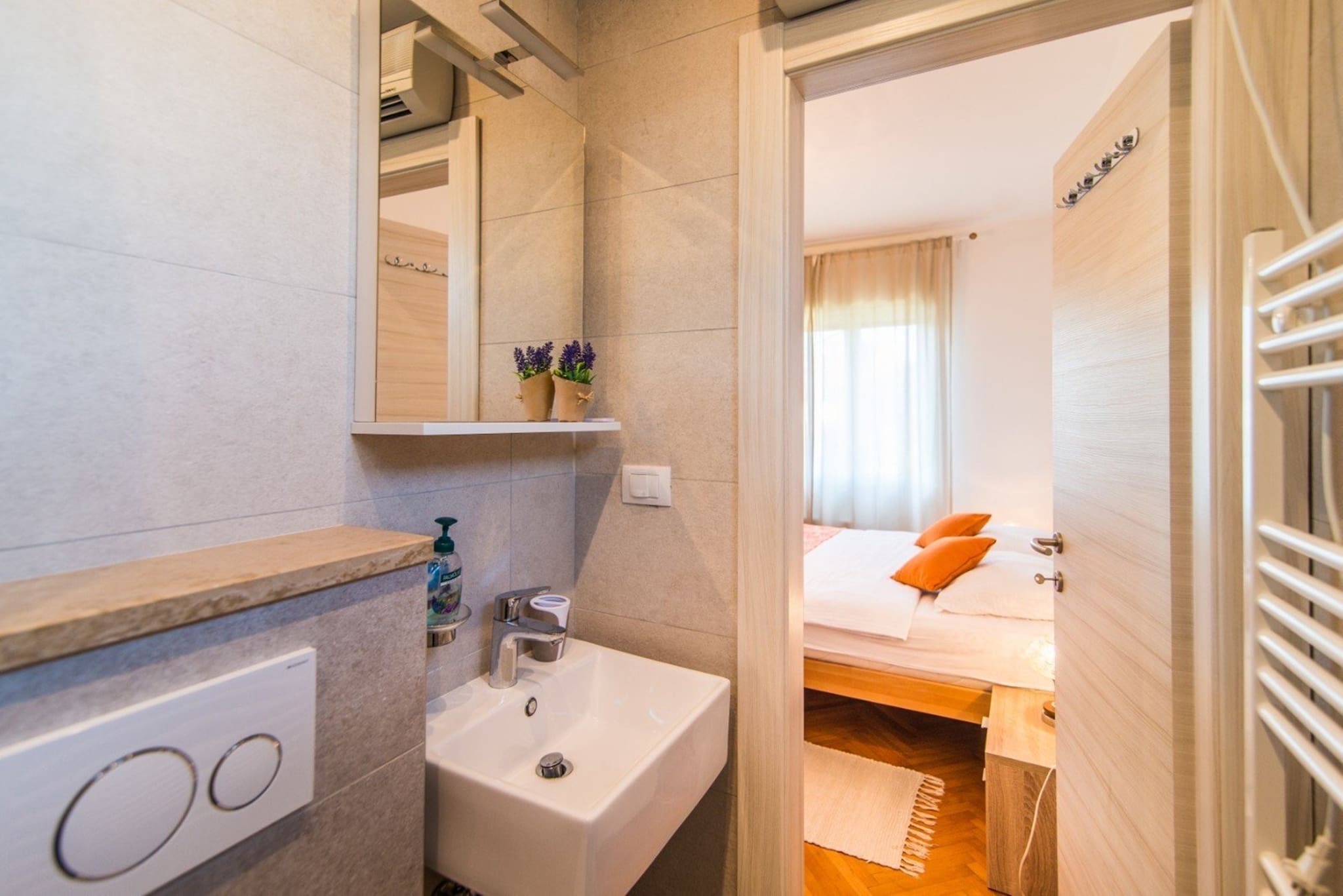 This accommodation is most suitable for families. It's a three-bedroom apartment with 2 bathrooms (one of them is en suite), fully equipped kitchen, tastefully decorated living room and a spacious terrace (20 m2) where guests can enjoy in fresh air and sea view. Apartment has 2 air-conditioning devices and 3 Internet enabled TV's.