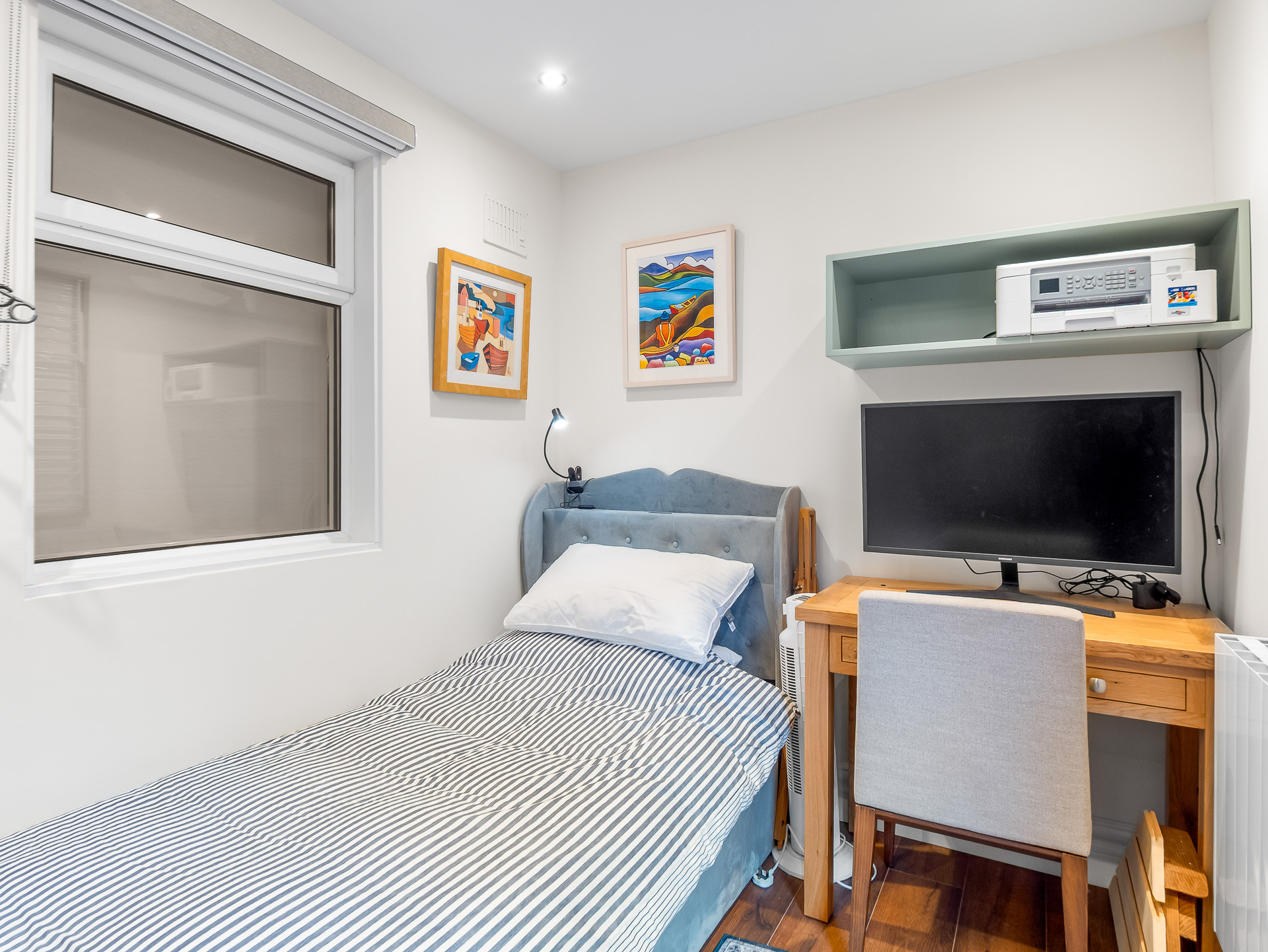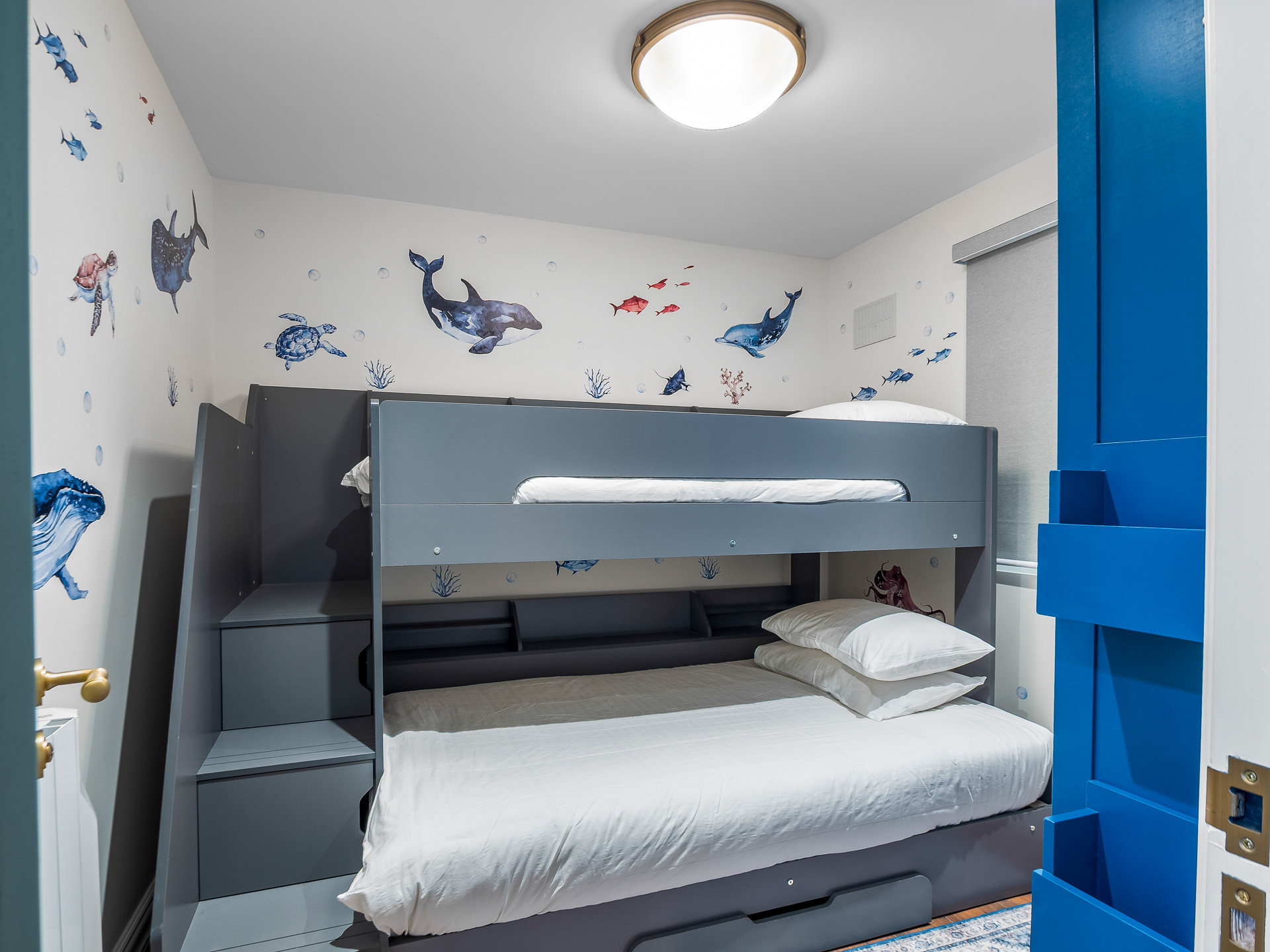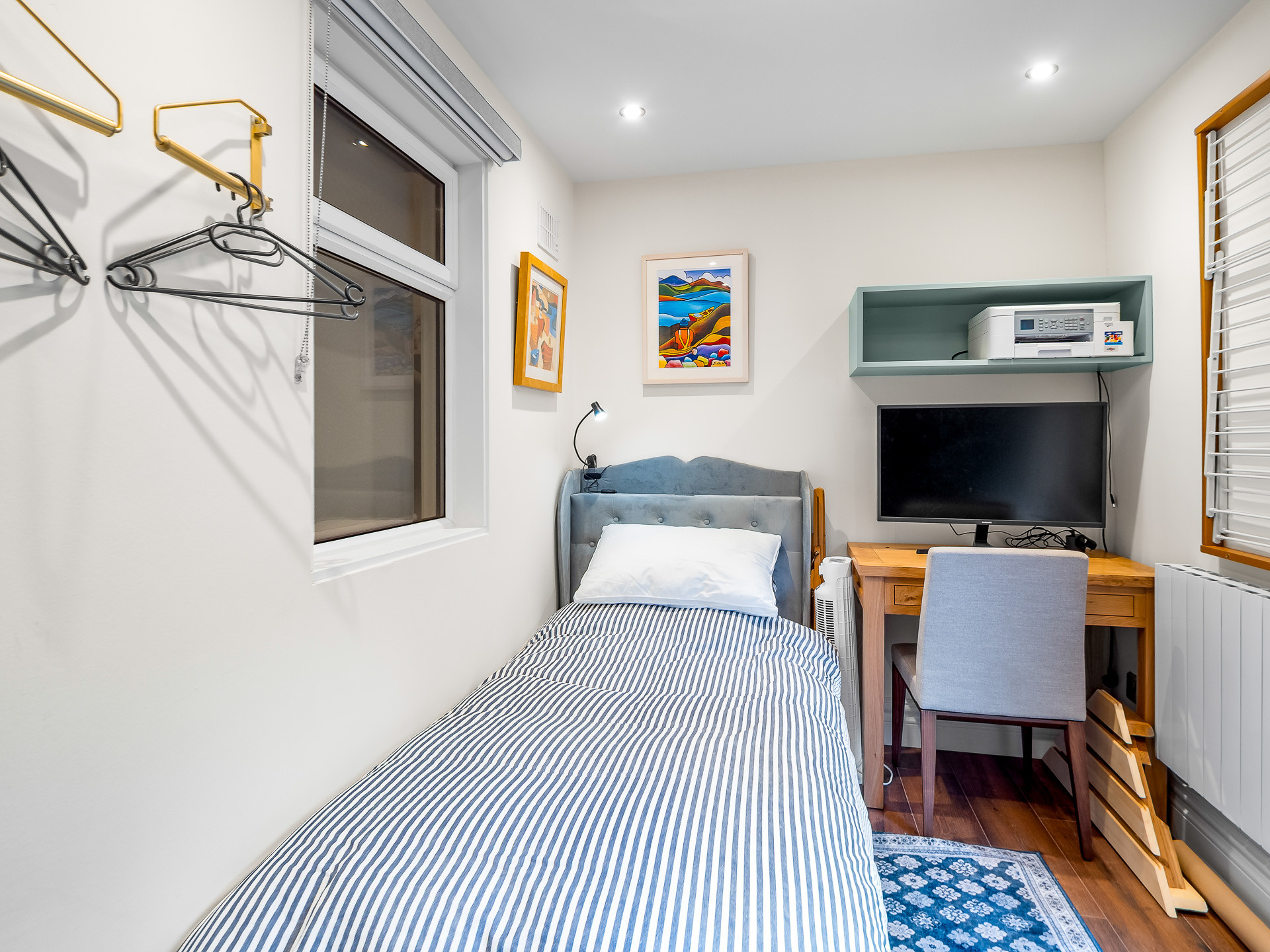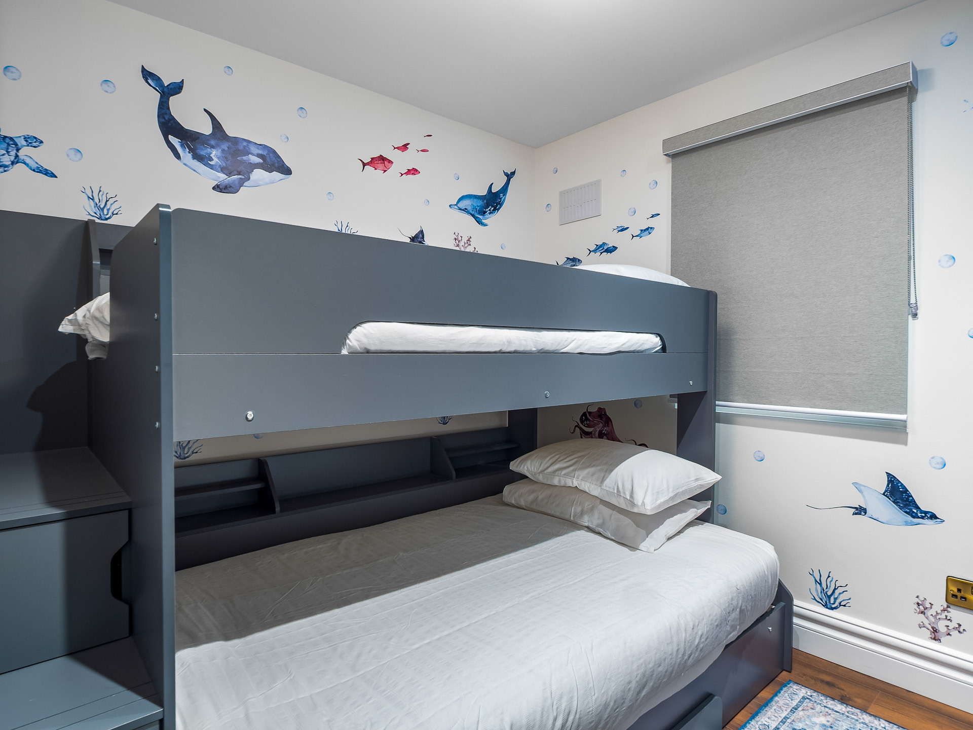 All accommodation is set across one level. The sleeping layout includes a spacious king bedroom, a bunk room, and a single room, comfortably sleeping up to five guests. A shared bathroom with shower completes the layout.