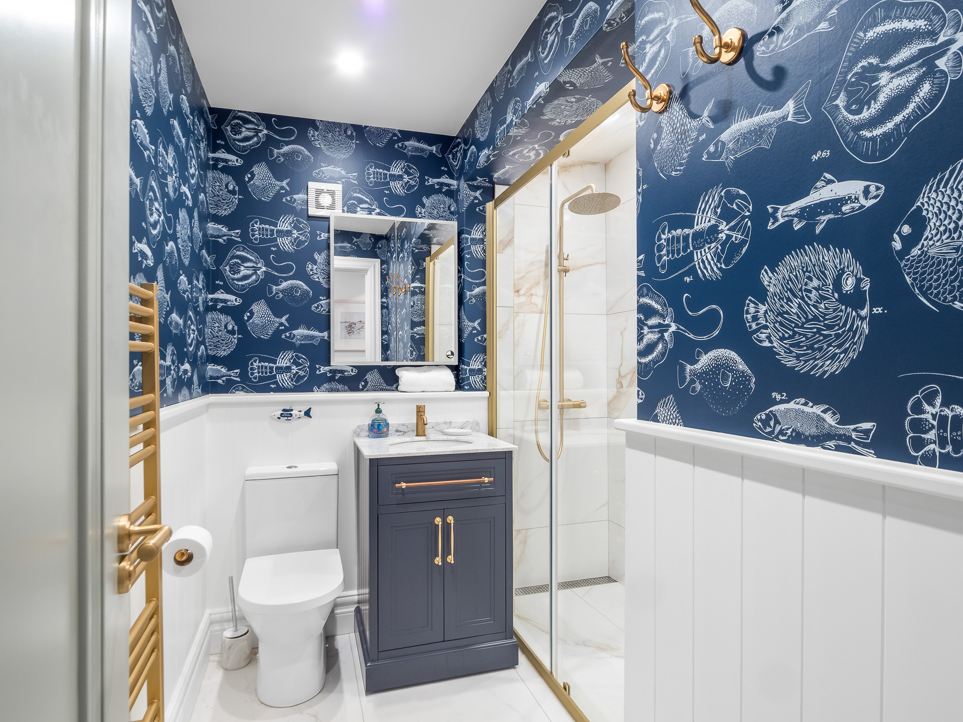 The high-spec bathroom features underfloor heating and a large shower, finished to a modern and stylish standard.