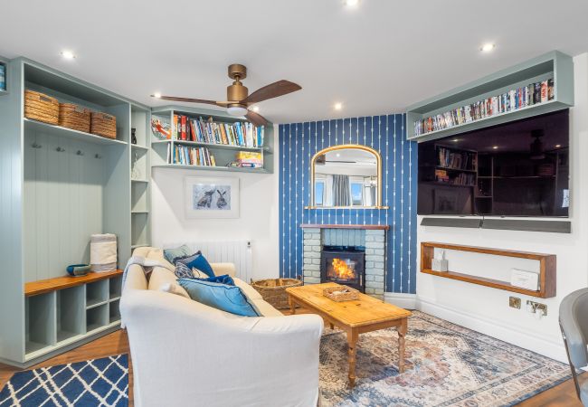 - Open-plan kitchen, dining, and living area with wood-burning stove and Smart TV
