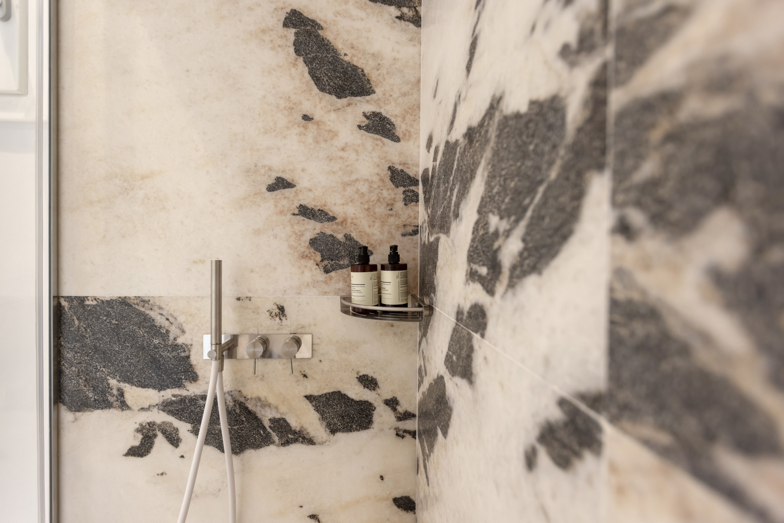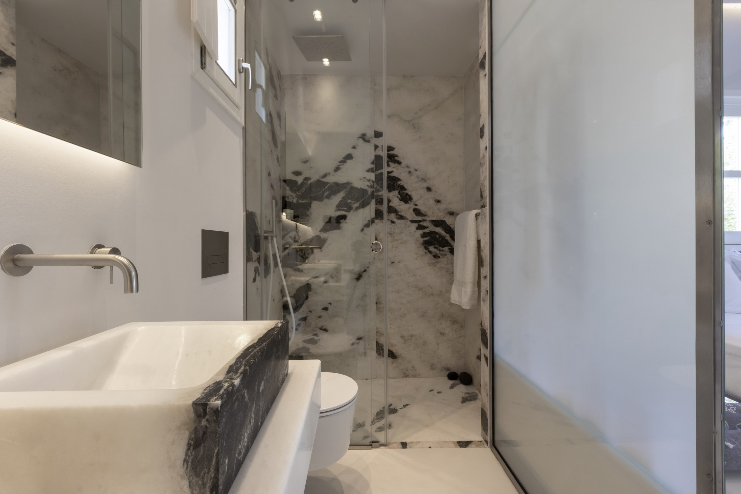 Features a luxurious walk-in shower with marble accents, dual sinks, and modern fixtures for a spa-like experience of a 5* hotel.