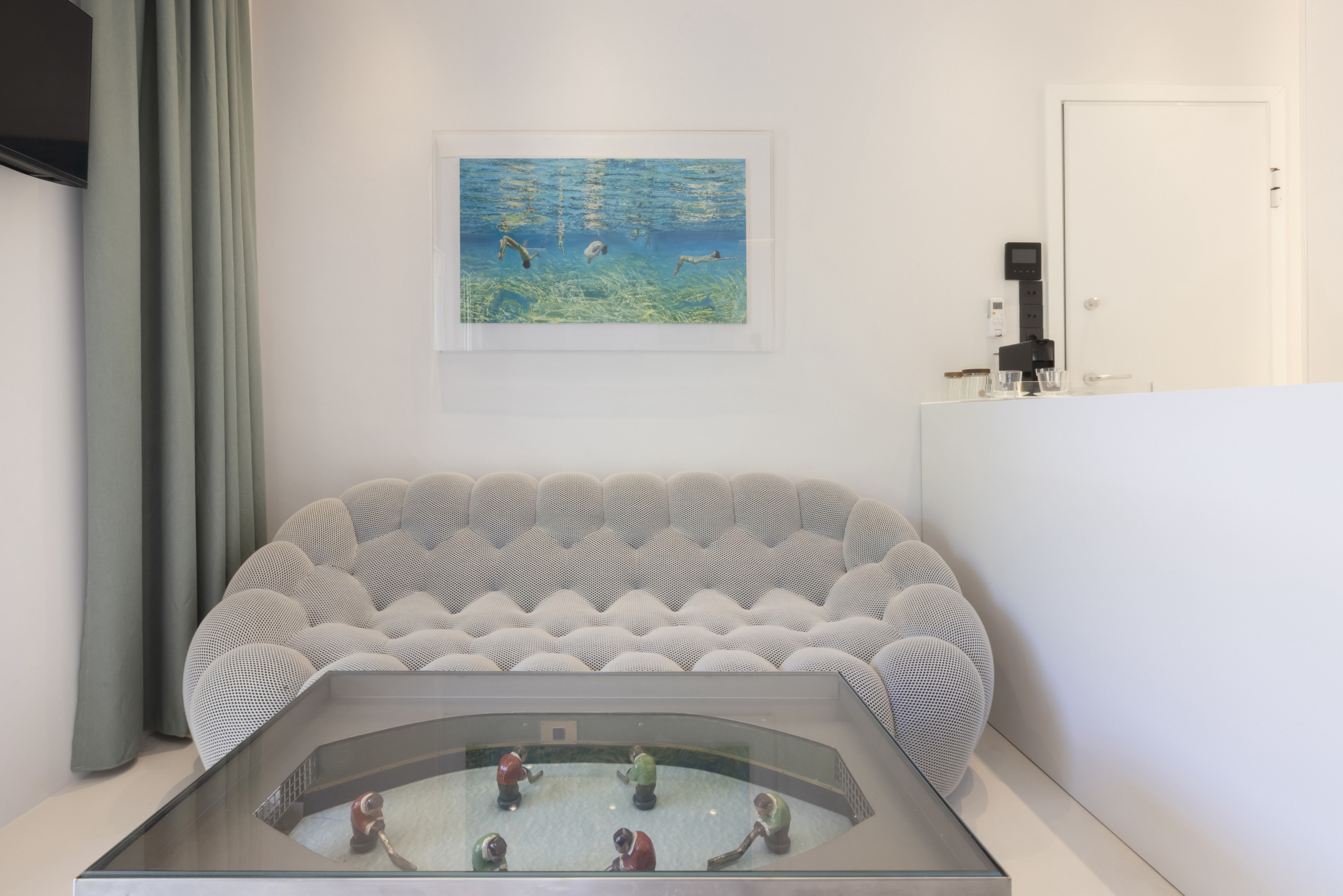 Relax on the unique, plush Roche Bobois couch while enjoying a movie on the wall-mounted flat-screen TV. The vintage coffee table doubles as a foosball game, adding a fun and artistic touch to your evenings.