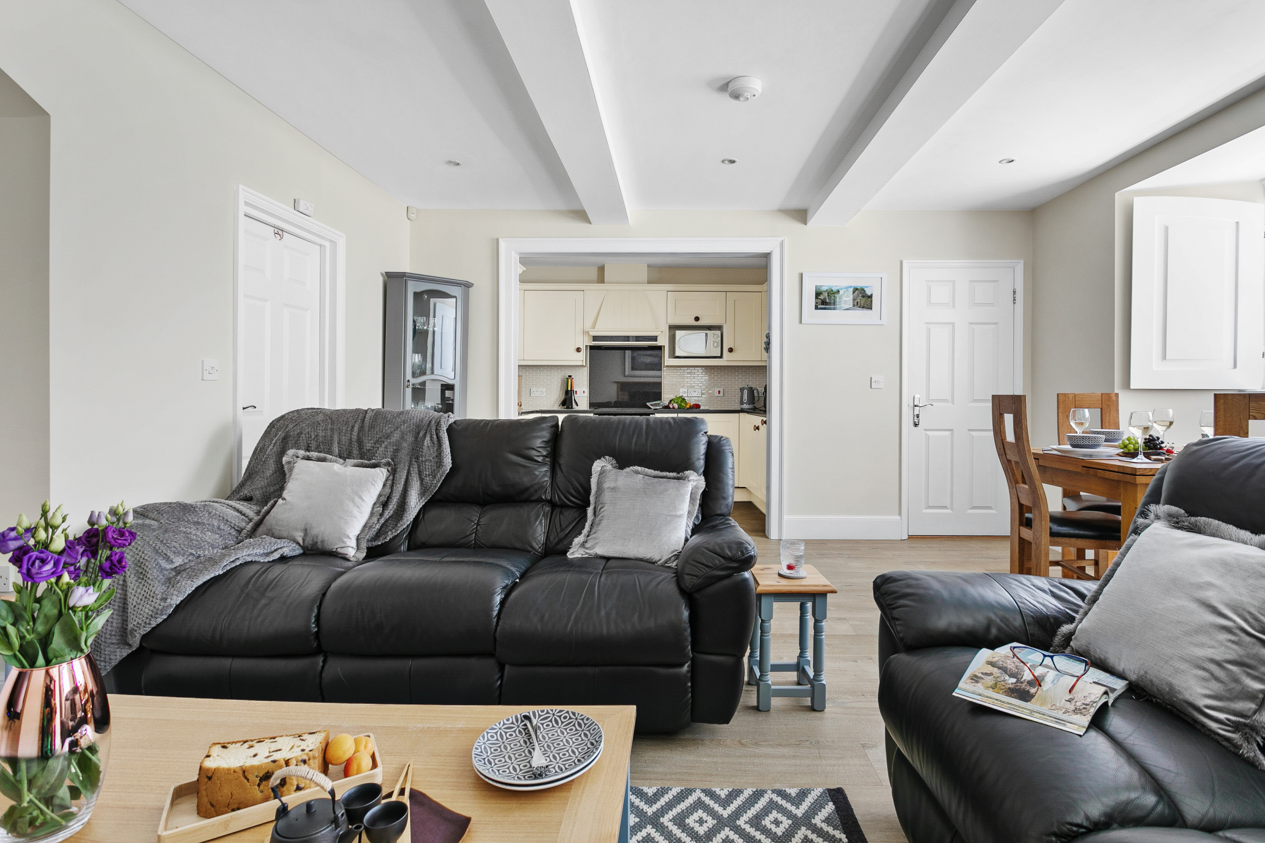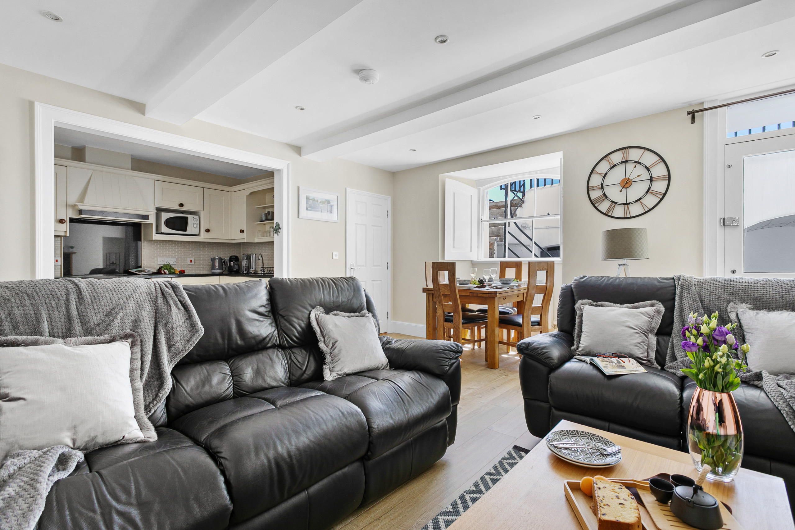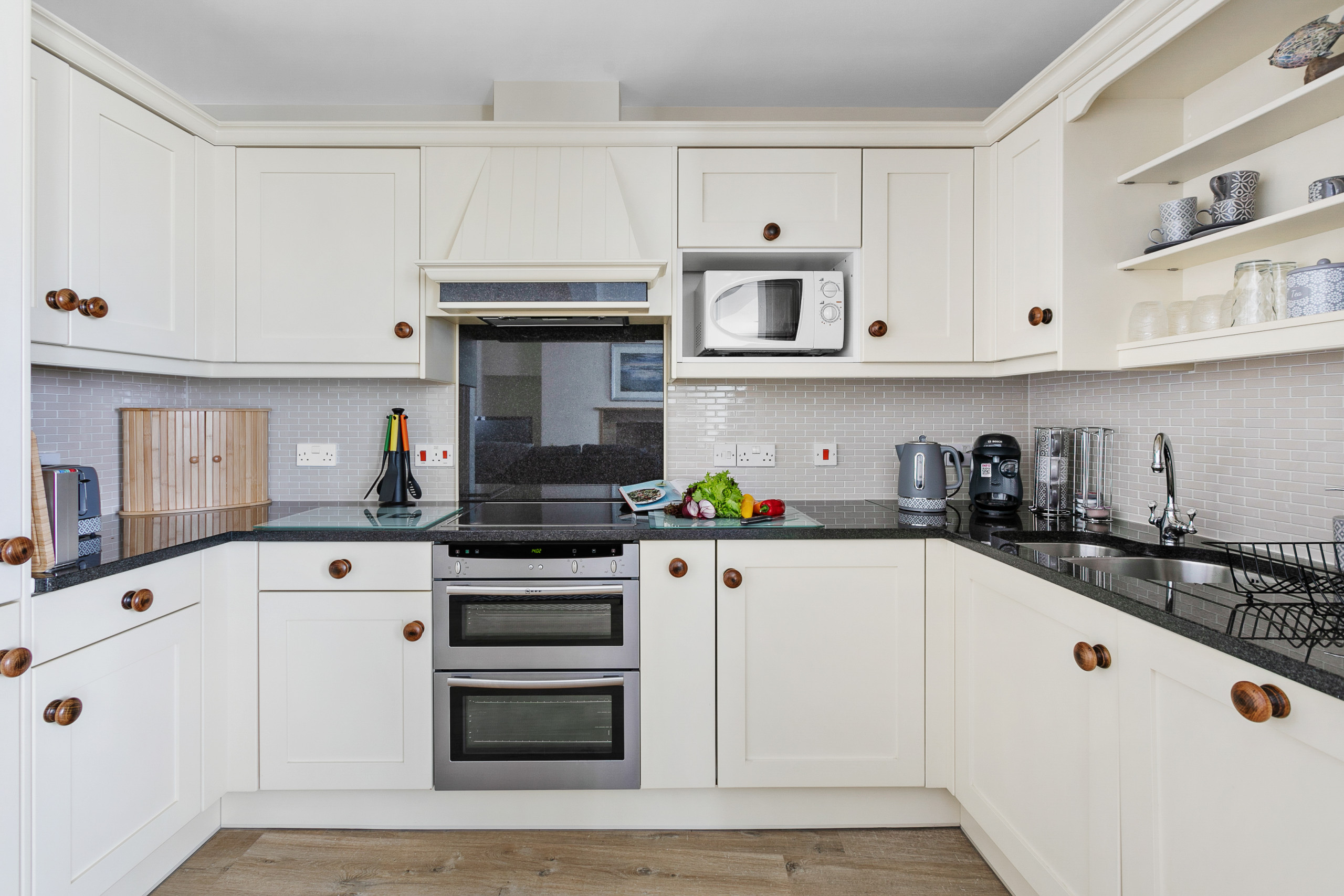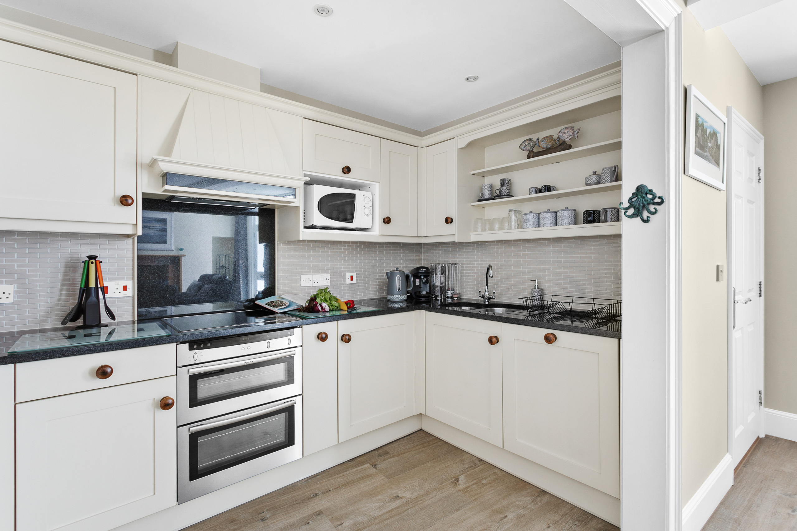 Sovereign House has been thoughtfully designed to blend original features and modern living, with a bright and spacious feel. It has its own front and back doors, but the lift can be accessed from the main building. Stow any pushchairs, bikes, muddy shoes or sandy flip-flops in the large locked front porch and enter the inviting living area. This lovely room, complete with wooden window shutters and quality oak-effect flooring, is great for entertaining and catching up over a glass of something chilled at the generously sized dining table. Or head over to the comfortable recliner sofas for a lovely cosy place to relax with a mug of tea. Across from the living area is the open kitchen, fully equipped with modern appliances, ideal for making everything from a hearty breakfast to a light lunch or rustling up a feast!