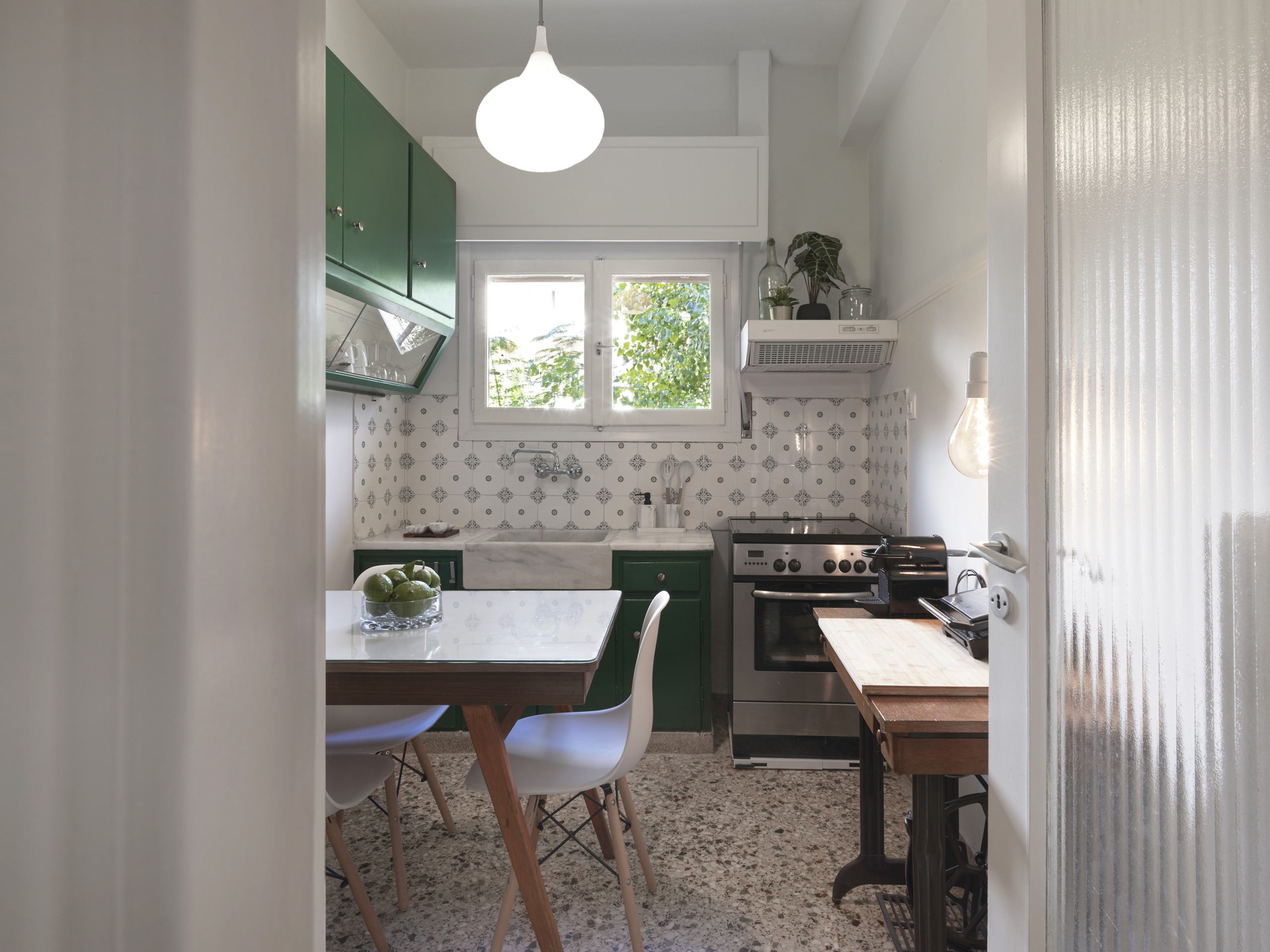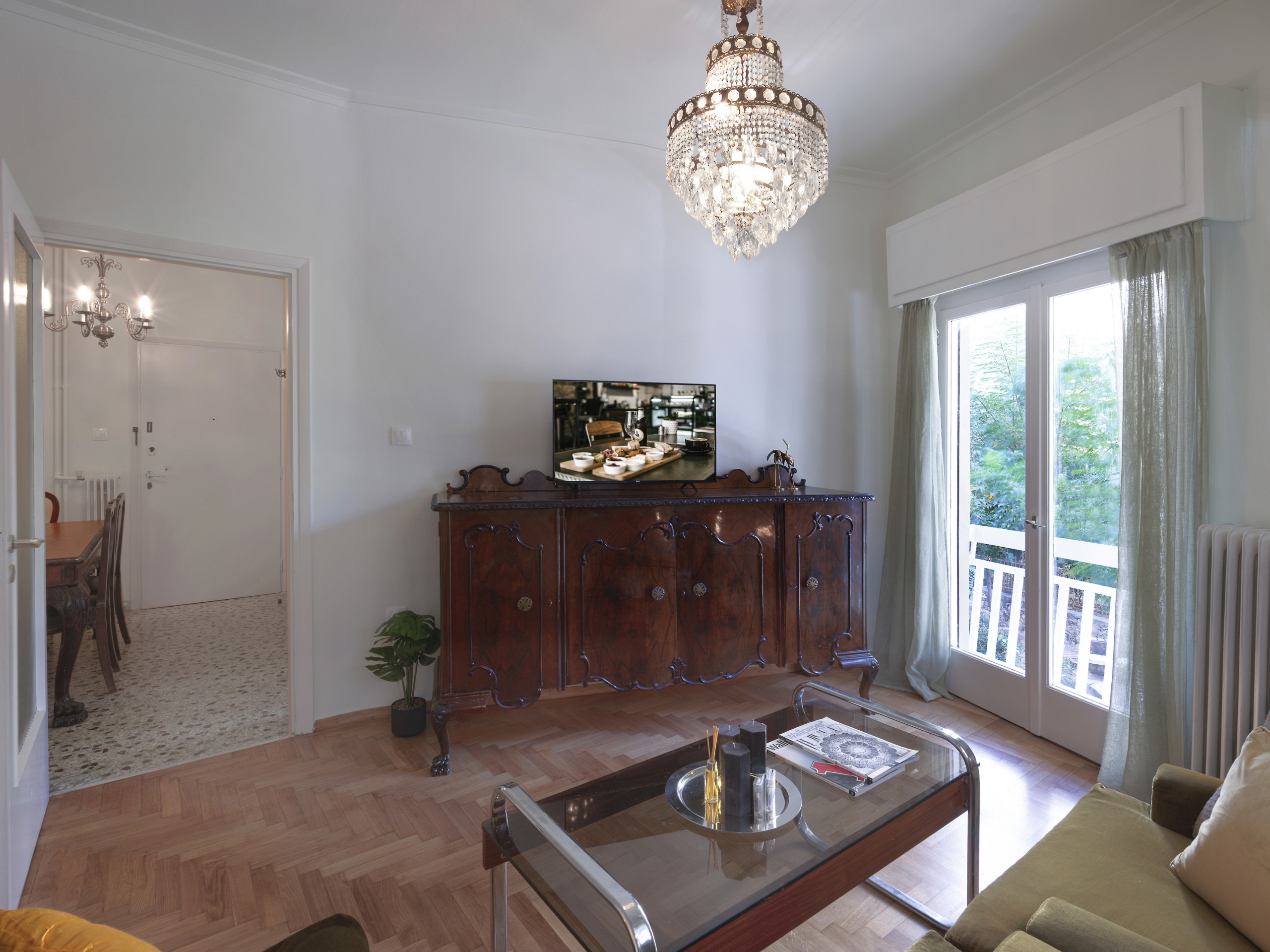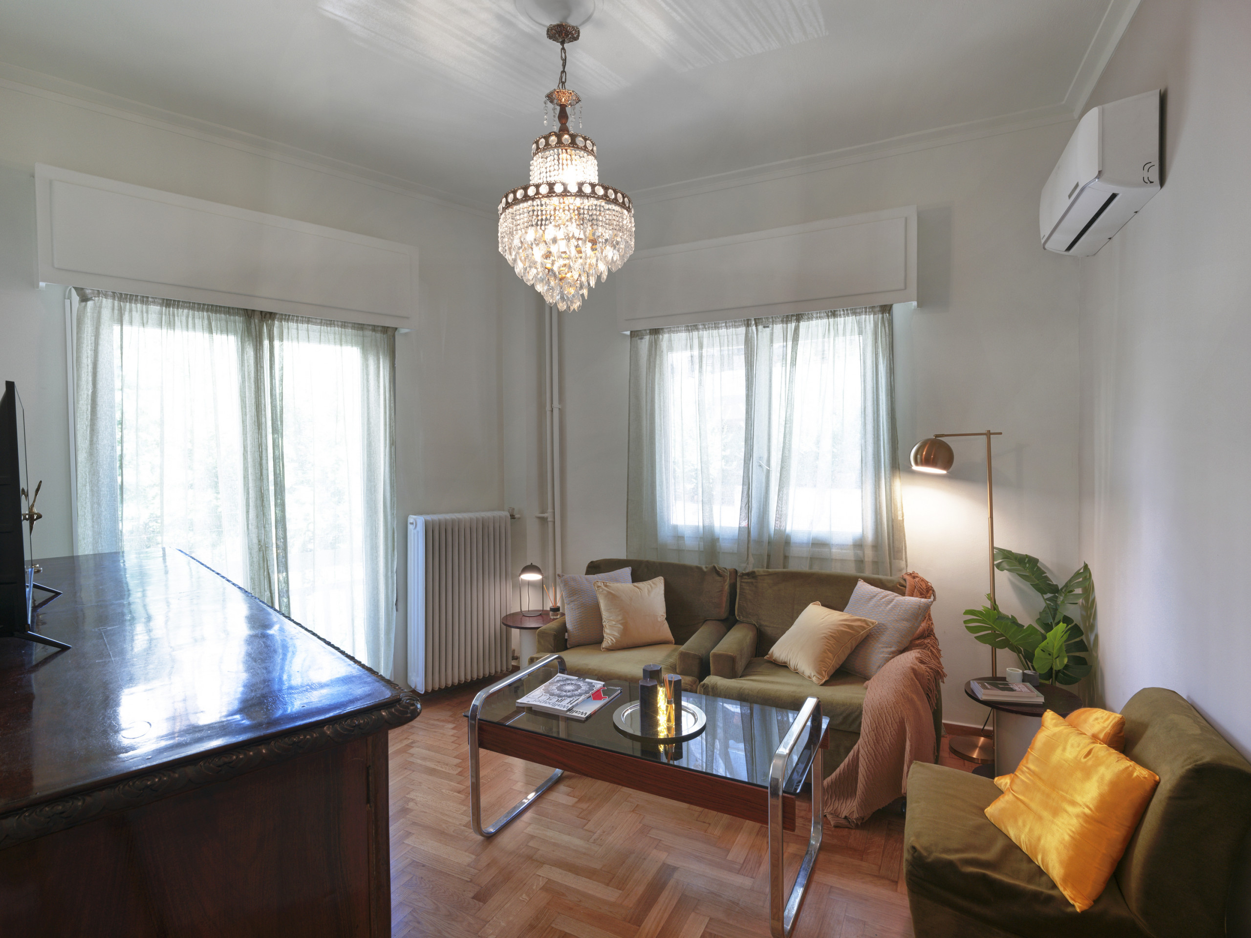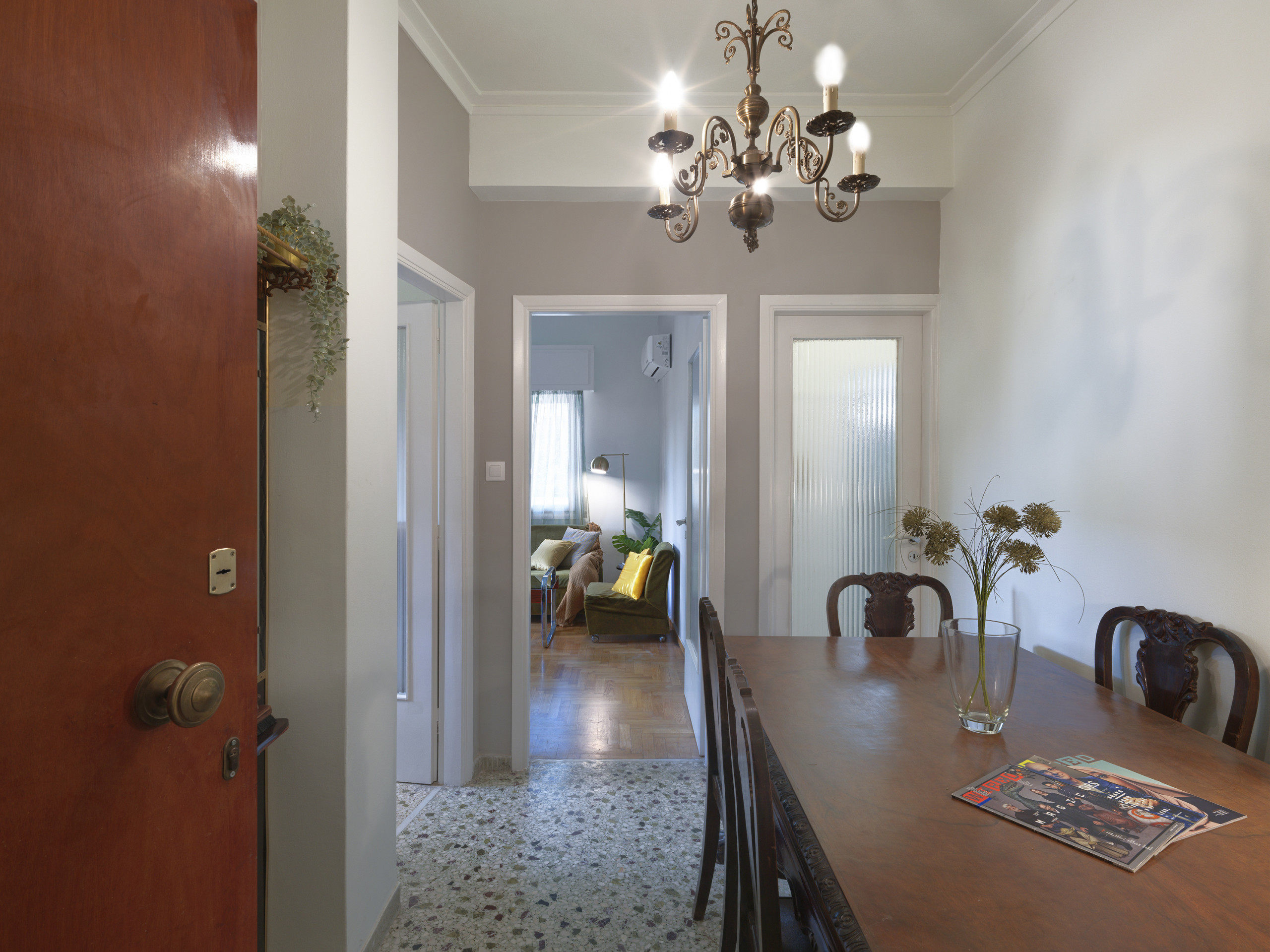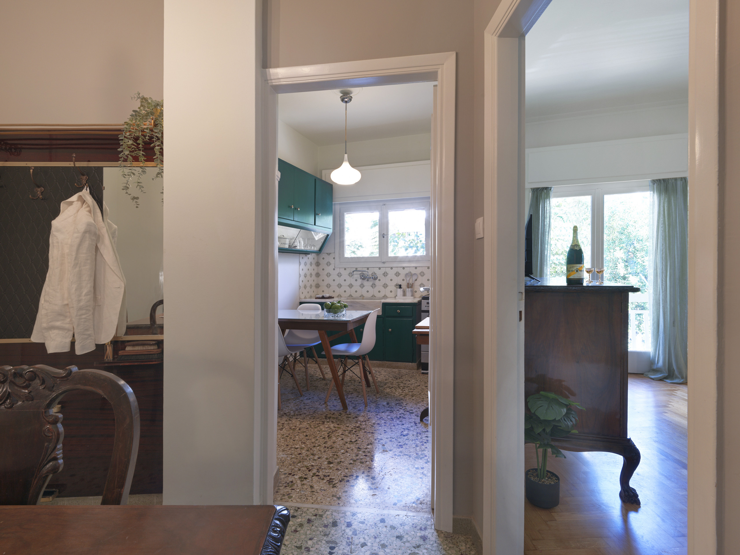 Mosaic floors lay the foundation for this unique space. The living room is a perfect fusion of old and new, with carefully selected vintage furniture pieces that resonate with the past. It's a space where nostalgia meets contemporary style, creating an ambiance that's both inviting and intriguing.