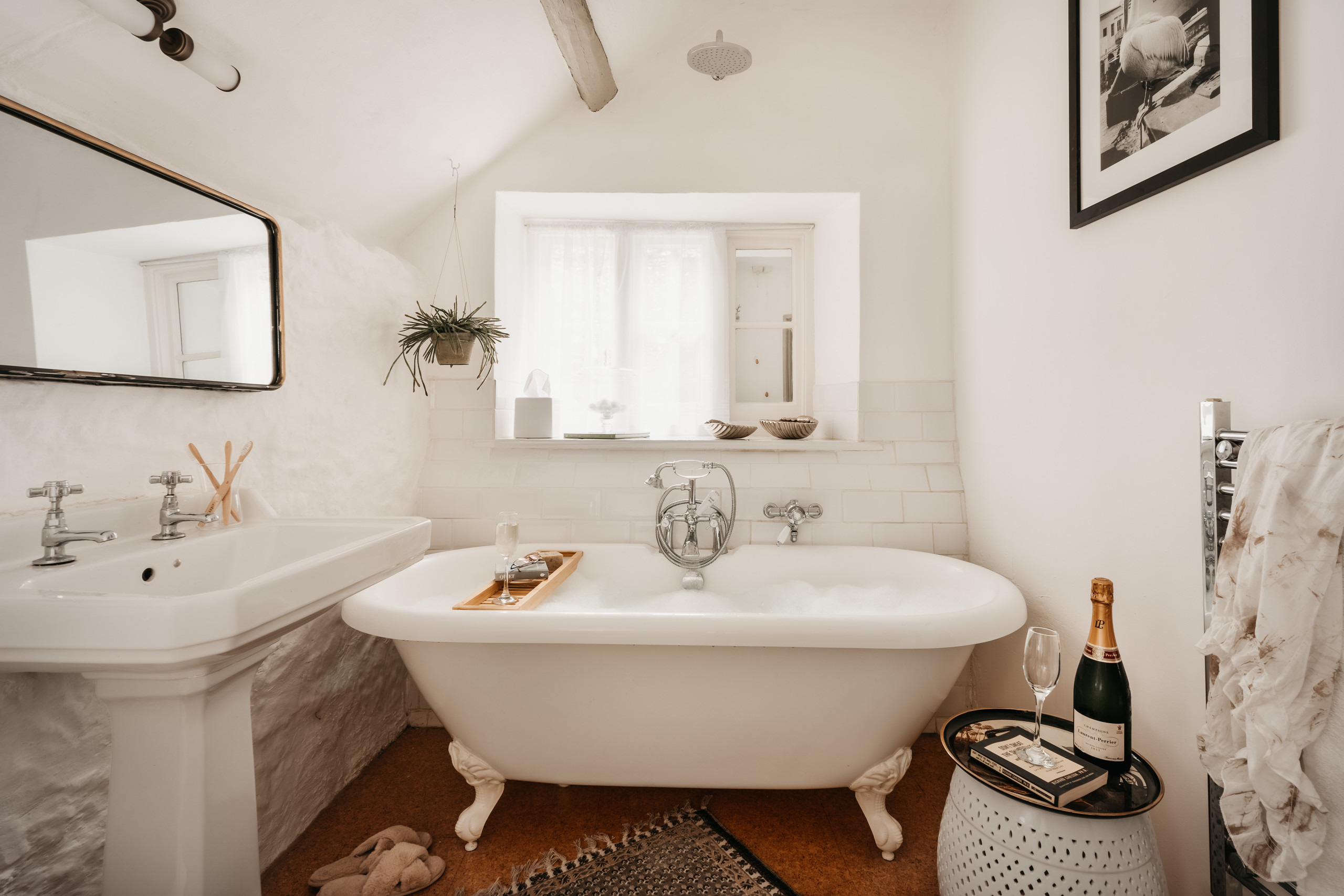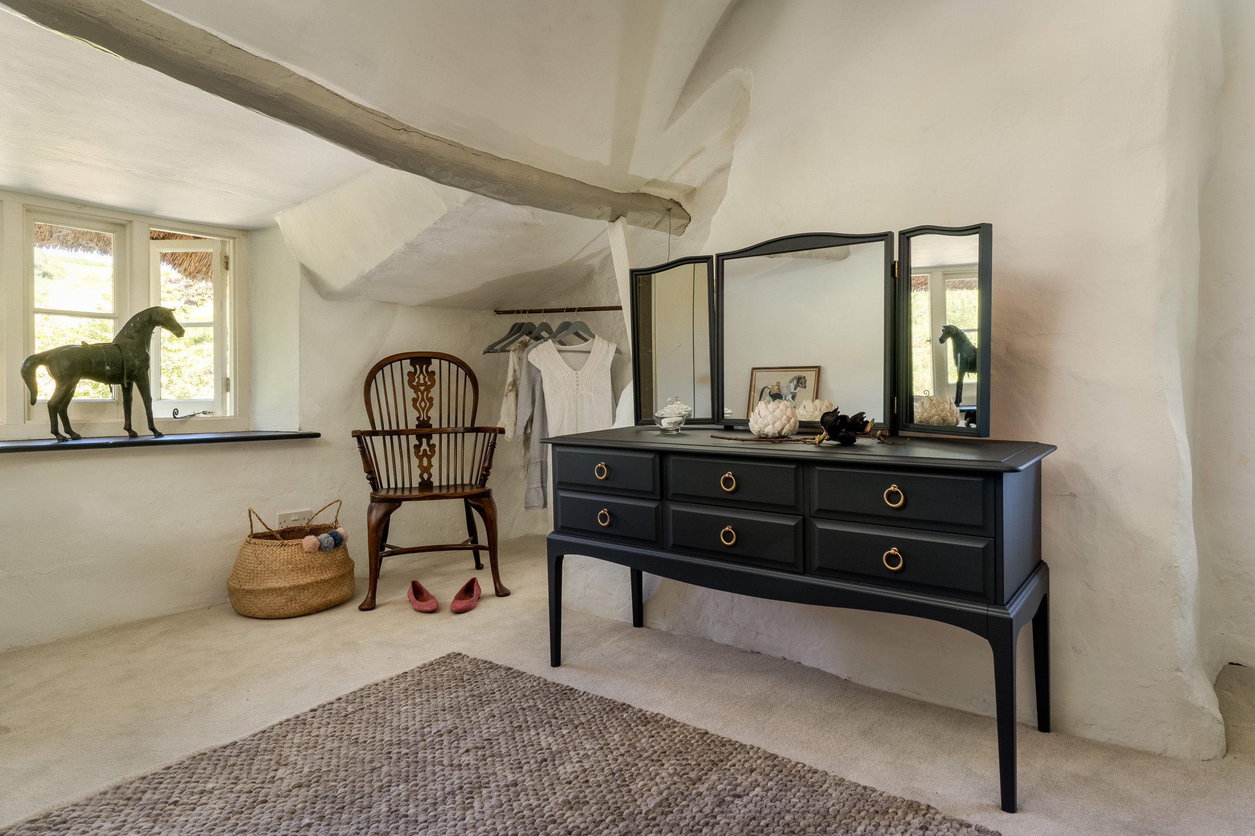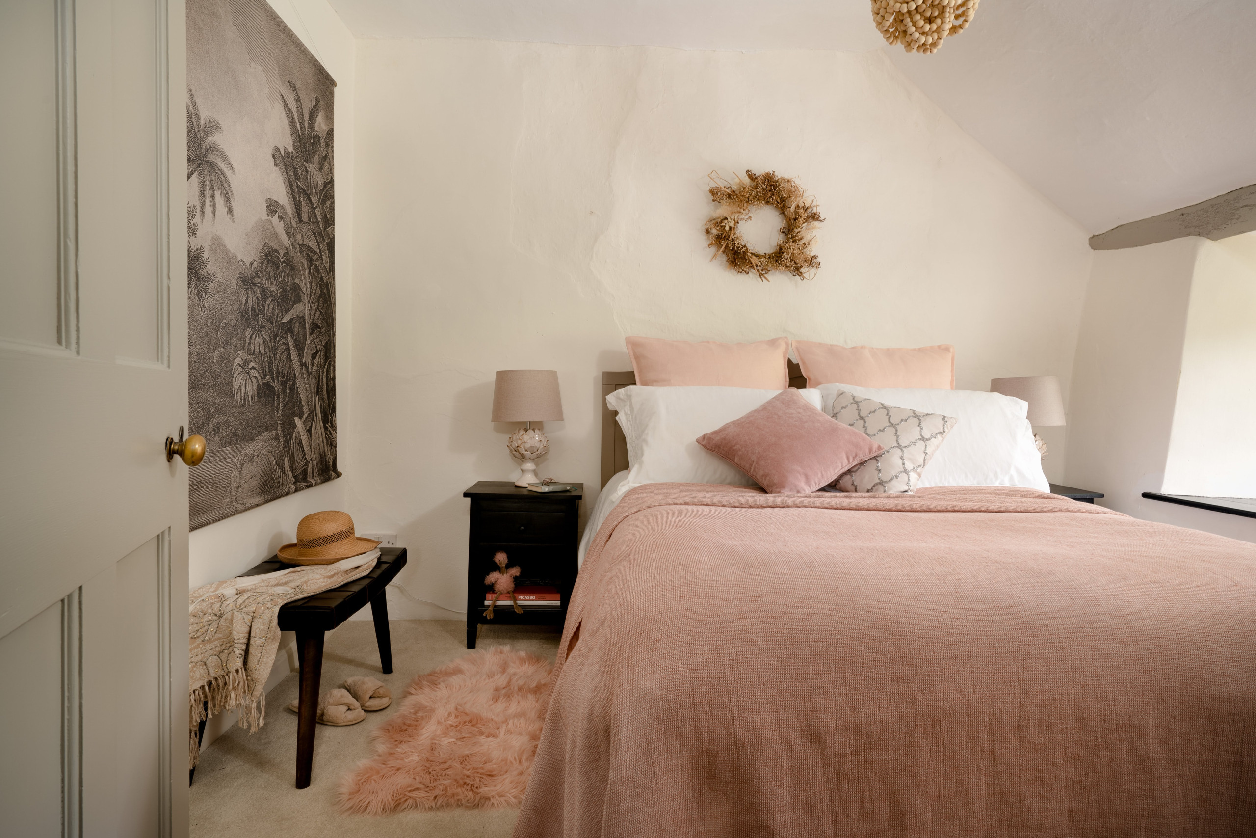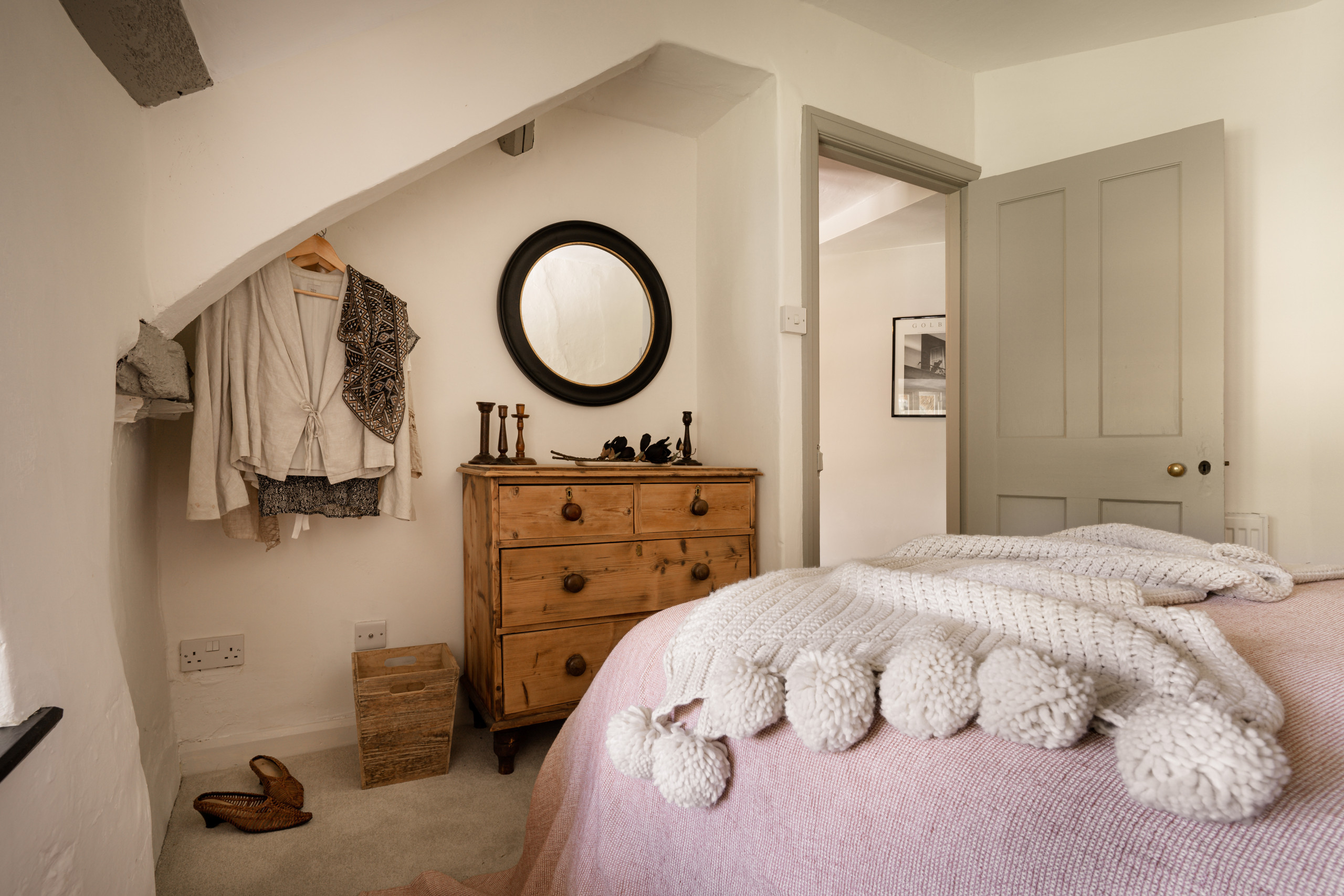 Three charming bedrooms and a sumptuous family bathroom are upstairs. The spacious master bedroom, decorated in stylish greys, boasts a super-king-size bed tucked under pretty eaves; the second double bedroom is a symphony of natural fabrics, textures and vintage art; while the cosy third single bedroom has views over the garden and abundant vegetable patch.