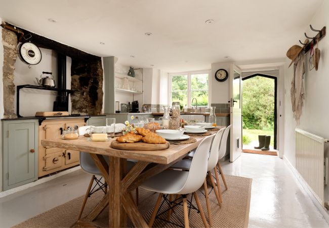 Accessed from a winding country lane, a sweeping gravel double-entrance horseshoe drive provides plenty of parking for up to six cars. Enter the front porch – a great space to leave your wellies – and you’re straight in the open-plan kitchen and dining area, decorated in tasteful greys with comfy rugs underfoot. There’s a real sense of home – imagine padding downstairs in the morning to cosy up by the Rayburn while you make your coffee. This is complemented by an electric oven, induction hob and washer-dryer. A large table makes for fabulous cosy suppers during cooler winter months. A handy utility corner houses a microwave and huge American-style fridge-freezer – great for storing your plunder from Chagford’s delis.