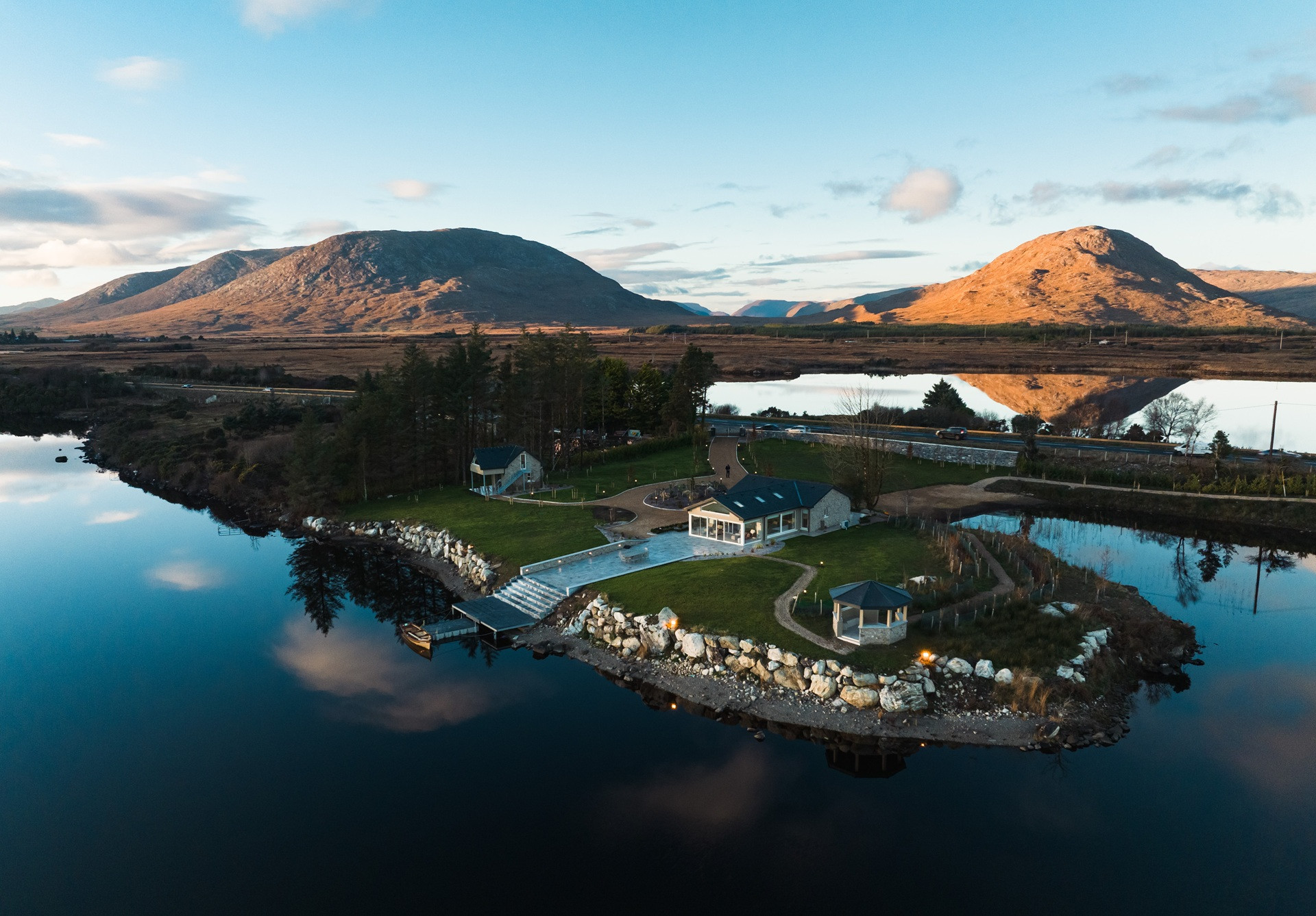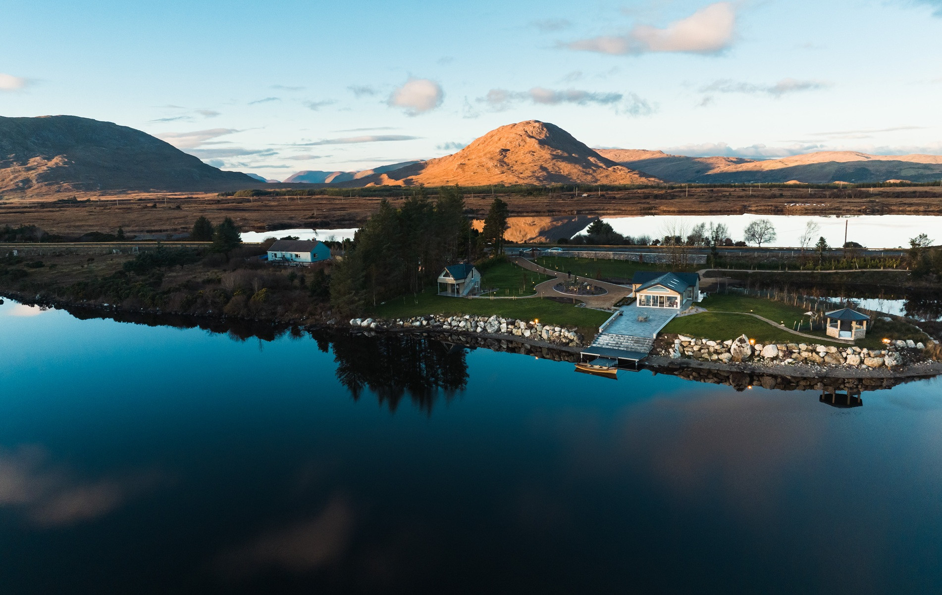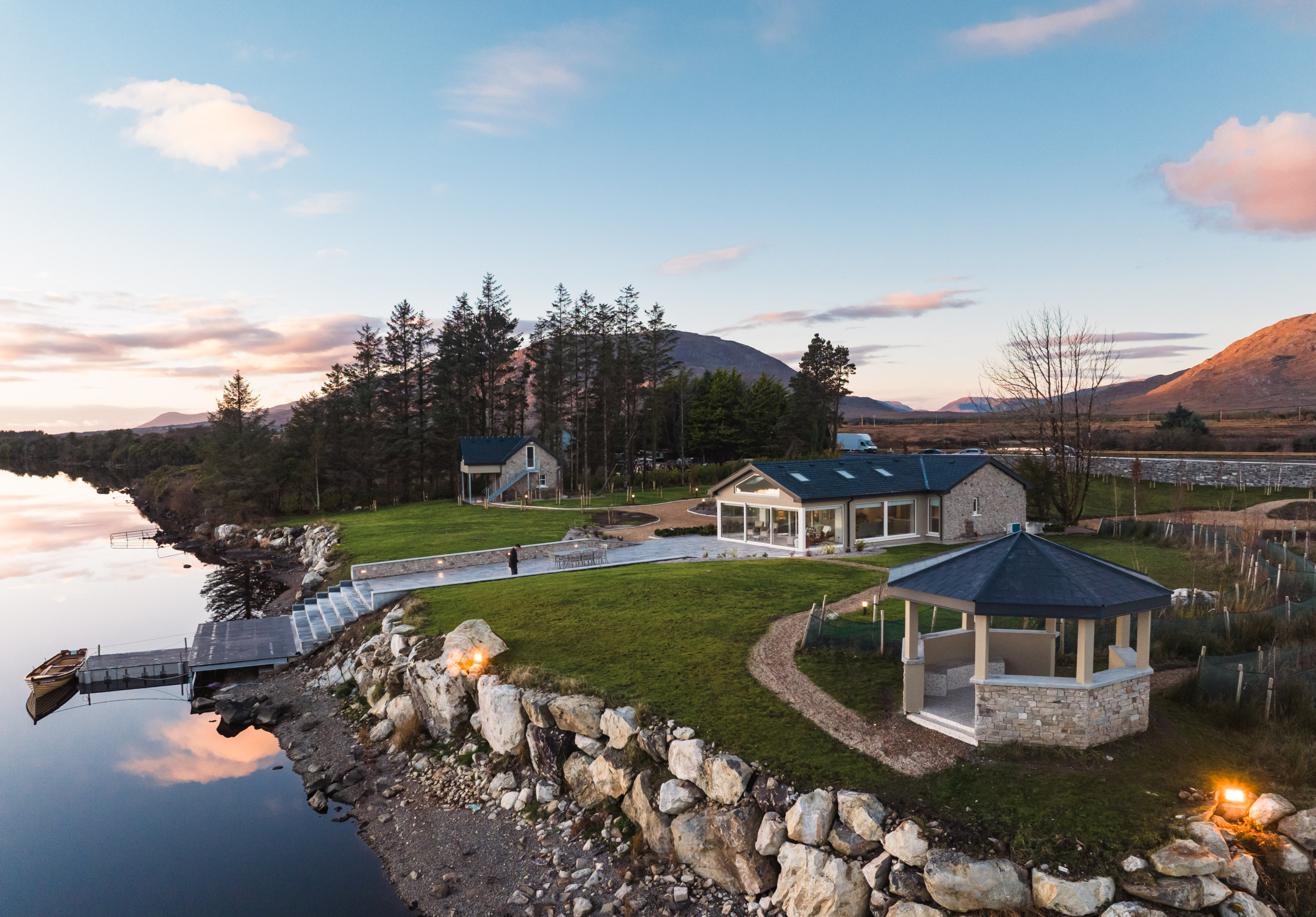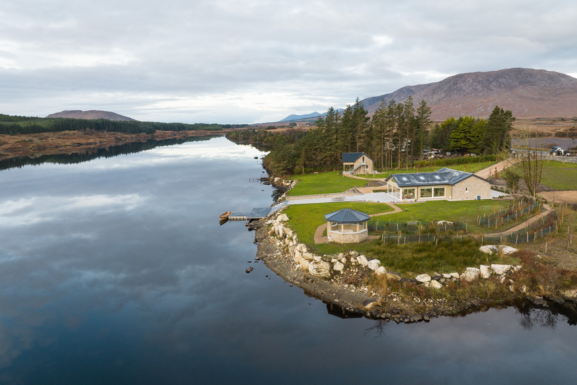 Eagle Cottage stands as a testament to refined luxury nestled within the untouched beauty of Connemara. This exquisite main house, designed to accommodate up to 8 guests, features four king-sized beds in bedrooms that all boast stunning lakeside views, ensuring every morning awakens you to the serene beauty of nature. The interior speaks volumes of elegance and comfort, with each room finished to the highest standards, promising an unparalleled stay. The attention to detail is evident in the modern conveniences provided, from state-of-the-art Smeg appliances that make the kitchen a gourmet's delight, to the indulgence of an electric fire and underfloor heating that adds a cozy warmth throughout the house. The living experience at Eagle Cottage is further enhanced by the inclusion of luxury amenities tailored to each guest's comfort. Enjoy the convenience of a high-end coffee machine for those peaceful mornings, free Wi-Fi to keep you connected to the world, and the unique feature of individually controlled temperature channels in every room, allowing for personalized comfort. The property's commitment to excellence is clear in every aspect, from the practicality of new appliances to the aesthetic pleasure of its design, making it not just a place to stay, but a retreat to remember. Eagle Cottage invites you to immerse yourself in an environment where luxury and tranquility coexist, set against the backdrop of Connemara's breathtaking landscapes.