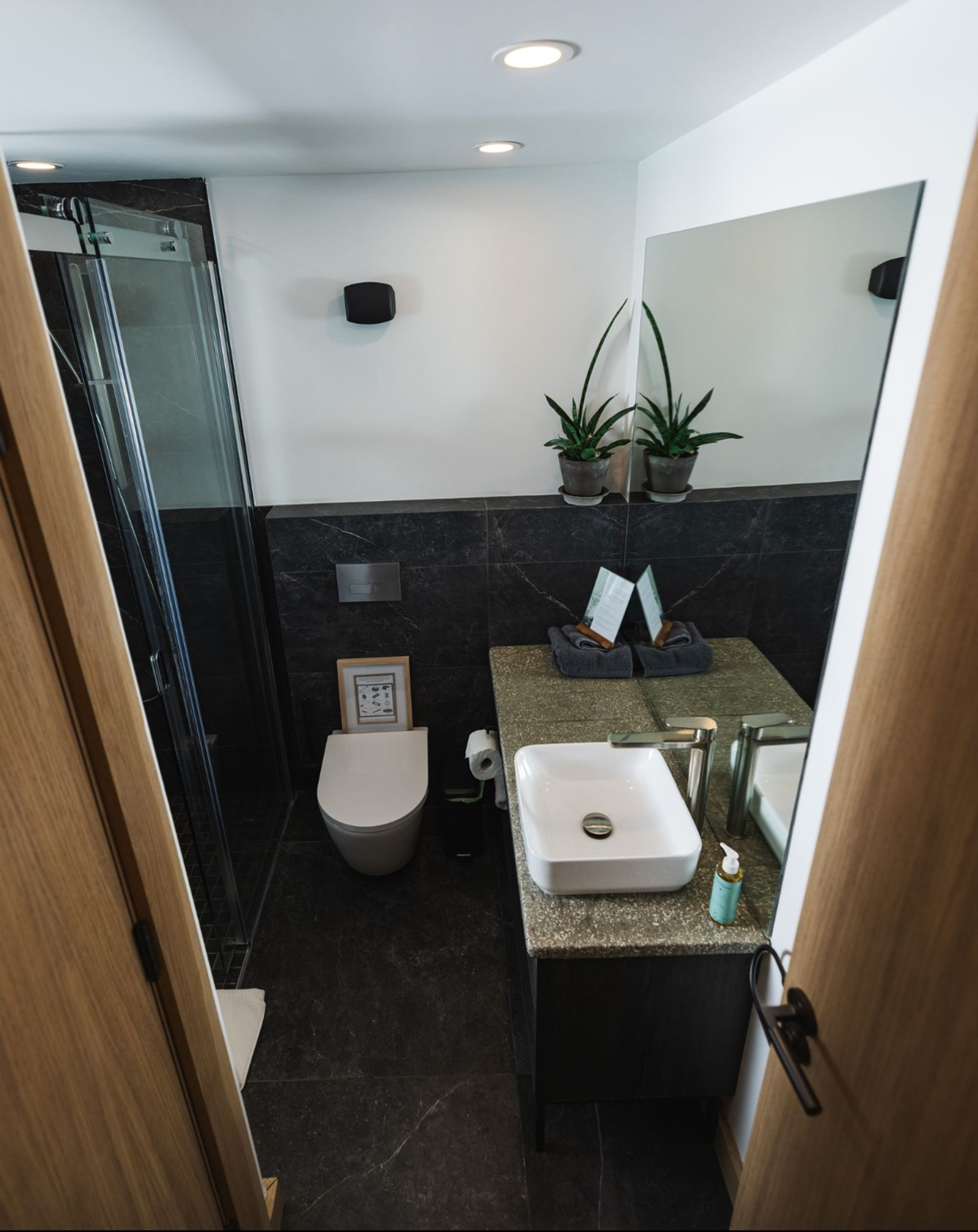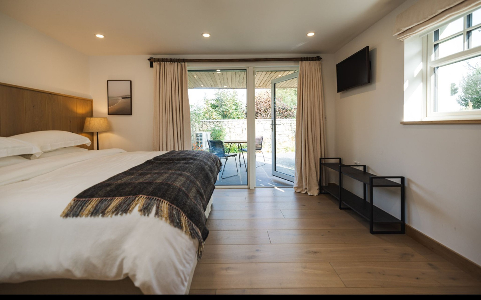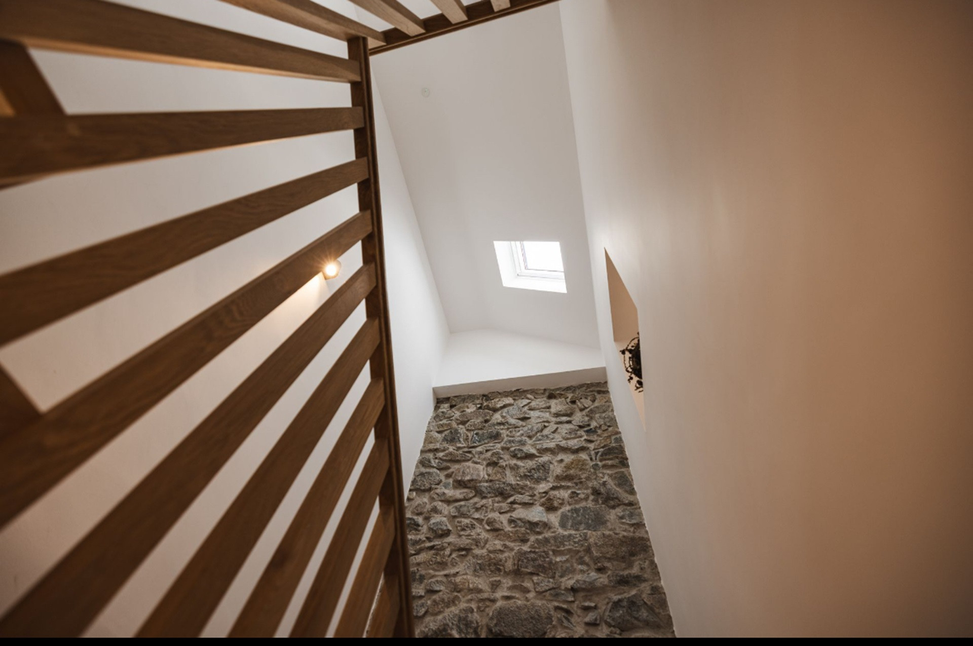 The third bedroom is rear facing, en-suite, with sloped ceilings and natural stonework and has no sea or courtyard views.