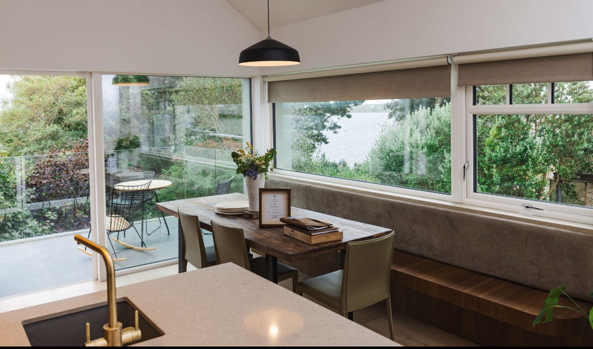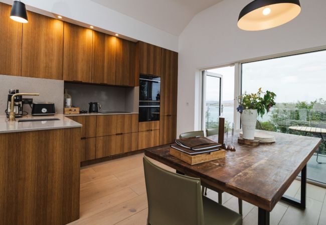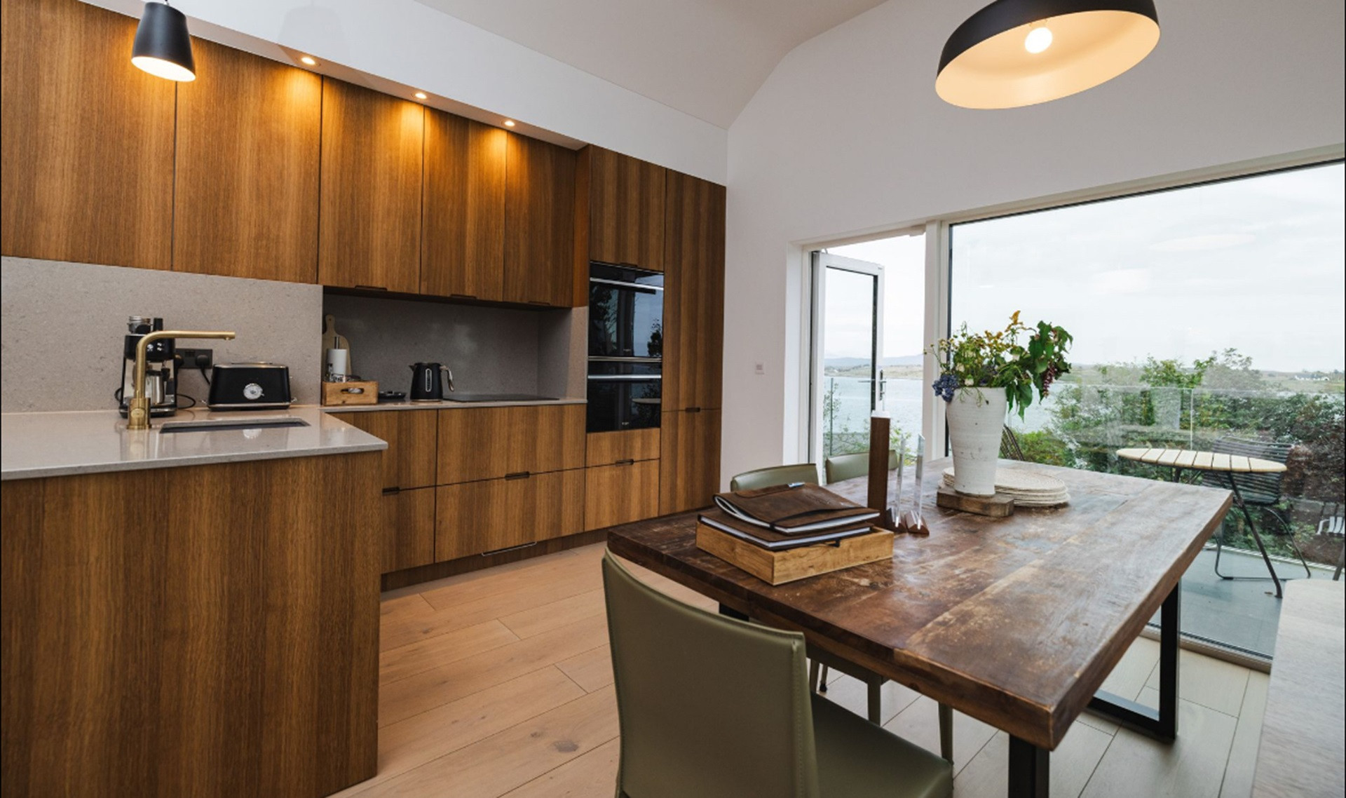 26.9 sq metre First Floor Living, Kitchen / Dining Space with large outdoor balcony with Sea Views to the rear off the kitchen