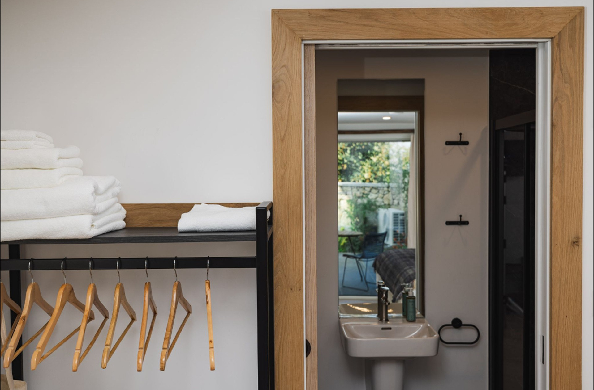 The en-suite master bedroom is on the ground floor with a large private terrace accessed through double doors with sea views. The second ground floor bedroom is courtyard facing but hidden away from other guests through careful planting and window coverings. The bathroom for this bedroom is directly across the hall. The third bedroom is on the first floor and has a built in bunk bed above the King Size bed to facilitate an extra guest.
