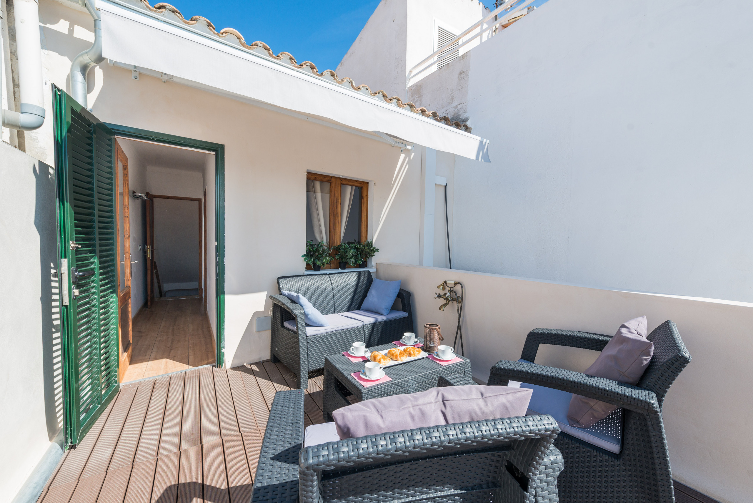 This first floor duplex apartment accomodates up to 9 persons and counts with a private roof terrace with sunbeds, dinner table and barbecue. It is situated in the historic oldtown of Alcudia, with all you might need at walking distance.