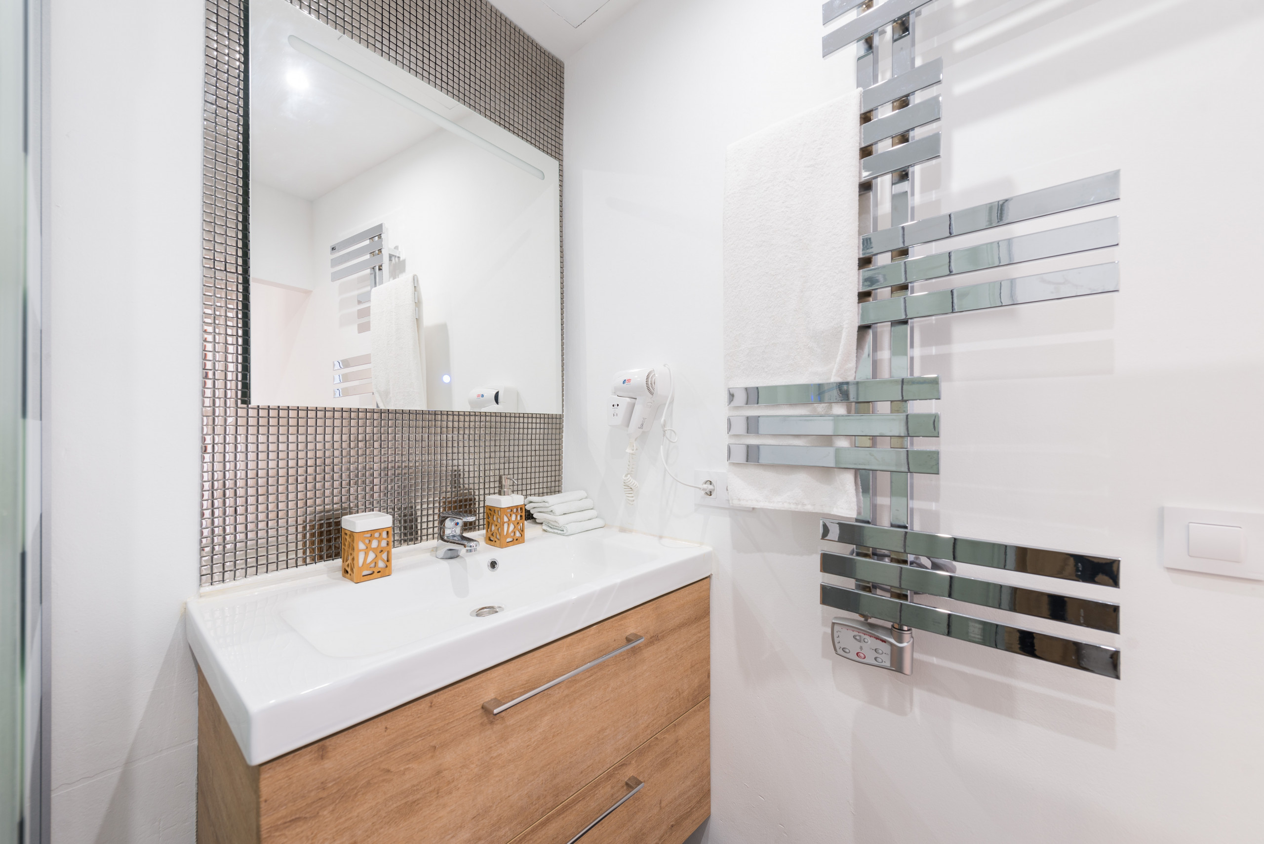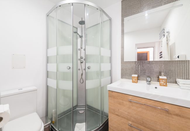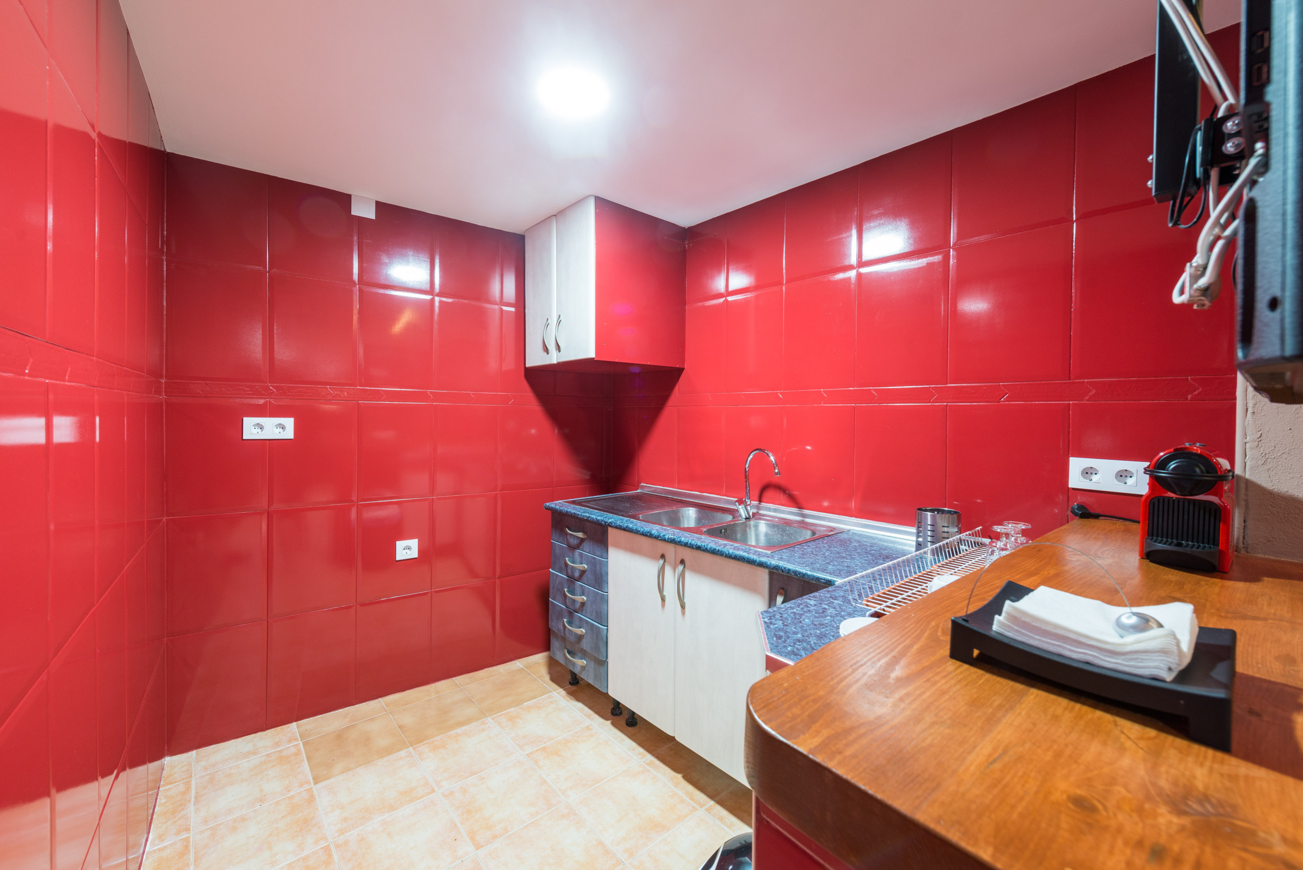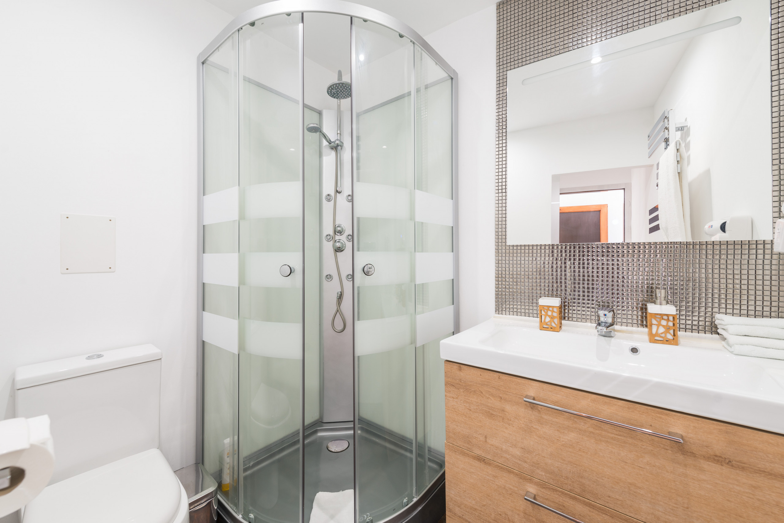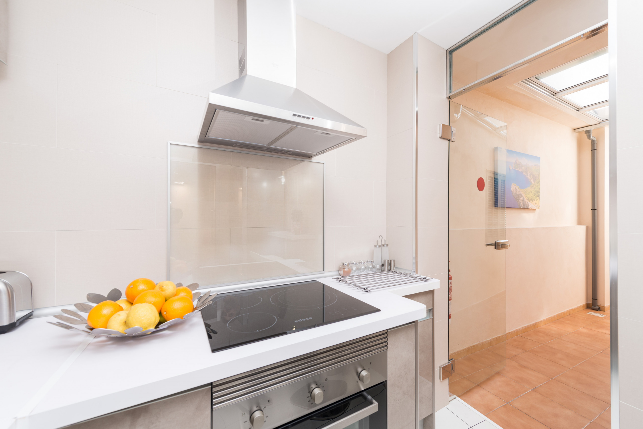 The stairs lead us from the front living room to the next floor, where we find a study room and three bedrooms (one with a double bed, one with two individual beds and one with space to prepare an extra bed for up to 2 extra persons). The study room provides access to the large roofterrace, perfect for sunbathing and outdoor dining. There is an exterior shower room on the terrace. The apartment counts with a washing machine and an iron, and we can prepare a baby bed and a high chair without any cost. The stairs count with child protection (gate) on both sides.