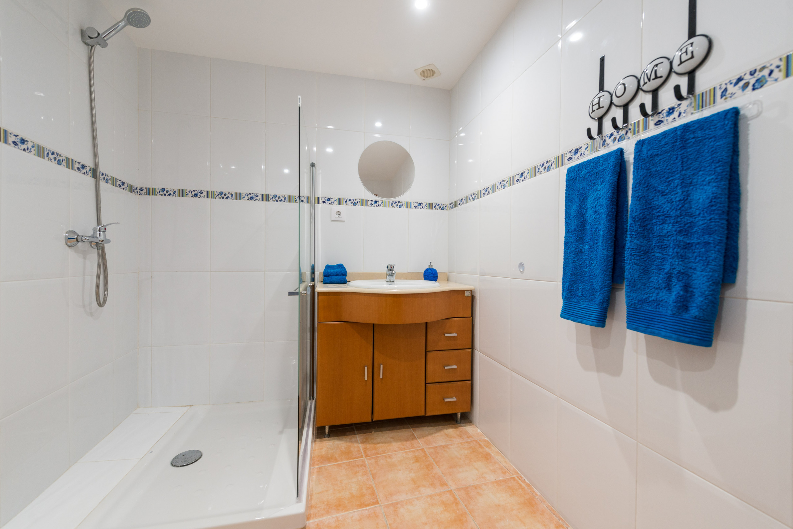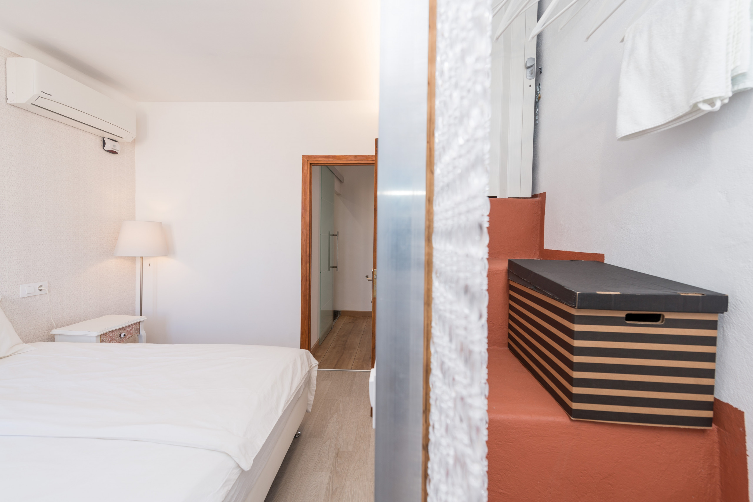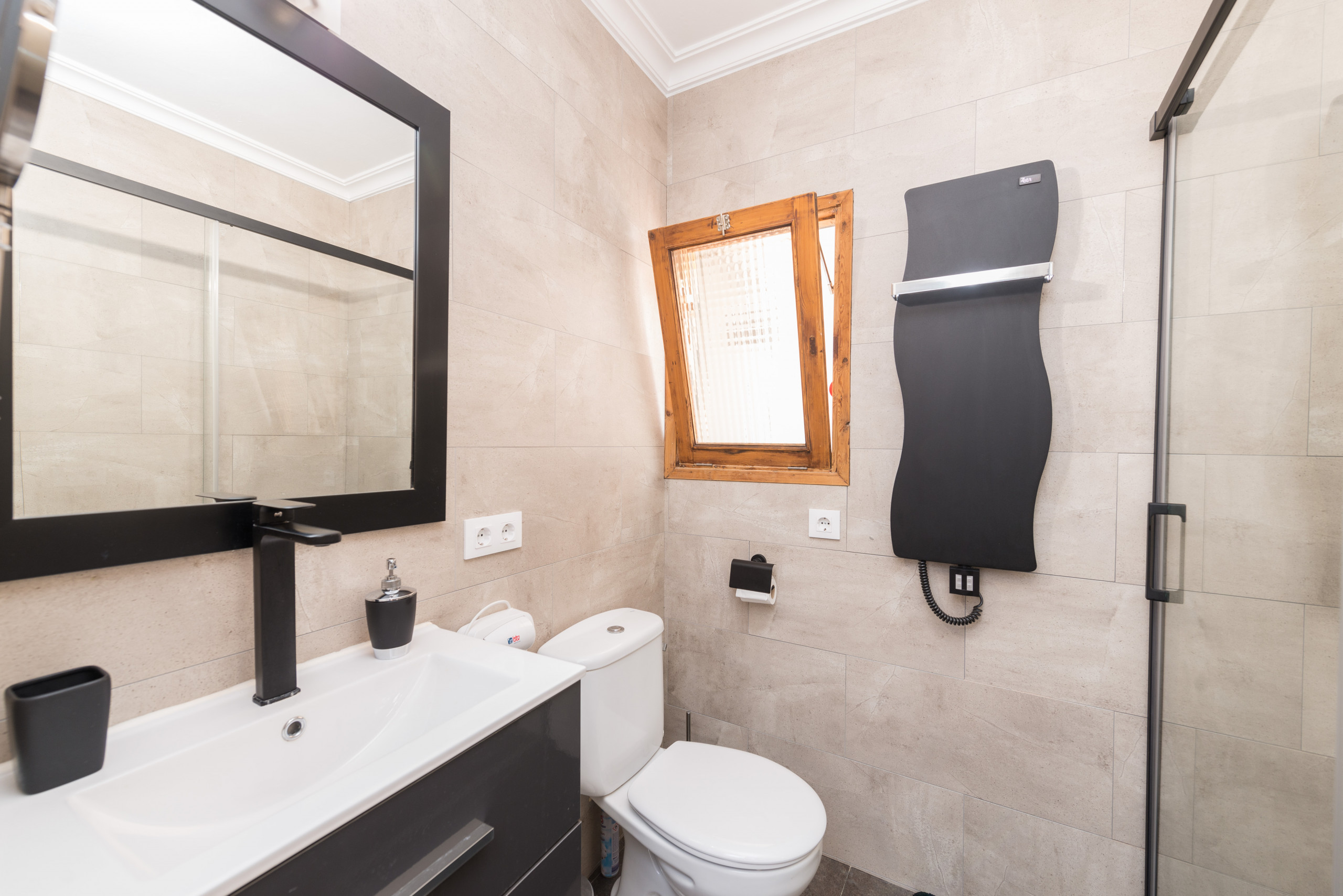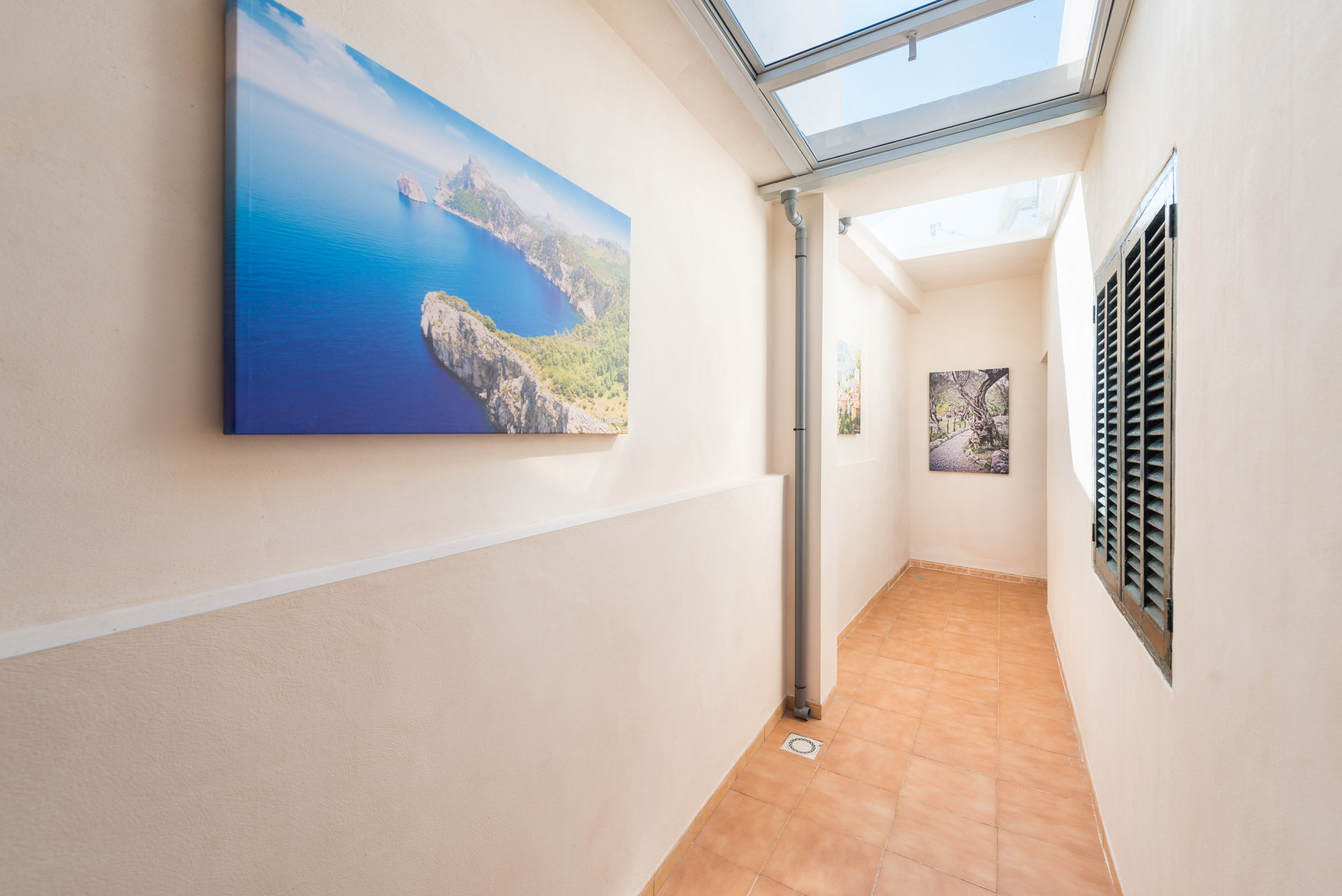 This two-floor apartment counts with 5 bedrooms and 2 bathrooms. We enter the first floor onto a spatious living and dining room, divided in 3 spaces: a seating area with a sofa and a balcony to the pedestrian street, a dining area with a large table for 6 and a living- and dining room with kitchenette, sofa, smart TV, typical majorcan rocking chairs and another dining table for 6. The fire place is only decorative (not for use). The whole accommodation is equipped with air conditioning (cold/heat function). The kitchenette counts with a dishwasher, an oven and all further necessary utensils to prepare a tastefull dinner for the whole group. The dining kitchen provides access to the patio, with a dining table for 6 , where you can enjoy the fresh air even on the warmest days. The hall surrounding the patio leads us from the dining kitchen to a bathroom with a shower tub and to two of the bedrooms: one with a double bed and one with a large twinbed (1,20m), both with a window to the luminous hallway and the patio.