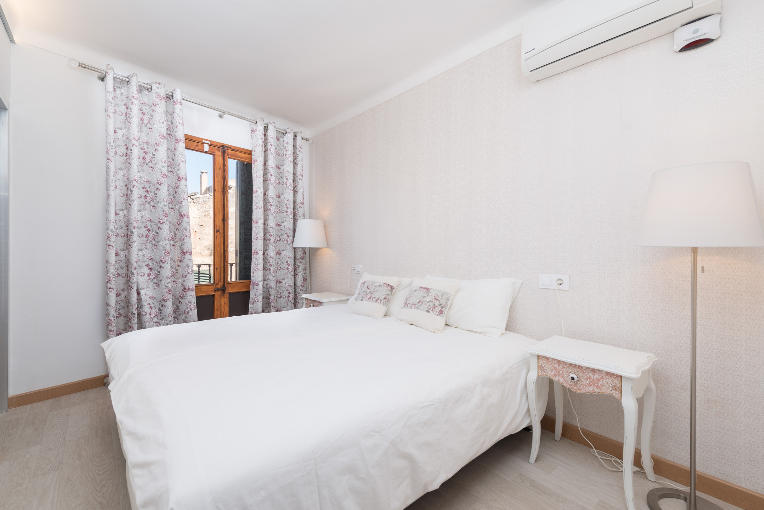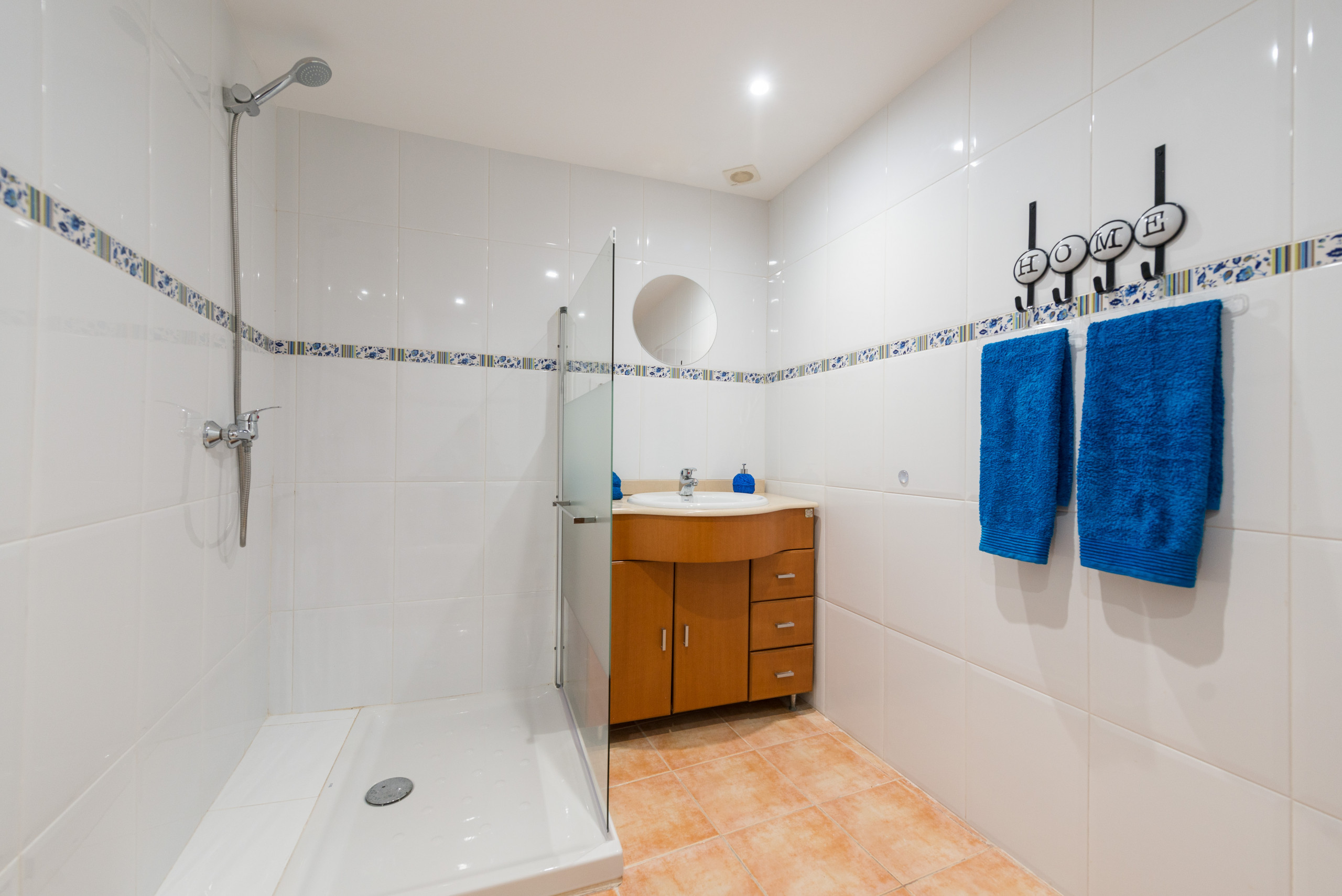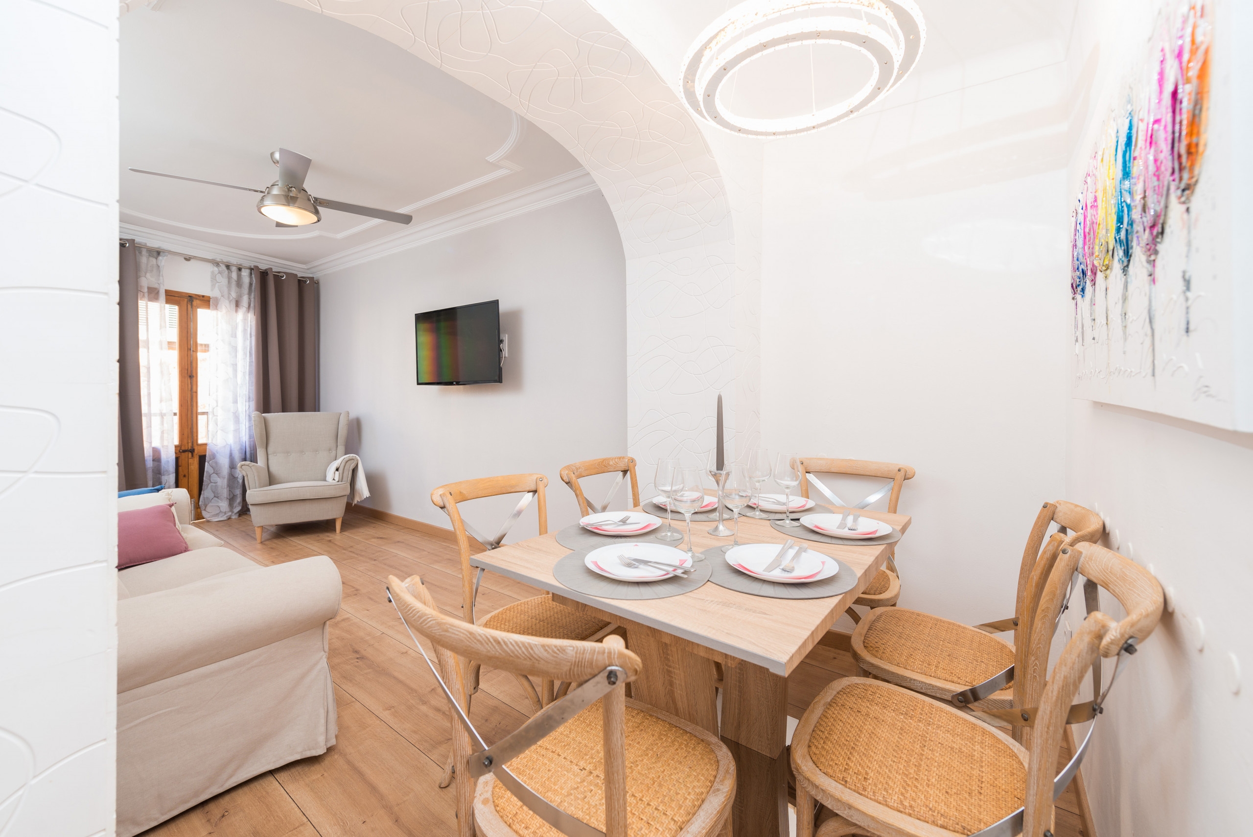 This two-floor apartment counts with 5 bedrooms and 2 bathrooms. We enter the first floor onto a spatious living and dining room, divided in 3 spaces: a seating area with a sofa and a balcony to the pedestrian street, a dining area with a large table for 6 and a living- and dining room with kitchenette, sofa, smart TV, typical majorcan rocking chairs and another dining table for 6. The fire place is only decorative (not for use). The whole accommodation is equipped with air conditioning (cold/heat function). The kitchenette counts with a dishwasher, an oven and all further necessary utensils to prepare a tastefull dinner for the whole group. The dining kitchen provides access to the patio, with a dining table for 6 , where you can enjoy the fresh air even on the warmest days. The hall surrounding the patio leads us from the dining kitchen to a bathroom with a shower tub and to two of the bedrooms: one with a double bed and one with a large twinbed (1,20m), both with a window to the luminous hallway and the patio.