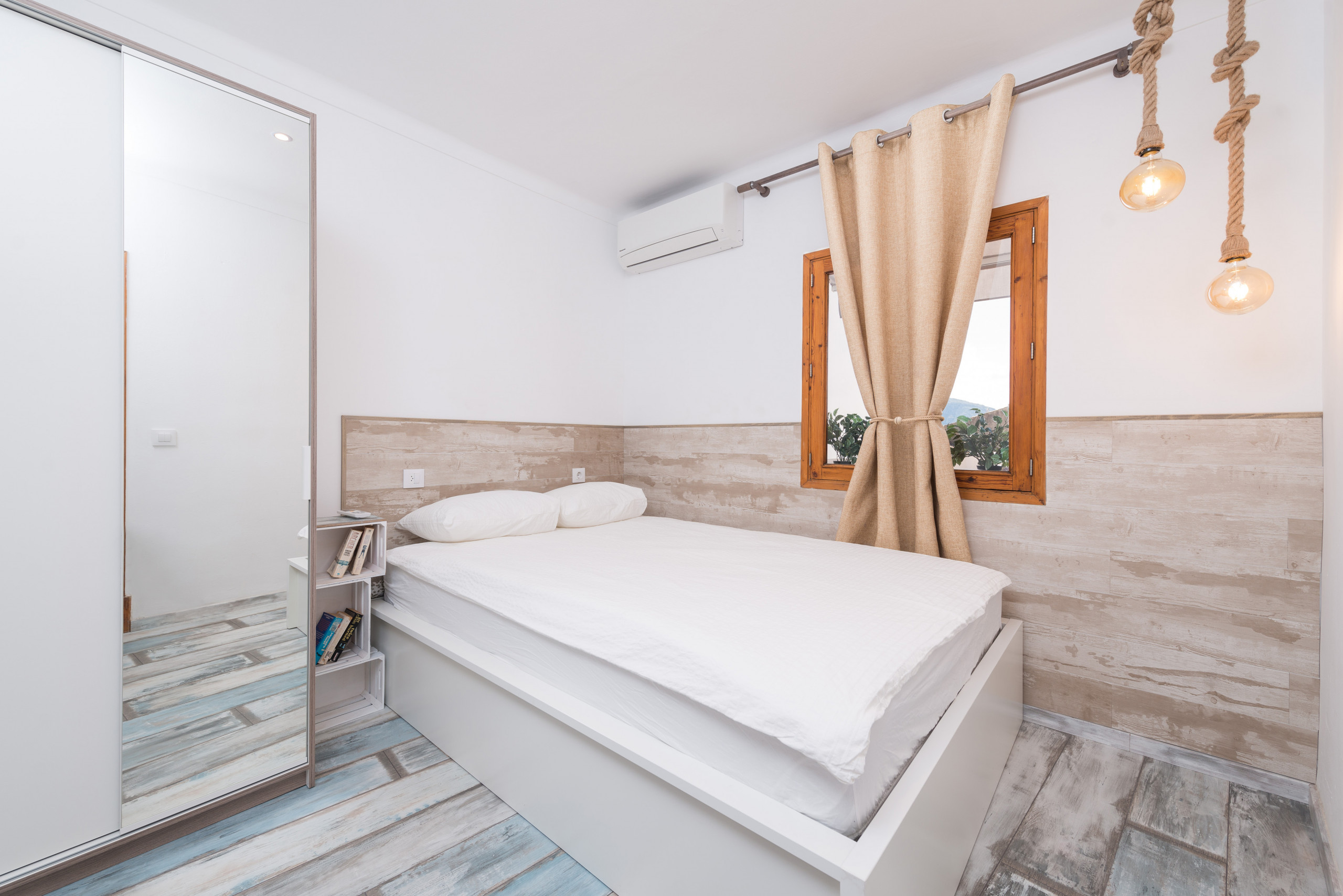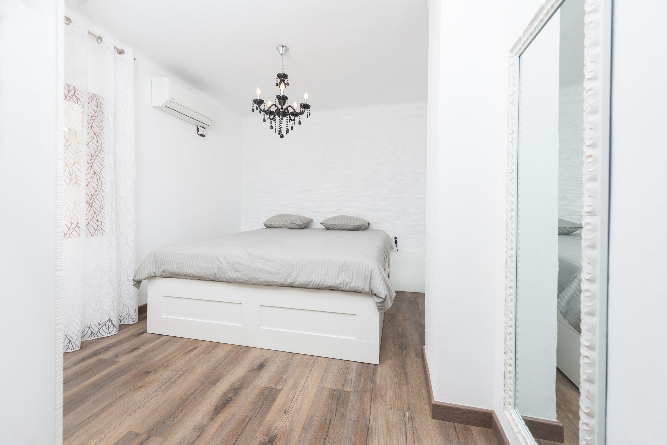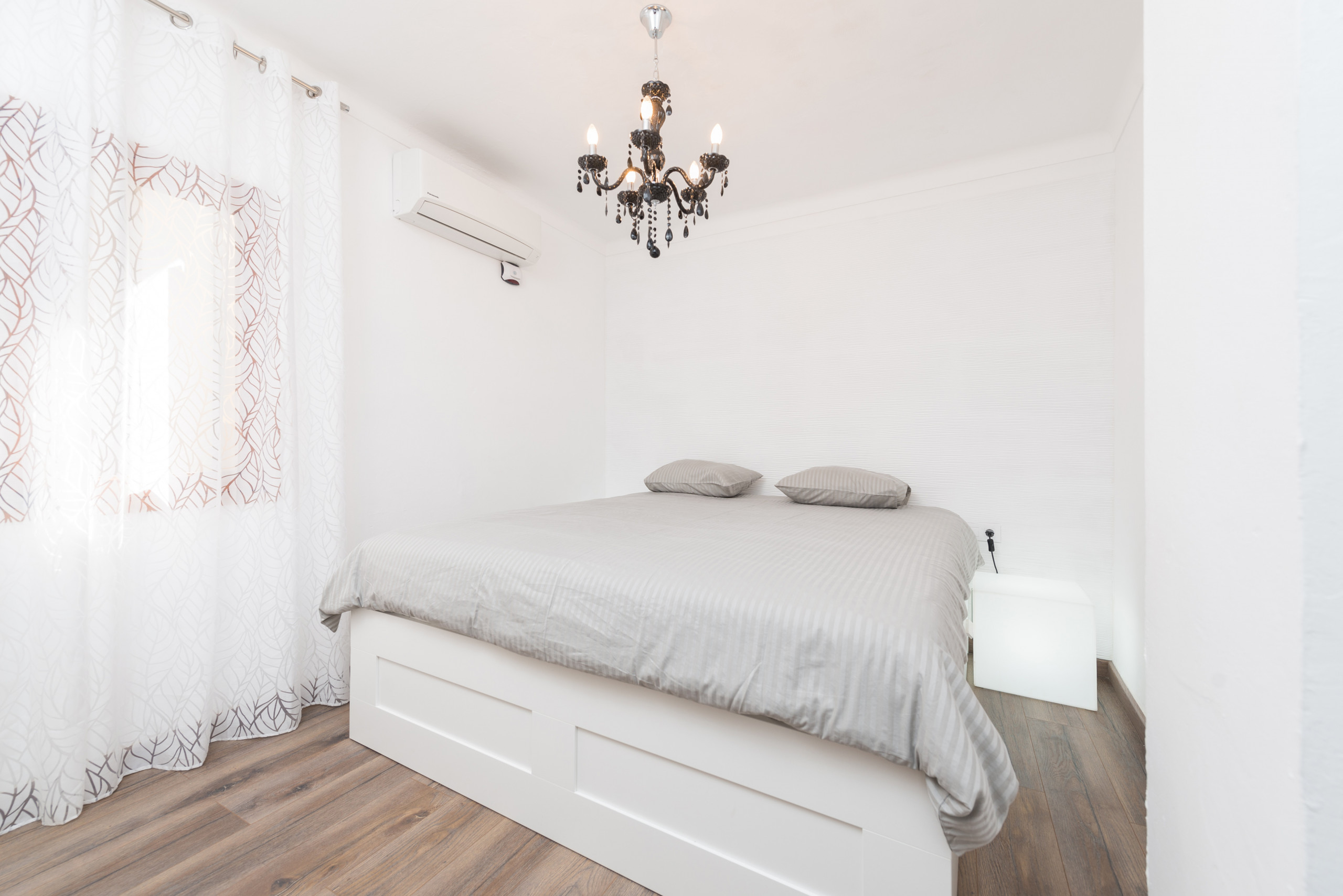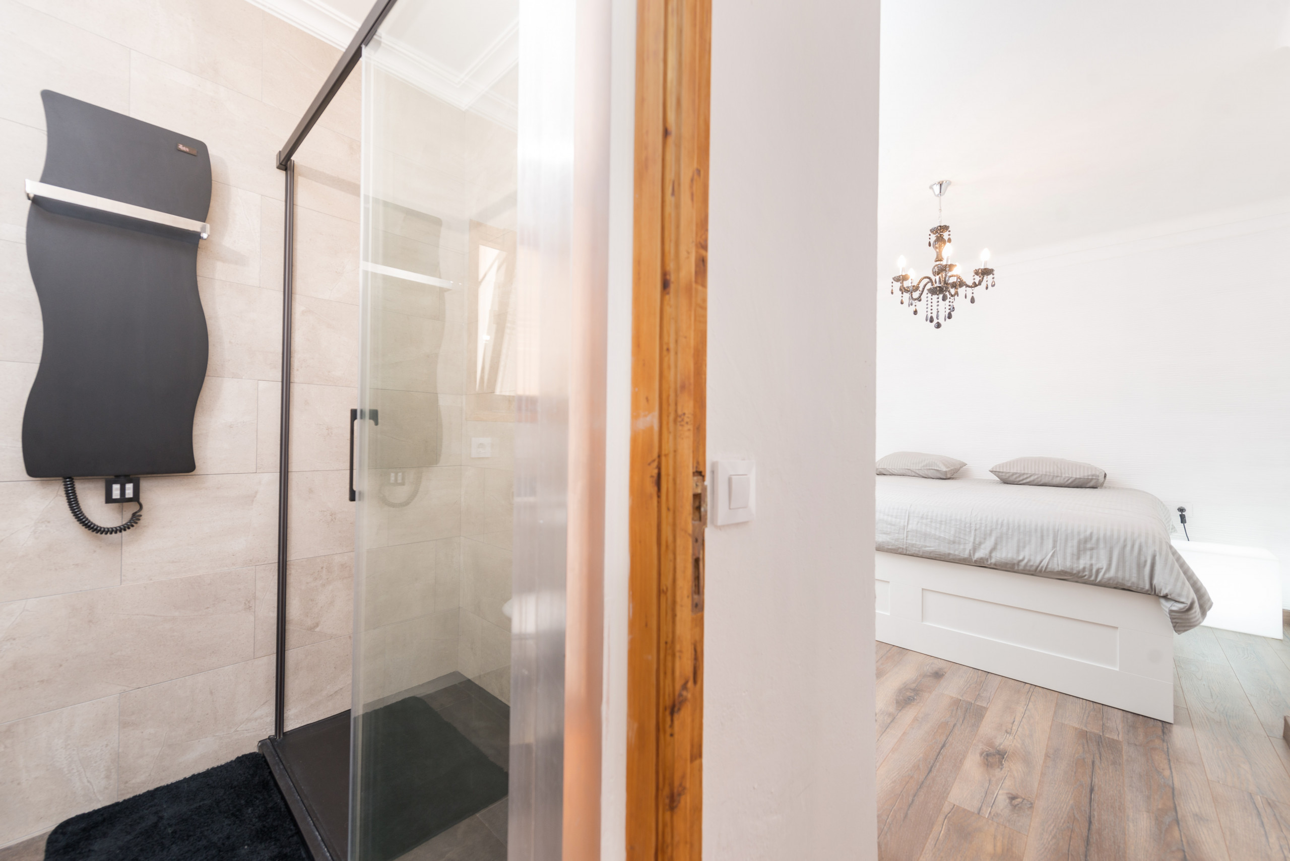 This two-floor apartment counts with 5 bedrooms and 2 bathrooms. We enter the first floor onto a spatious living and dining room, divided in 3 spaces: a seating area with a sofa and a balcony to the pedestrian street, a dining area with a large table for 6 and a living- and dining room with kitchenette, sofa, smart TV, typical majorcan rocking chairs and another dining table for 6. The fire place is only decorative (not for use). The whole accommodation is equipped with air conditioning (cold/heat function). The kitchenette counts with a dishwasher, an oven and all further necessary utensils to prepare a tastefull dinner for the whole group. The dining kitchen provides access to the patio, with a dining table for 6 , where you can enjoy the fresh air even on the warmest days. The hall surrounding the patio leads us from the dining kitchen to a bathroom with a shower tub and to two of the bedrooms: one with a double bed and one with a large twinbed (1,20m), both with a window to the luminous hallway and the patio.