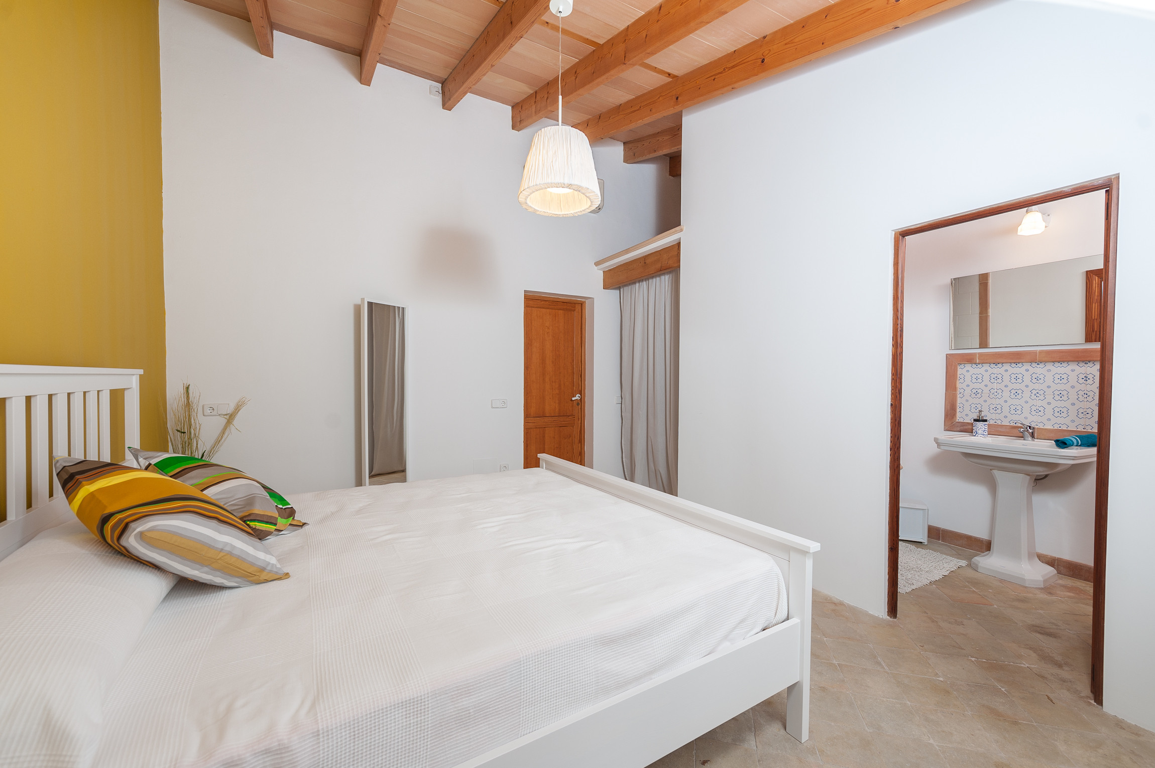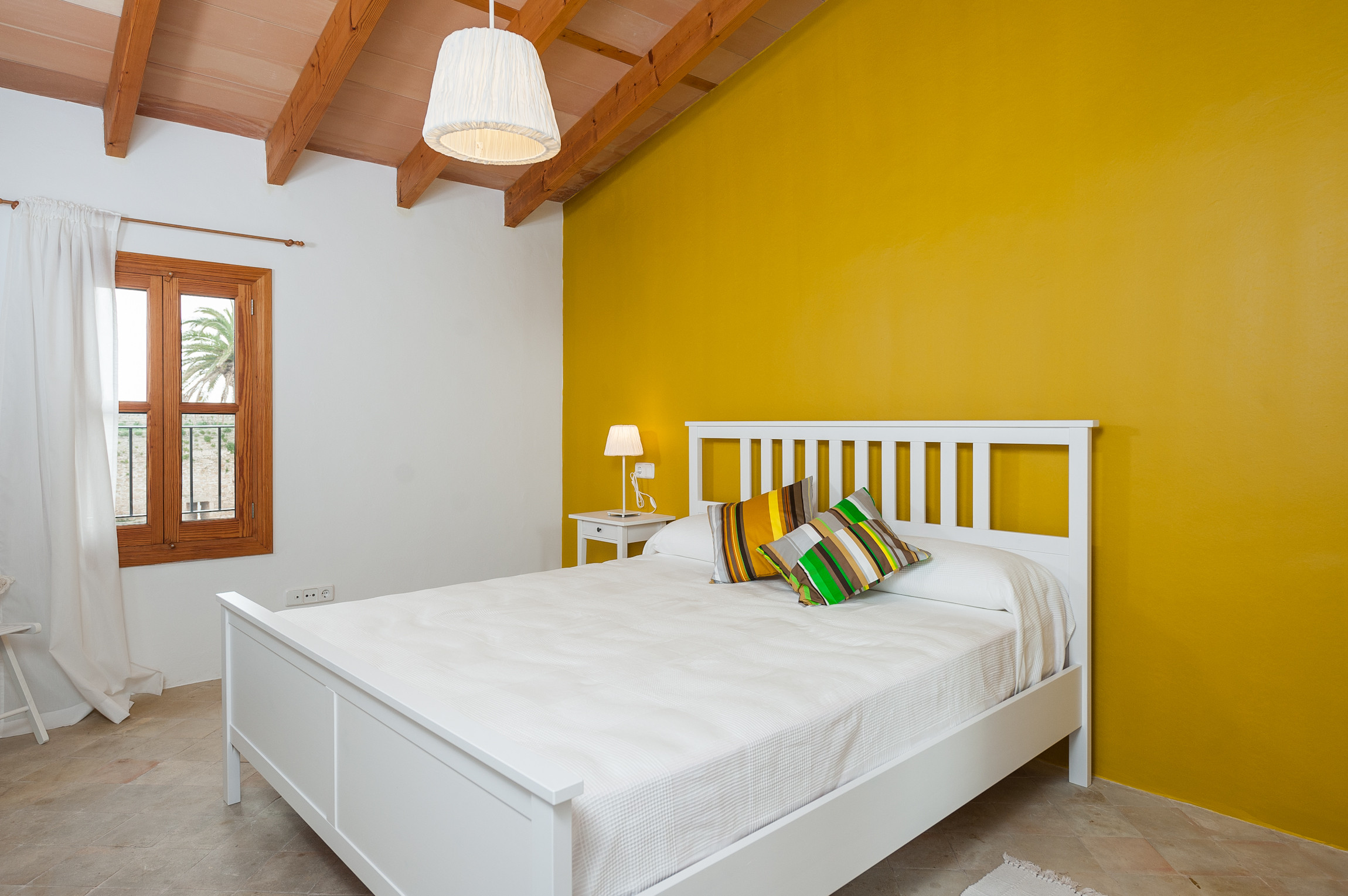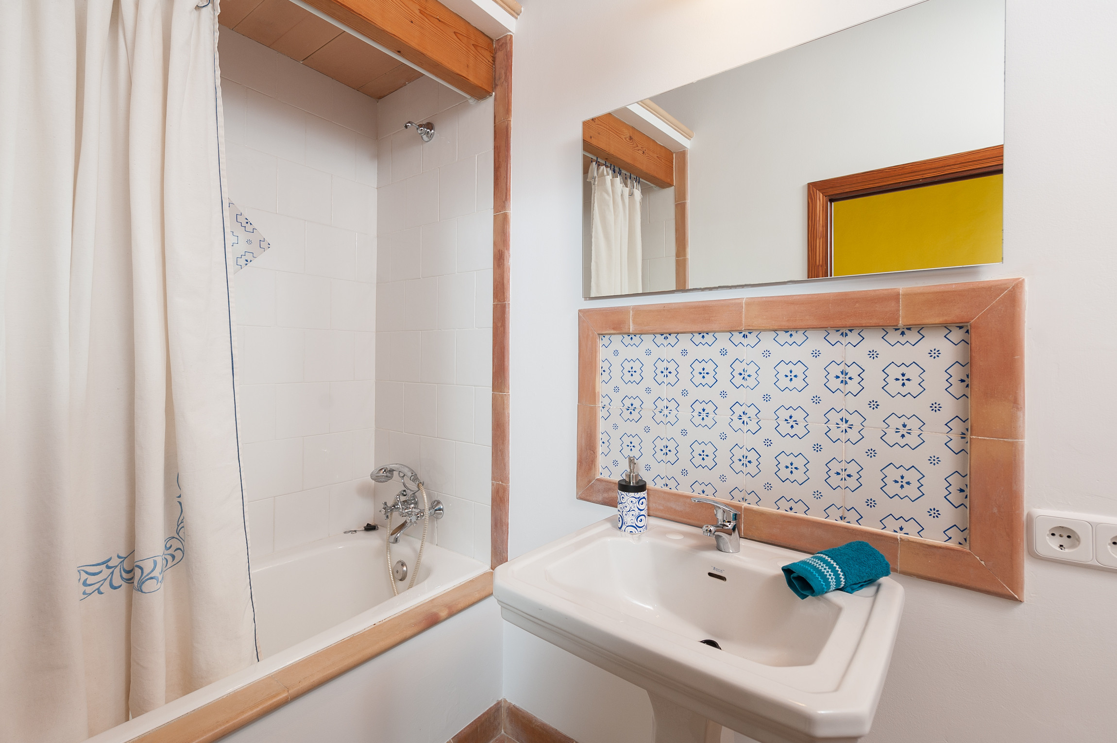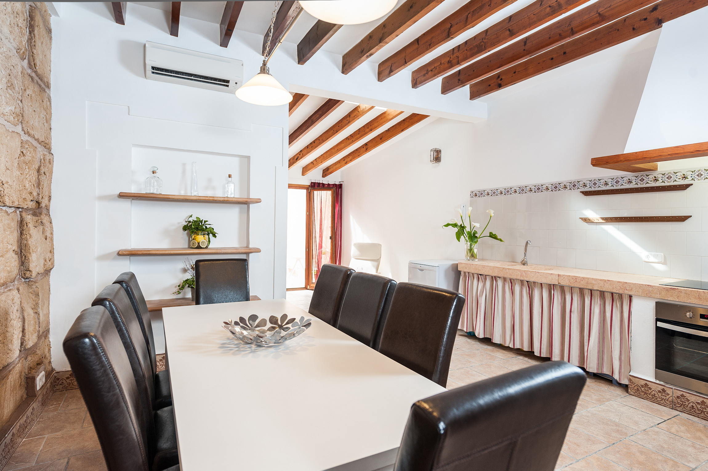 This two-floor apartment counts with 5 bedrooms and 2 bathrooms. We enter the first floor onto a spatious living and dining room, divided in 3 spaces: a seating area with a sofa and a balcony to the pedestrian street, a dining area with a large table for 6 and a living- and dining room with kitchenette, sofa, smart TV, typical majorcan rocking chairs and another dining table for 6. The fire place is only decorative (not for use). The whole accommodation is equipped with air conditioning (cold/heat function). The kitchenette counts with a dishwasher, an oven and all further necessary utensils to prepare a tastefull dinner for the whole group. The dining kitchen provides access to the patio, with a dining table for 6 , where you can enjoy the fresh air even on the warmest days. The hall surrounding the patio leads us from the dining kitchen to a bathroom with a shower tub and to two of the bedrooms: one with a double bed and one with a large twinbed (1,20m), both with a window to the luminous hallway and the patio.
