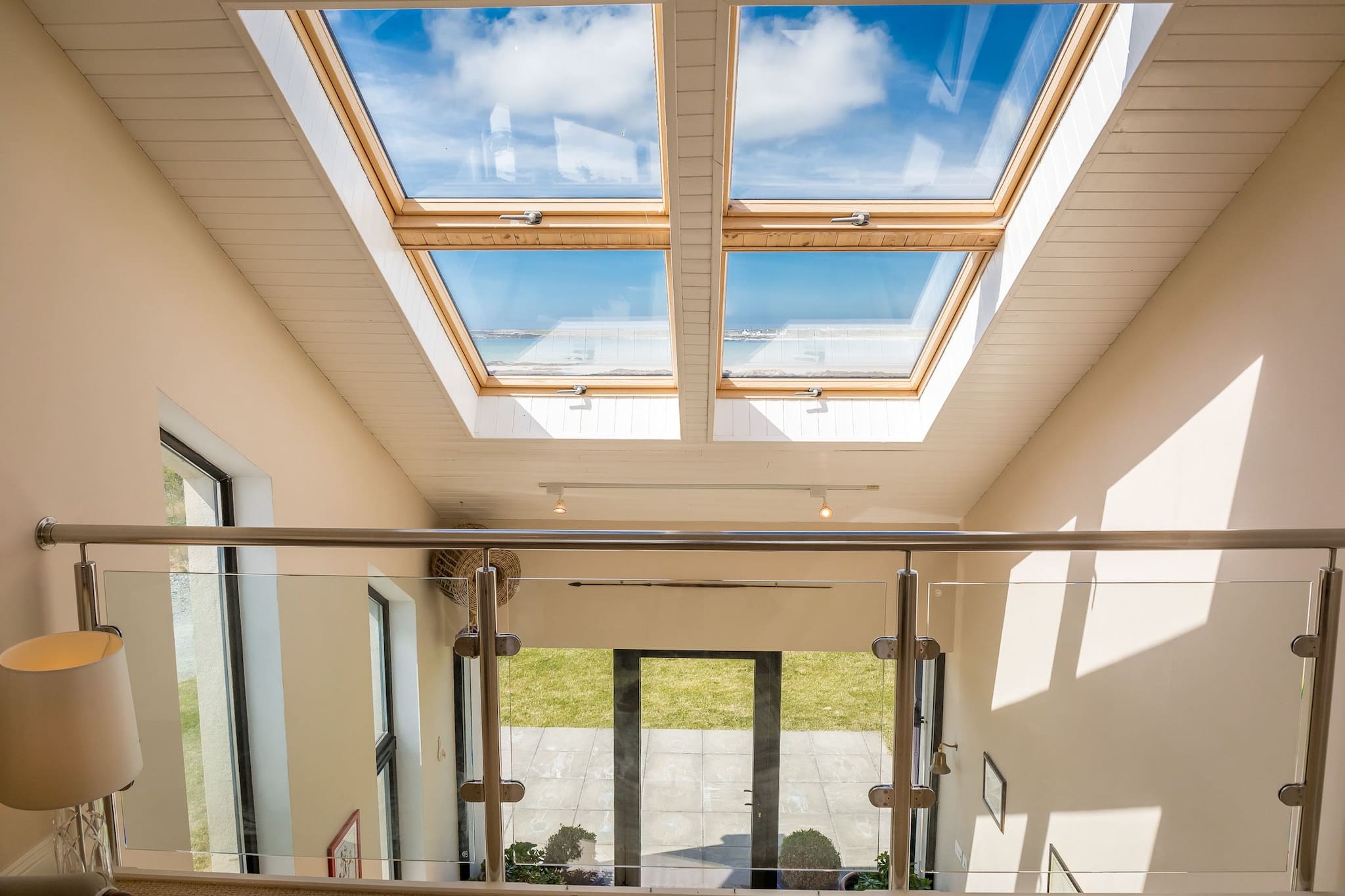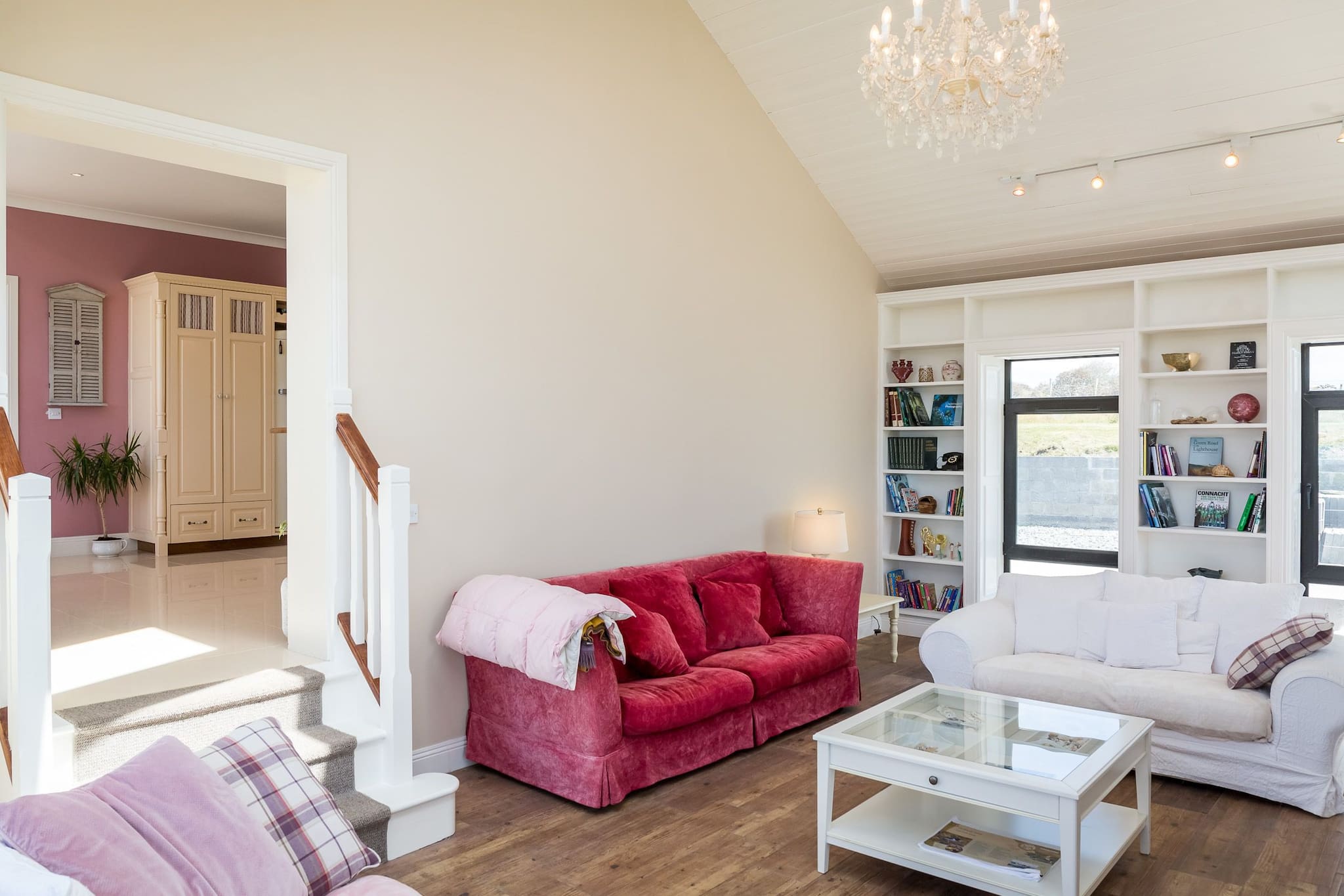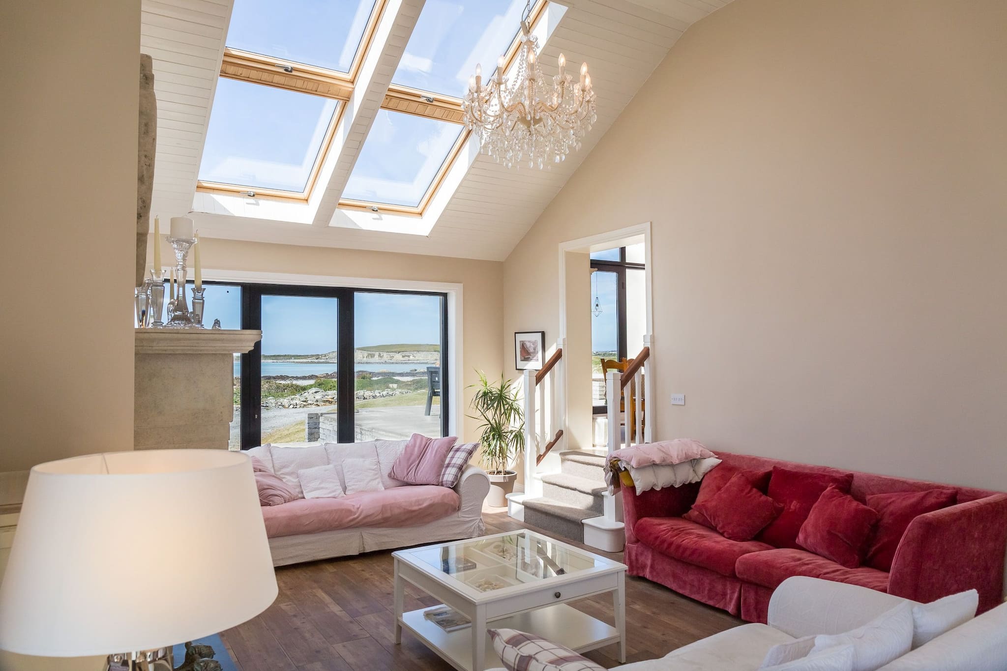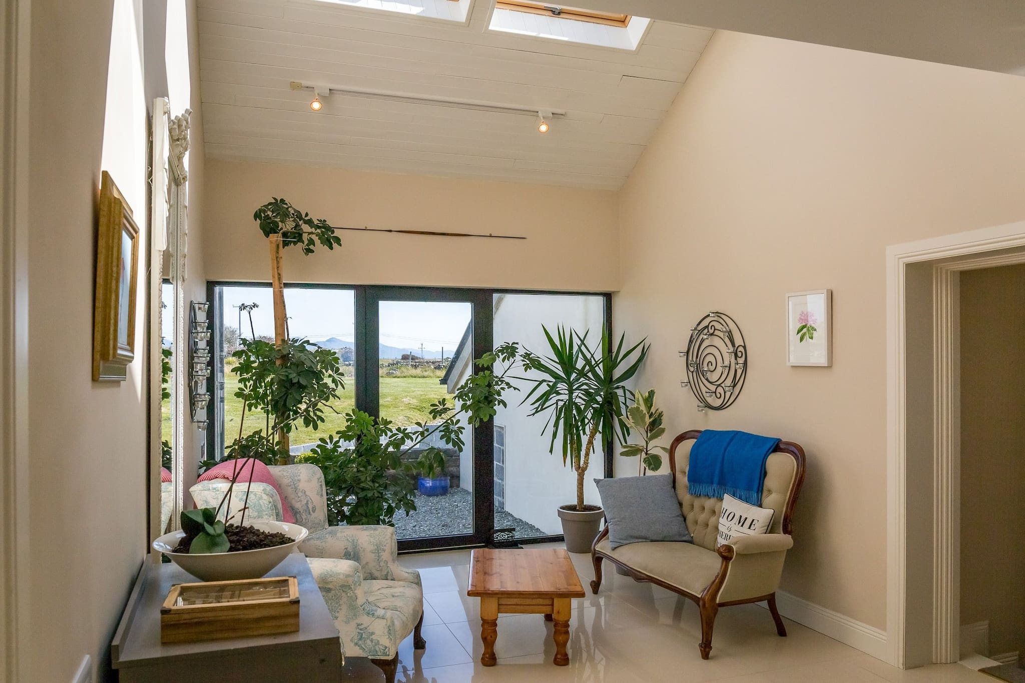 3 steps lead upto an impressive and very bright hallway with a large picture, and Velux windows, tiled flooring, large windows on either side of the hallway with sea and mountain views, there are couches and armchairs to relax in after a fun-filled day touring Connemara. There are doors leading to the front & back patio areas. Integrated hoover socket.