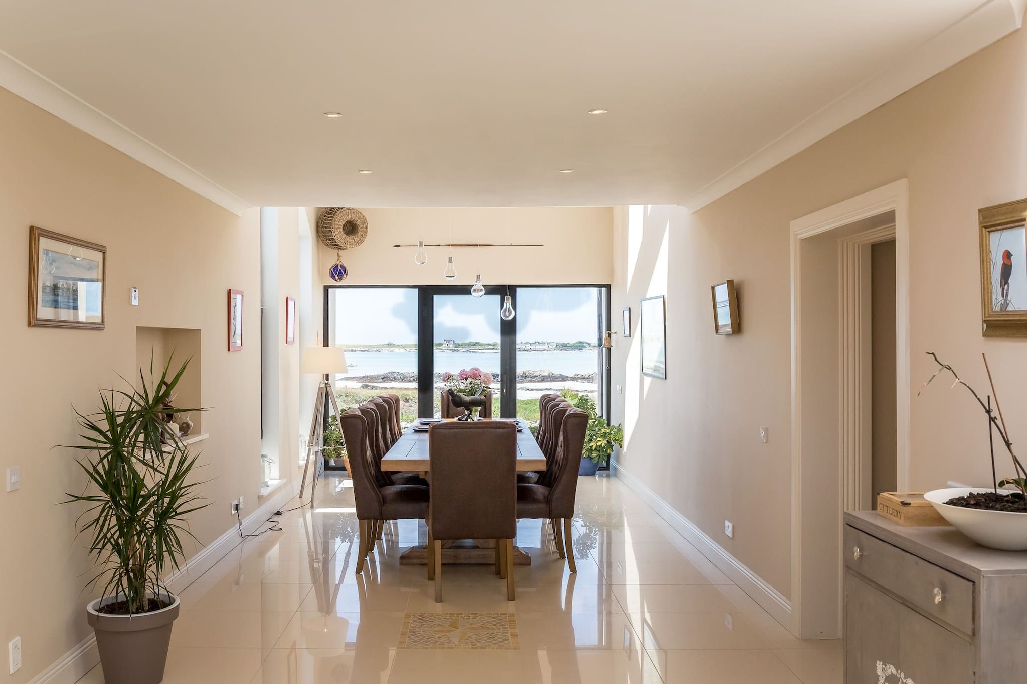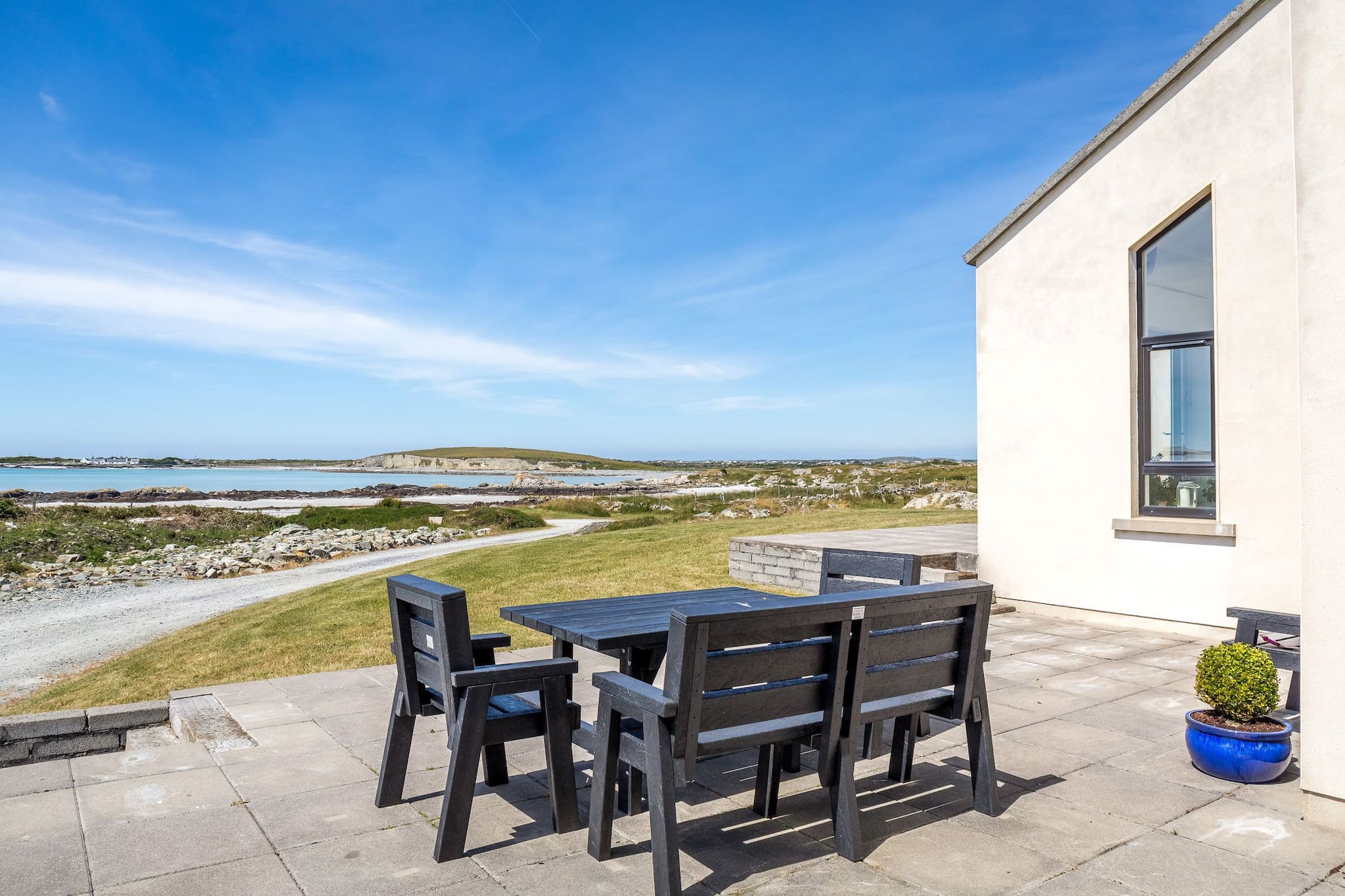 The door from the kitchen, sitting room 2 and the left wing area has access to the front of the house where you can walk down a couple of steps directly onto the beach. There is a small garden area and a paved patio where there is seating to lounge and enjoy the vista.