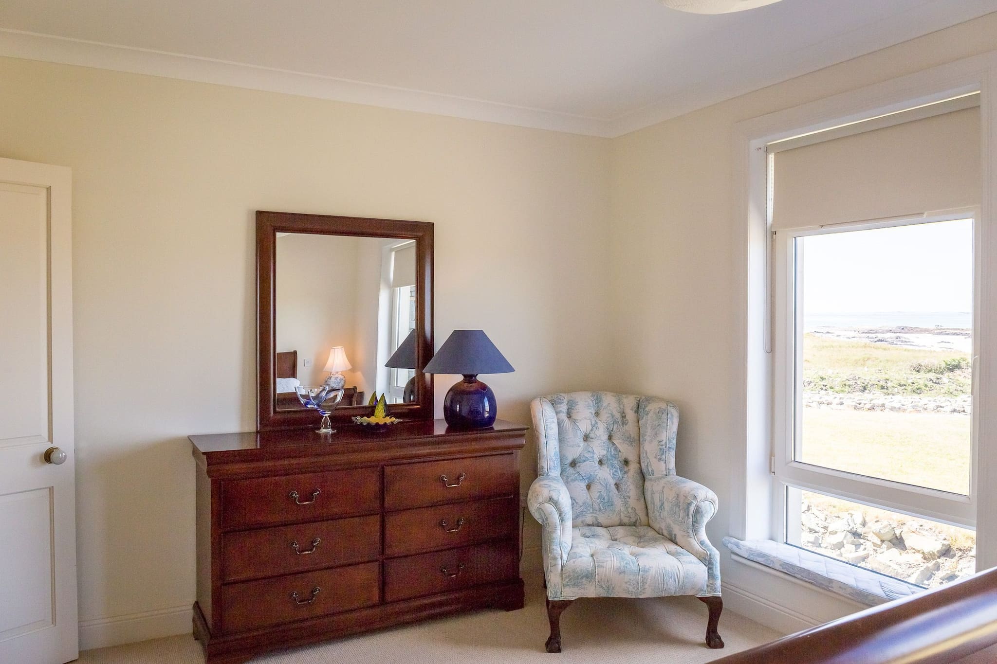 Bedroom 1: Double bedroom with 2 large windows with sea views, carpeted, superking size bed, fitted wardrobe, armchair.
