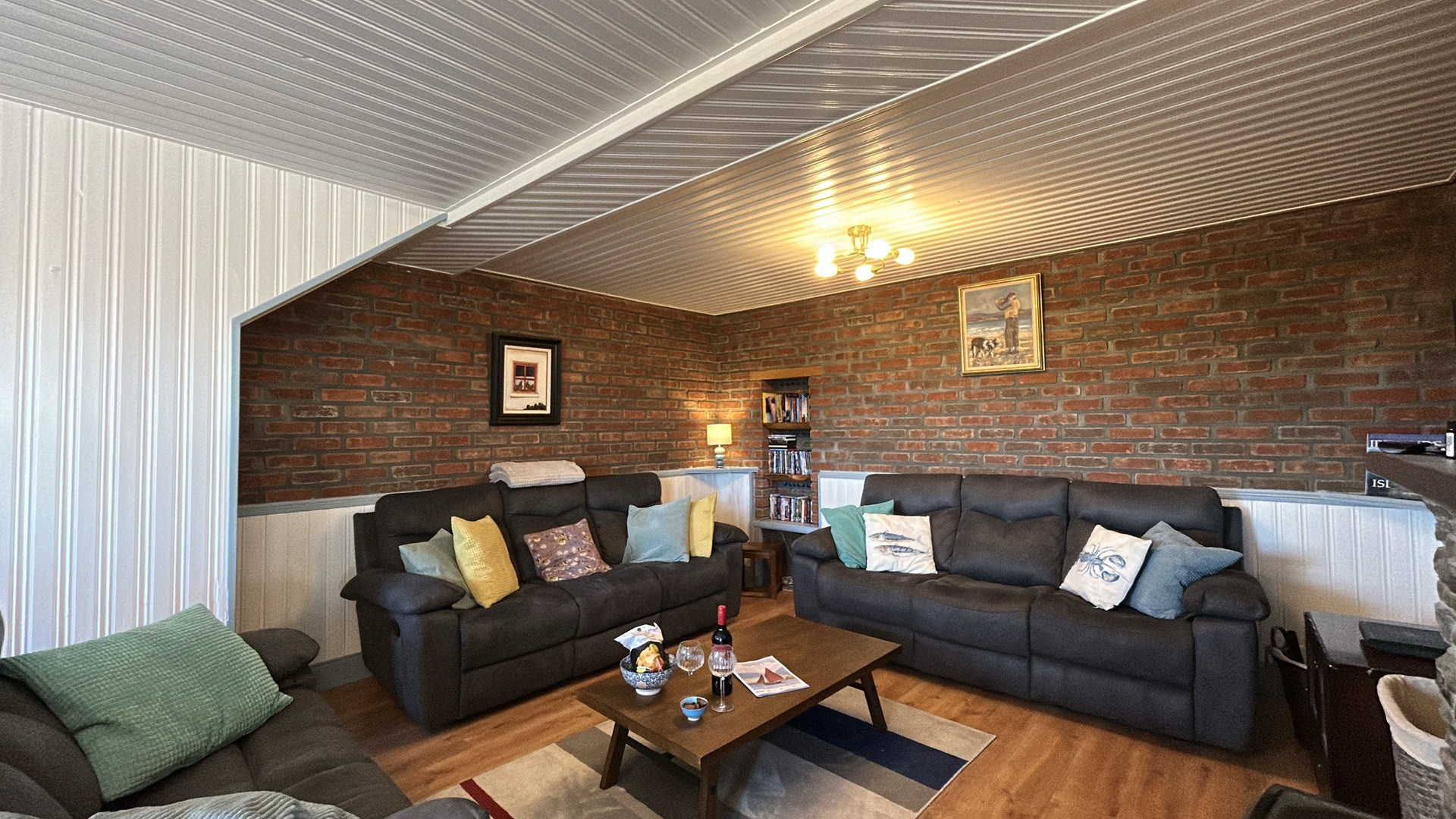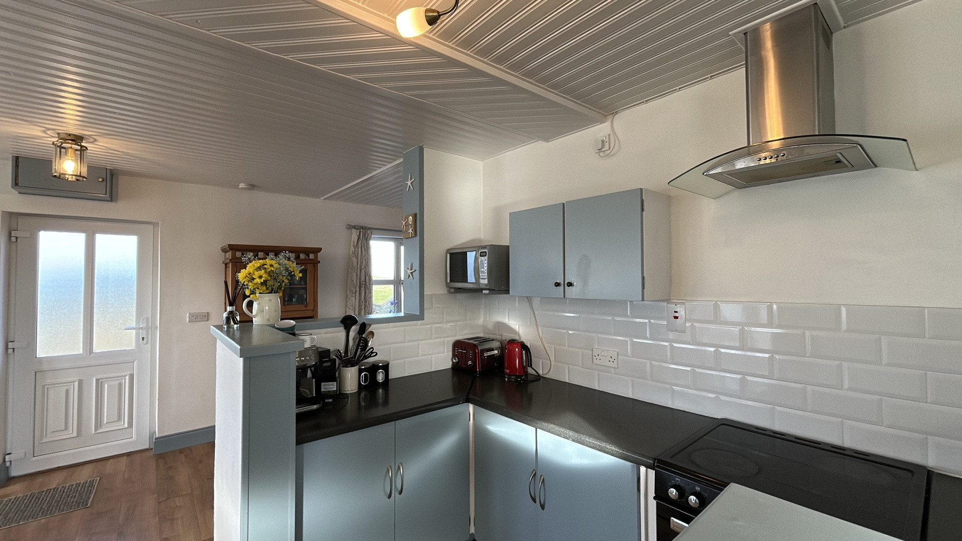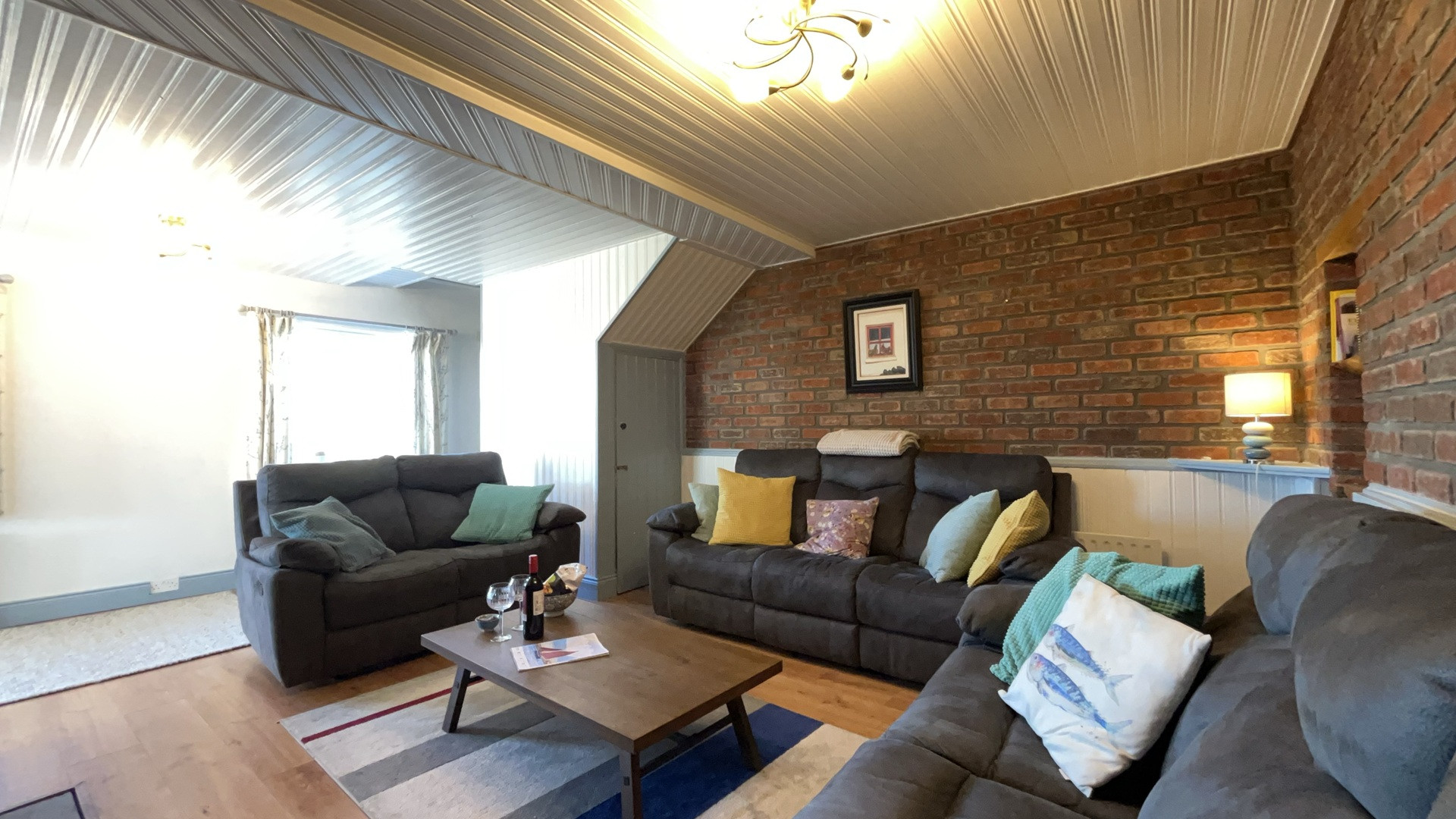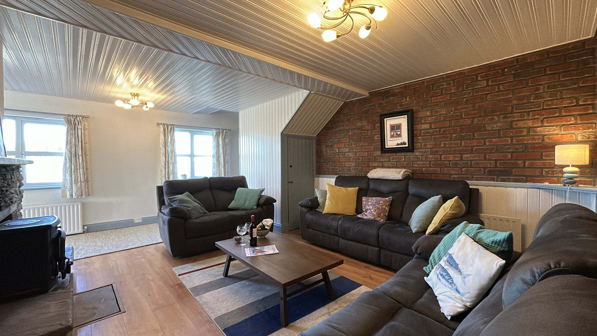 Both cottages are finished to the highest standard. The main living areas ooze natural light streaming in from the windows, patio doors and Velux skylights. The sitting room area in the white cottage has a large comfy sofa and two matching armchairs, a flat flat-screen Smart TV with Netflix and an open fireplace.