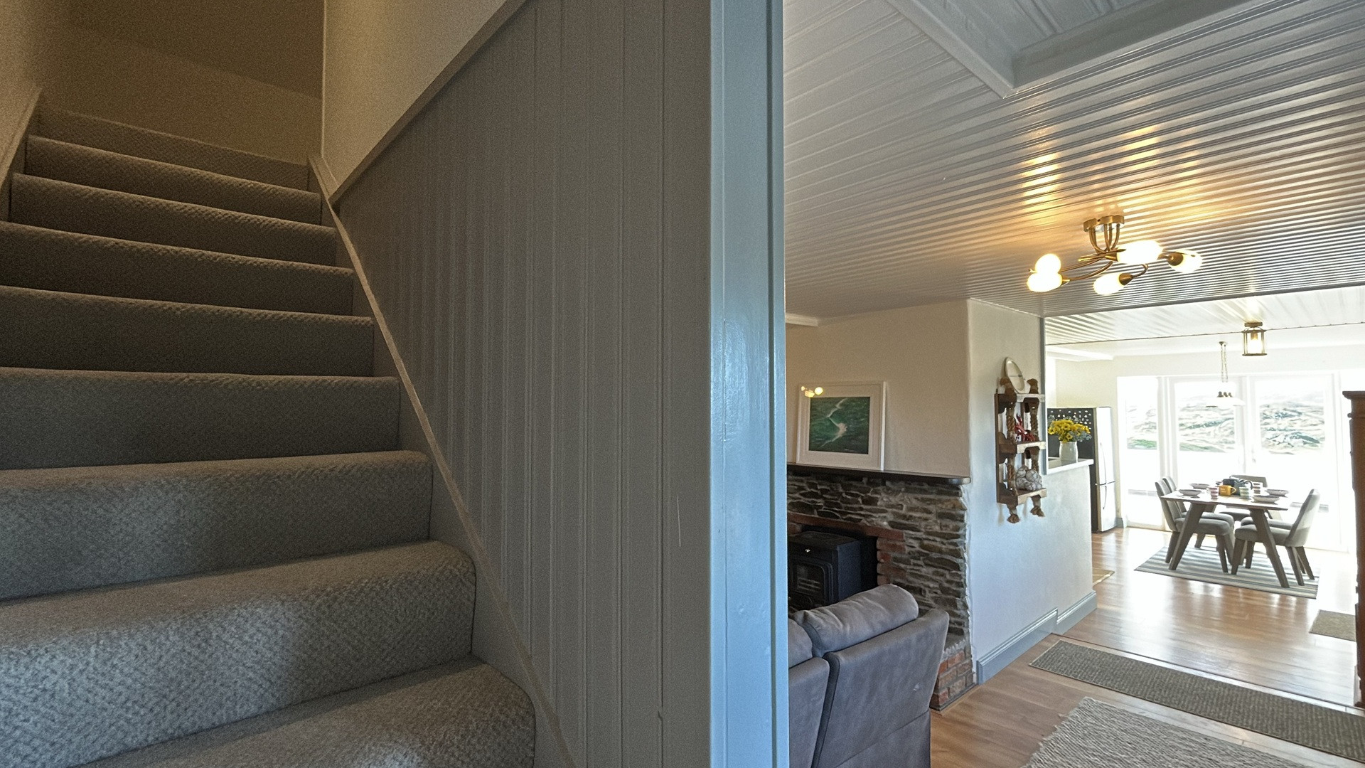 The house is laid out with an open-plan kitchen, dining and living area, creating a lovely sense of flow and light throughout the main living space. While open plan, the living room area remains cosy and comfortable, perfect for unwinding after a day at the beach whether that’s curling up with a book, enjoying family movie nights or simply relaxing by the fire.