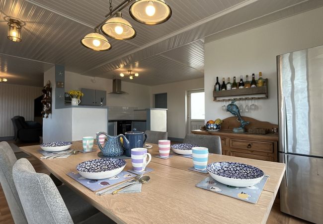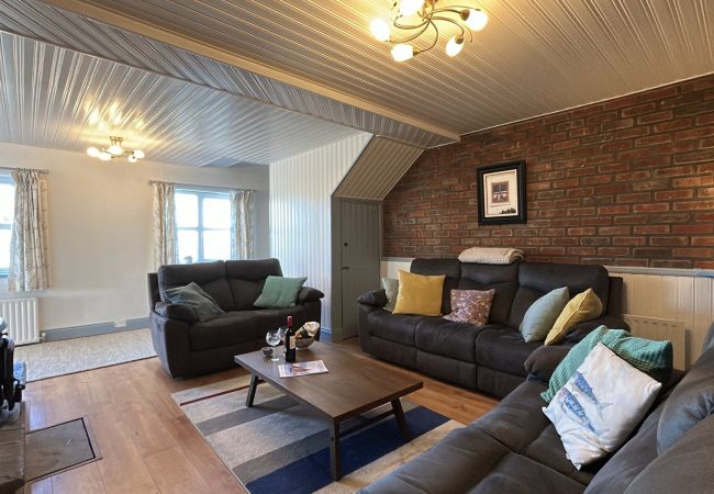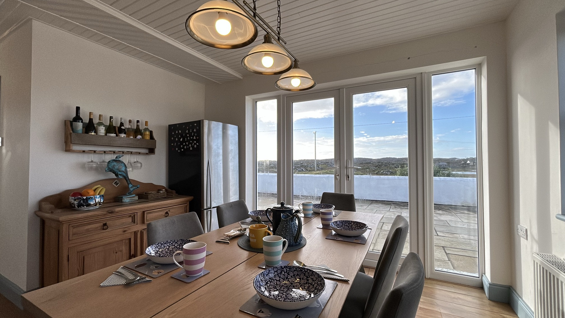 The dining area has another sofa with the large dining table comfortably seating up to 8 guests-the perfect place to relax and soak up the stunning countryside & sea views. There are double doors leading out onto the large patio area with BBQ, table & chairs, perfect for dining Al fresco or enjoying a glass of wine watching the sunset.